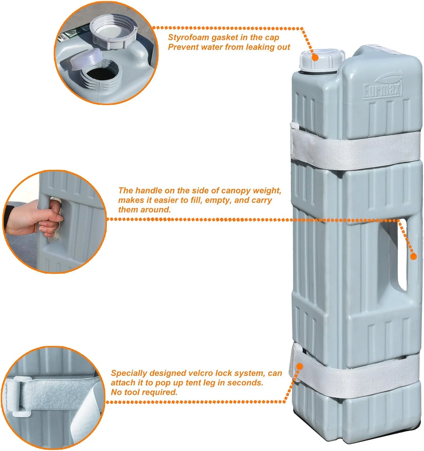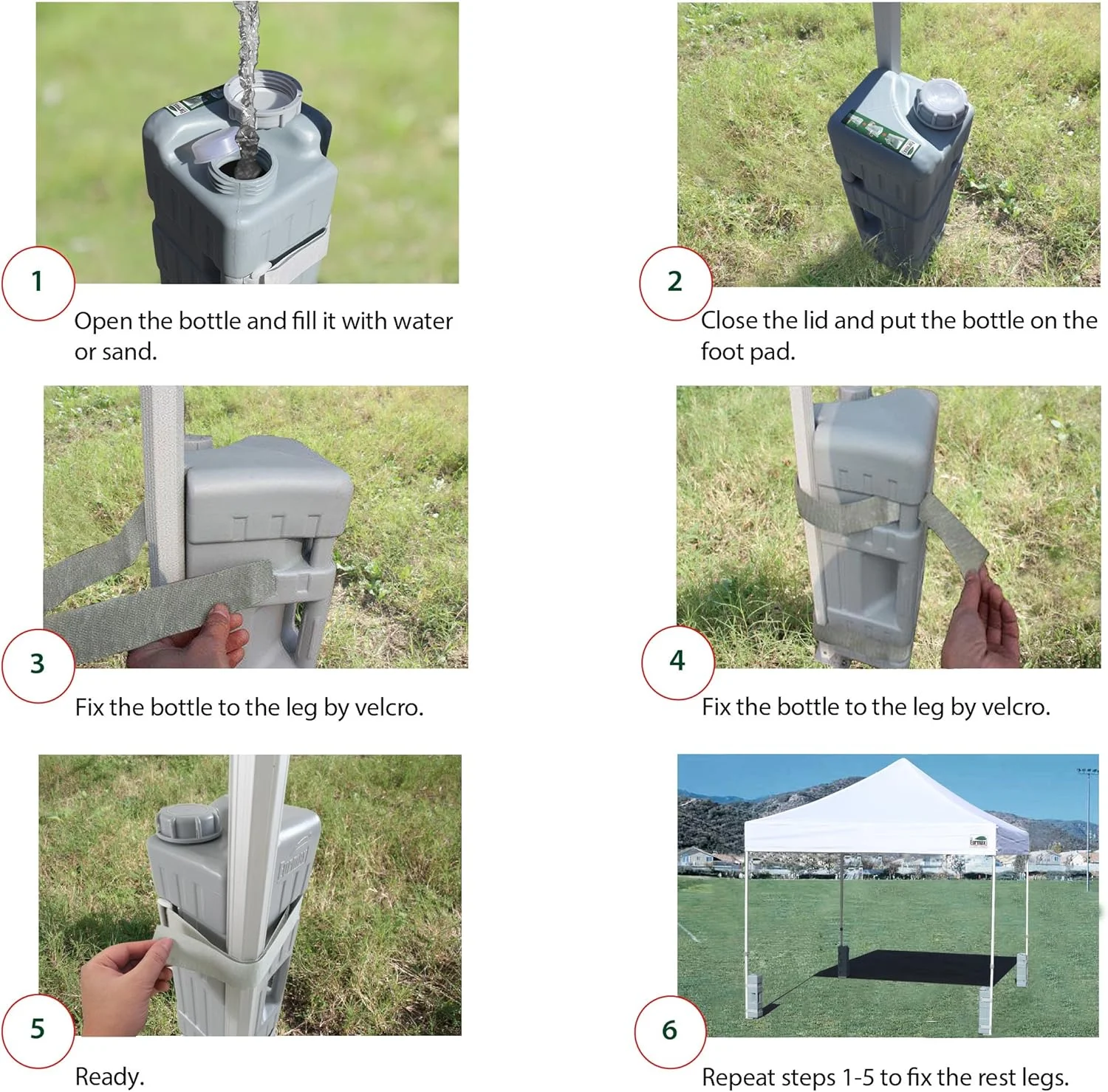 - Fill with Various Materials: These weights offer exceptional versatility, allowing you to fill them with water, sand, gravel, pebbles, snow, or any available materials for added stability.Tailor the weight of your canopy as needed, making it suitable for various shelter sizes and environmental factors.