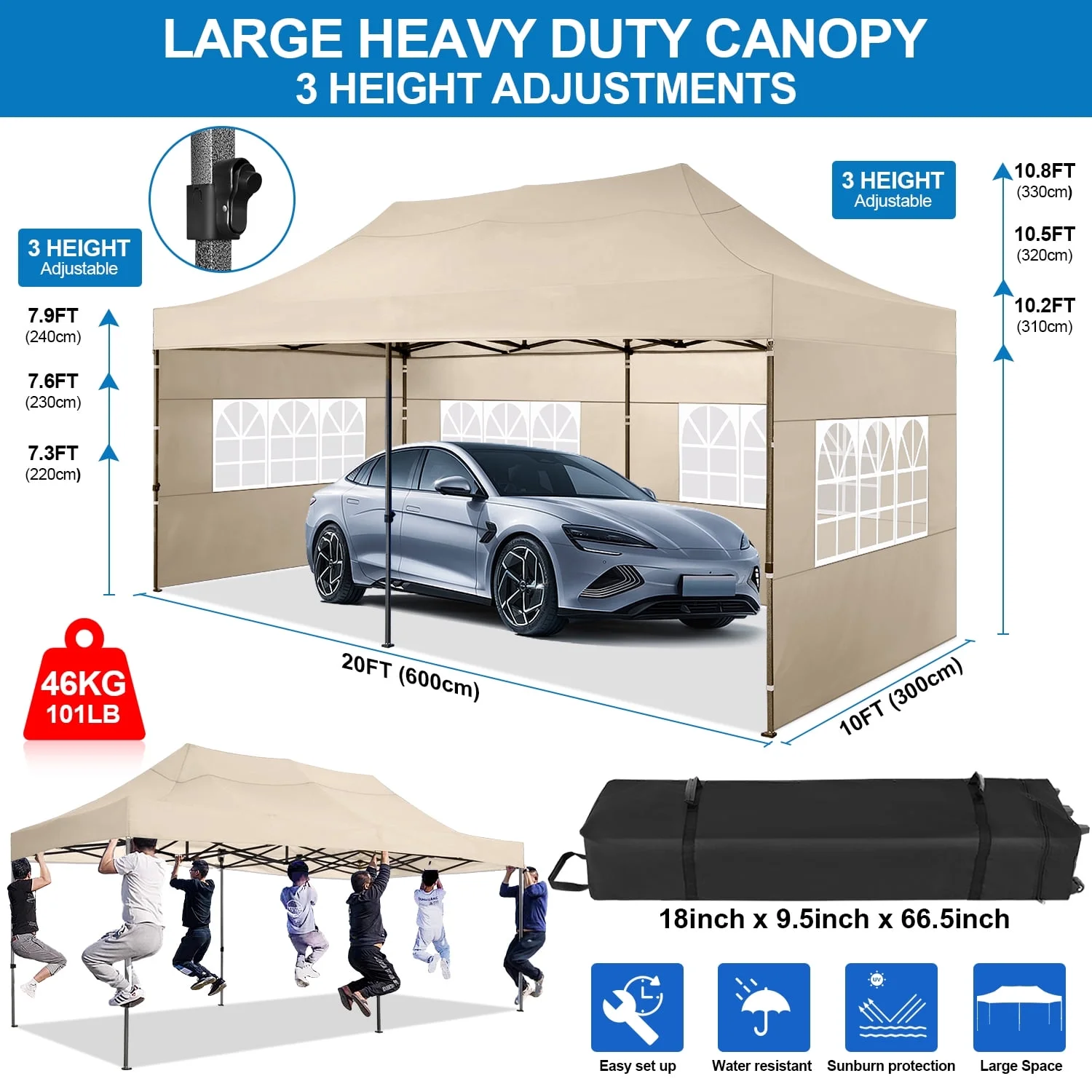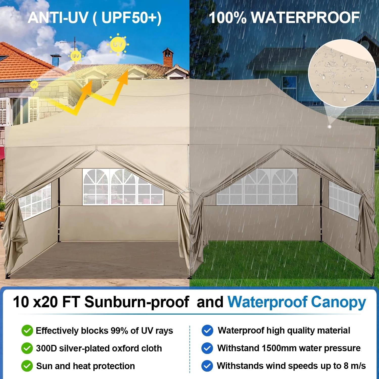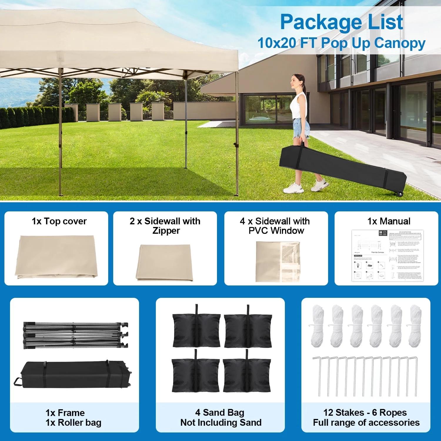 10'X20' Pop up Canopy Waterproof Folding Tent Outdoor Easy Set - up Instant Tent Heavy Duty Commercial Wedding Party Shelter with 6 Removable Sidewalls, 4 Sandbags, Roller Bag, Khaki