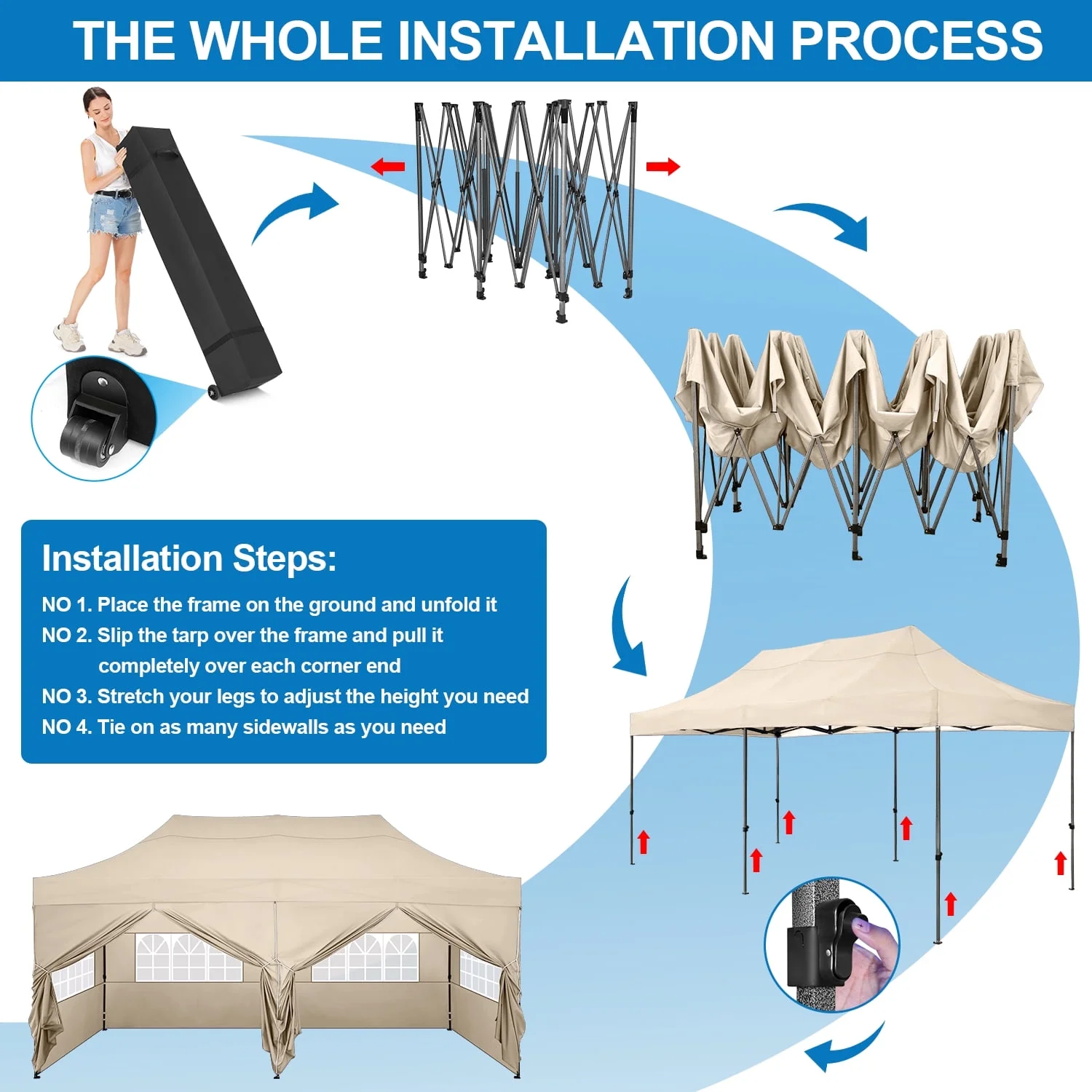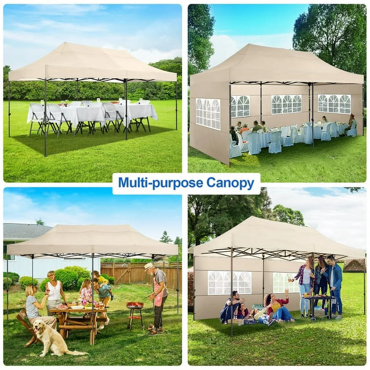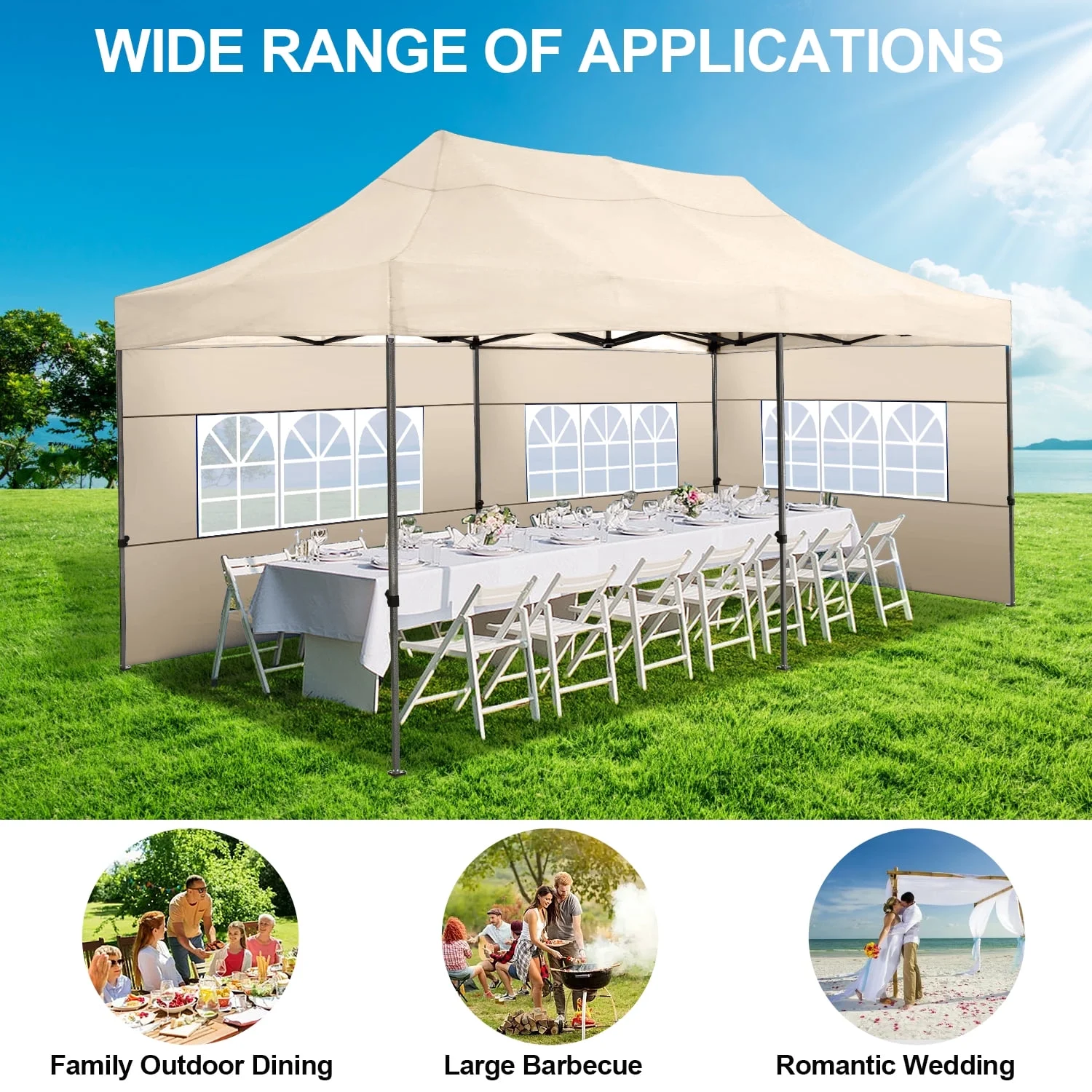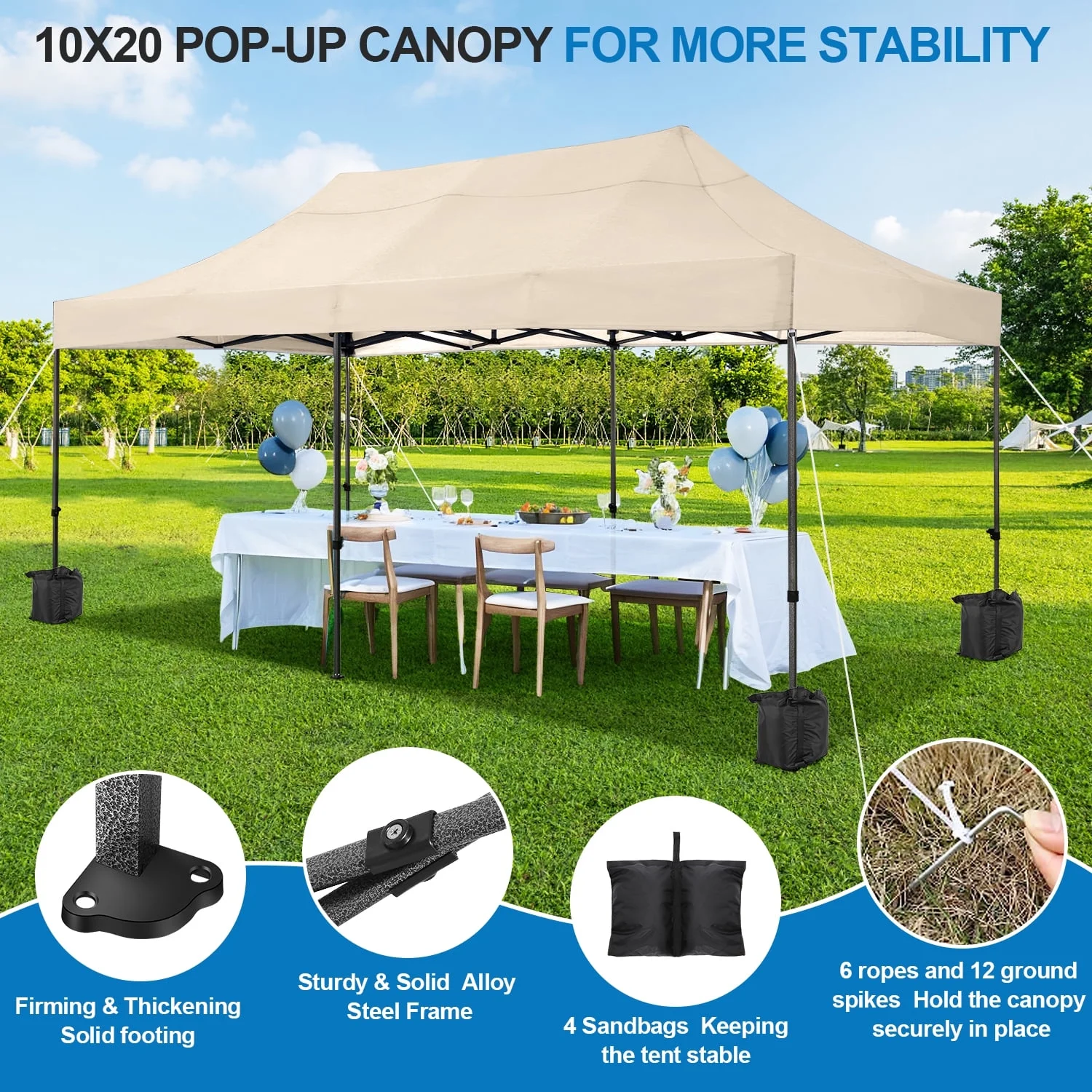 10'X20' Pop up Canopy Waterproof Folding Tent Outdoor Easy Set - up Instant Tent Heavy Duty Commercial Wedding Party Shelter with 6 Removable Sidewalls, 4 Sandbags, Roller Bag, Khaki
