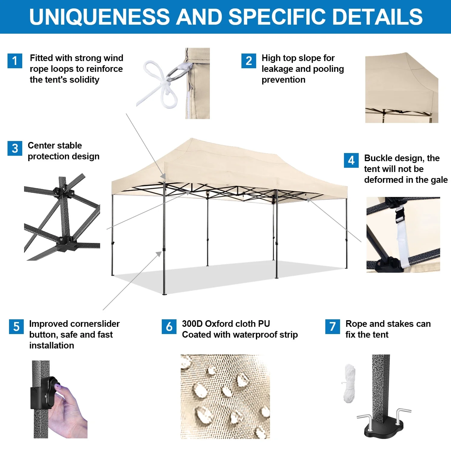No matter the season, a pop-up canopy is always the best choice for outdoor events. Our 10 x 20 feet outdoor beach instant tent can provide a large enough space to move around outdoors again while consisting of a steel canopy frame, waterproof and sunproof Oxford fabric, 6 removable sidewalls, 4 sandbags and stakes, and tent ropes, all of which can be packed into a roller bag for easy portability or storage in the trunk. This heavy-duty instant tent is suitable for many scenarios, such as family dinners, wedding parties, commercial stalls, and so on, come and buy our cost-effective outdoor pop-up canopy!