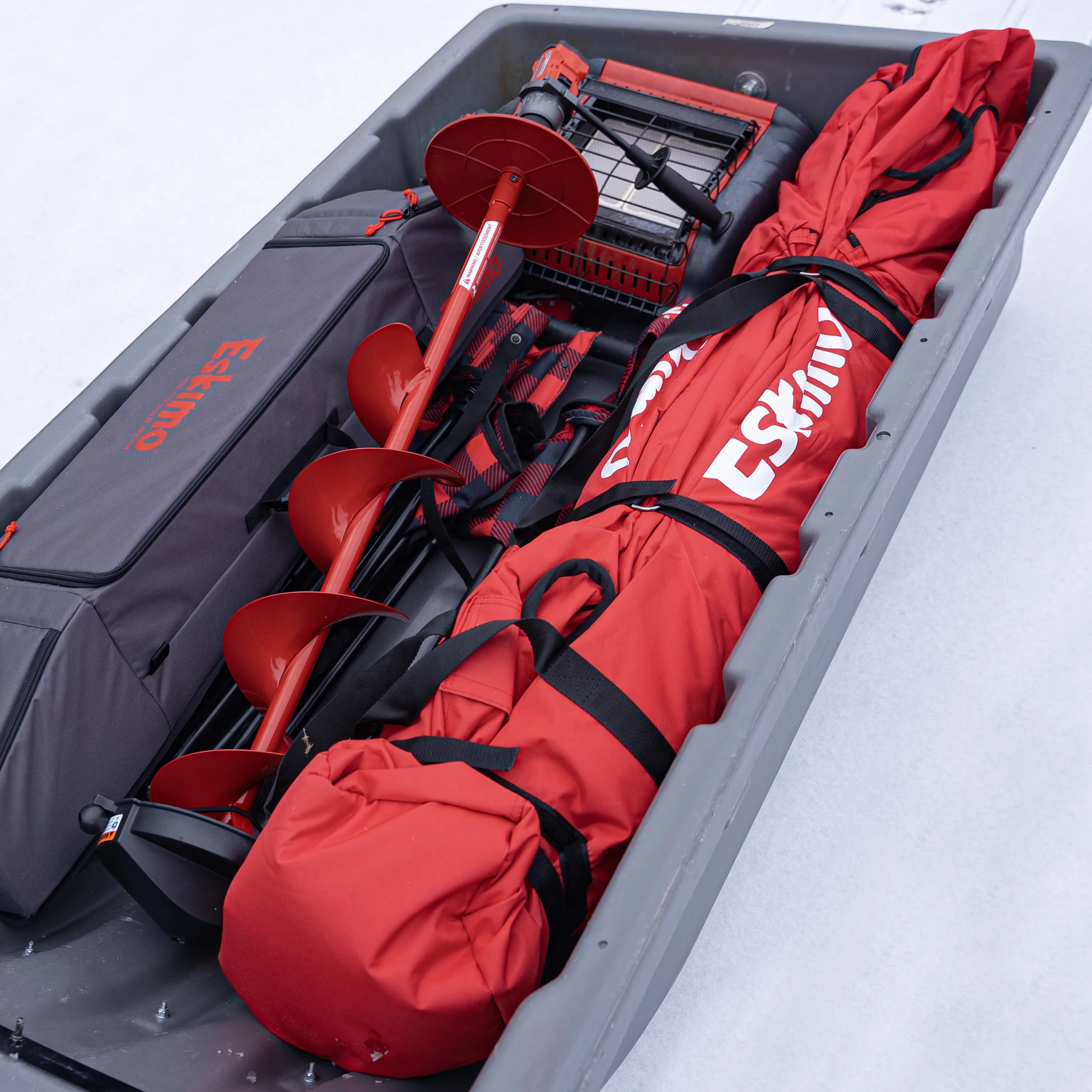 - DELUXE TIE DOWNS – Includes nine (9) ice anchors and four (4) deluxe cam straps to secure each in-skirt grommet and hub of the shelter.
