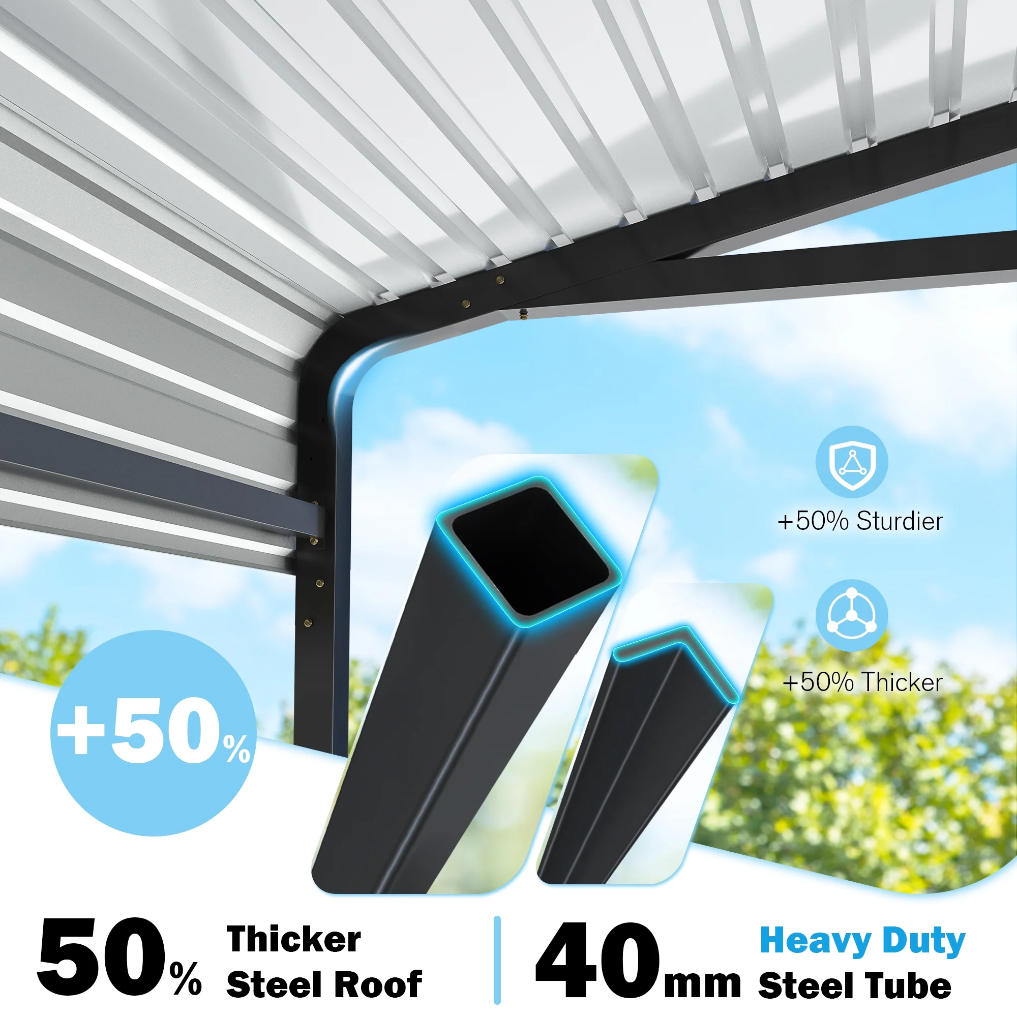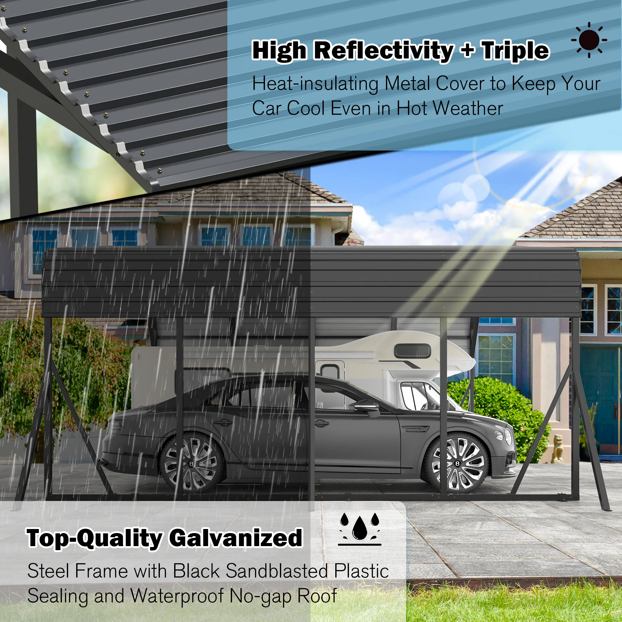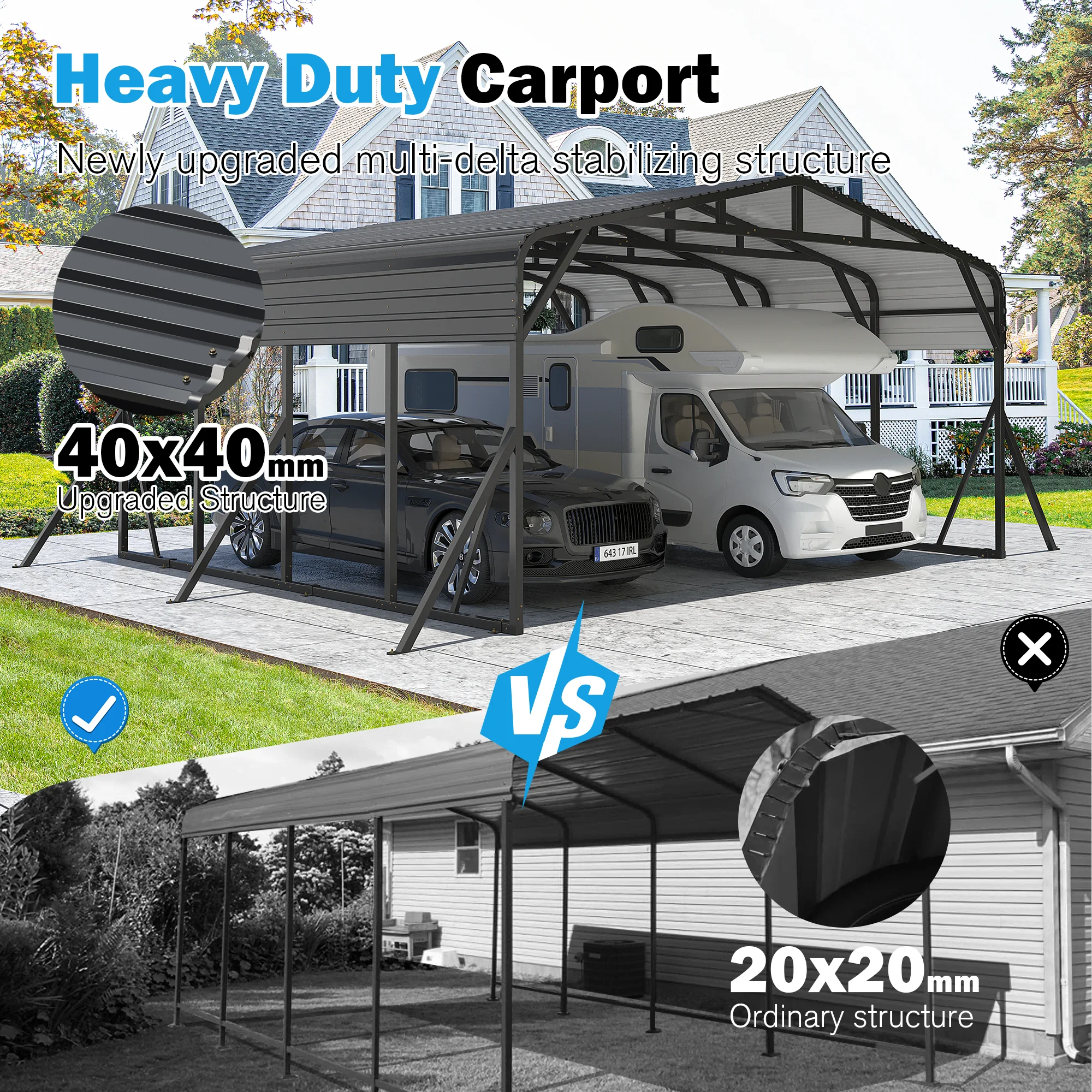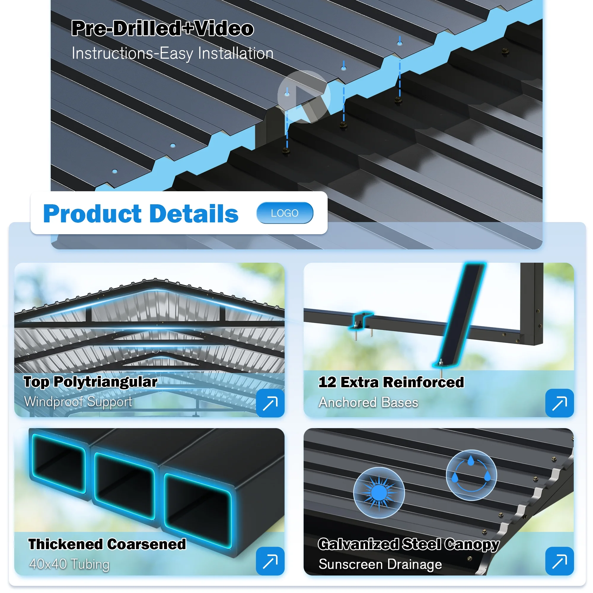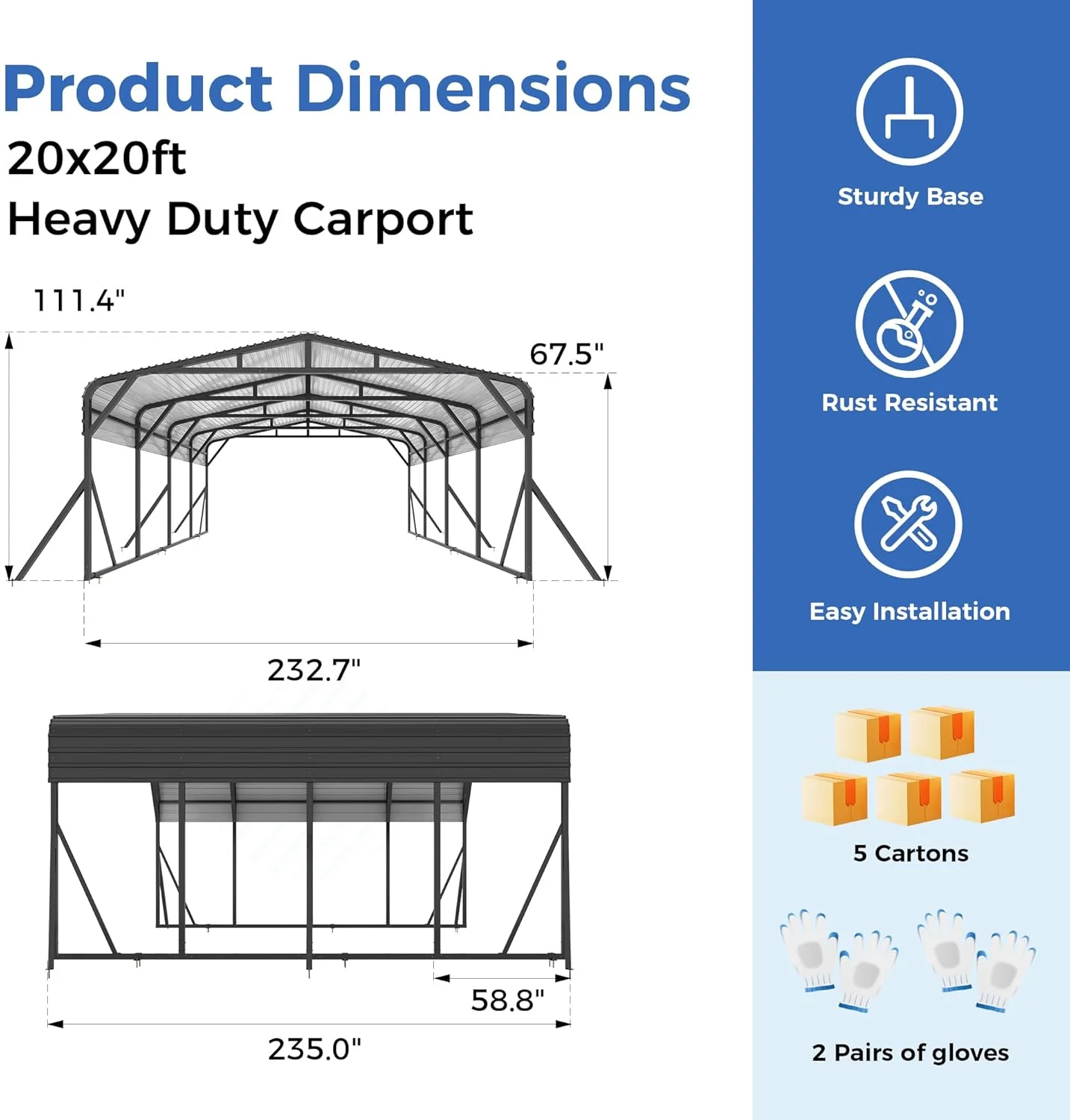- [Spacious Activity Space] With a spacious footprint, this metal carport provides extensive coverage for cars, outdoor gear and social gatherings. Whether you need protective shelter for your RV or a sturdy metal shed for hosting a party, this versatile structure meets your every need.