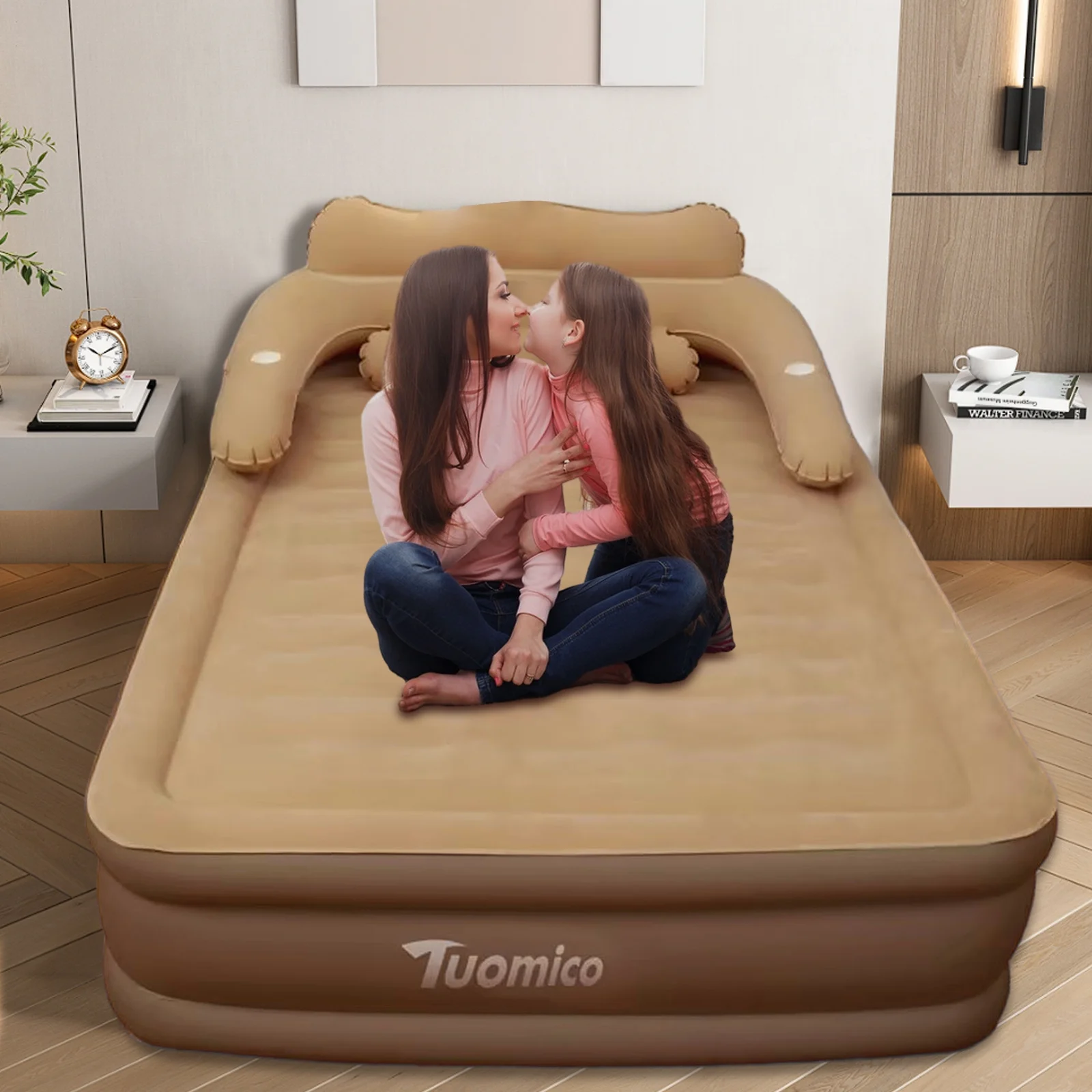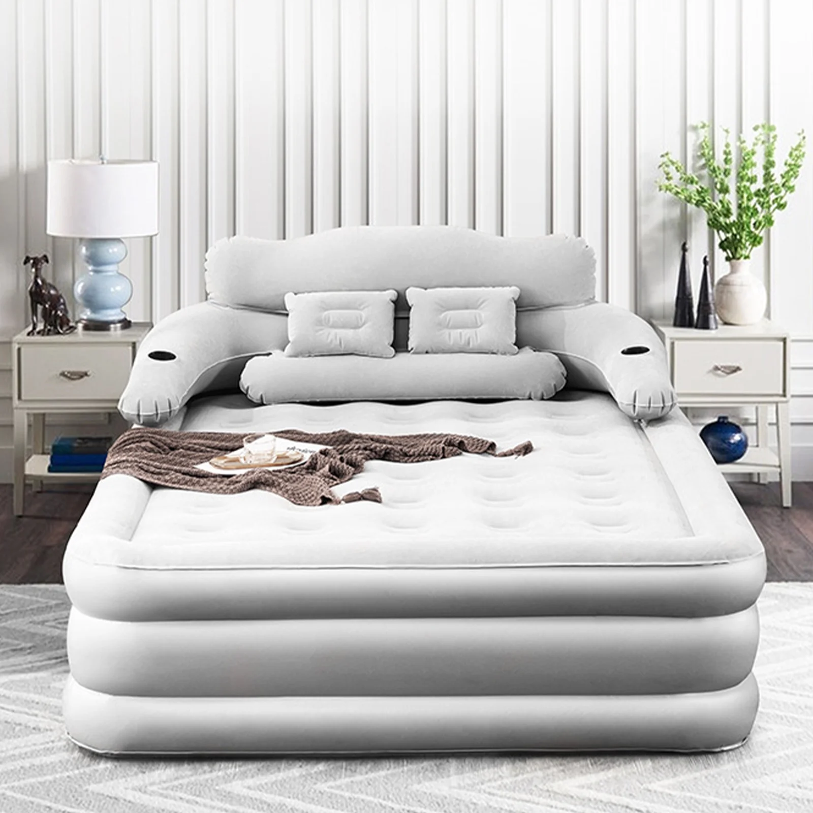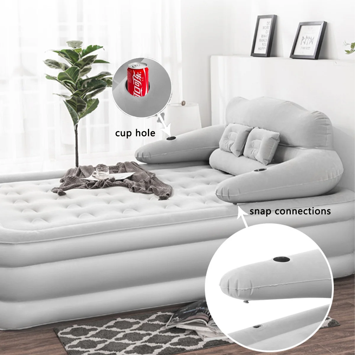 - Perfect Headboard Support: The headboard of queen air mattress is easy to remove/install, it has an ergonomic design to provide perfect support for your neck, back and lumbar, giving you extra comfort. The double cup hole design, you can place cups and other small objects, easily assemble and disassemble with snap connections for added convenience.
