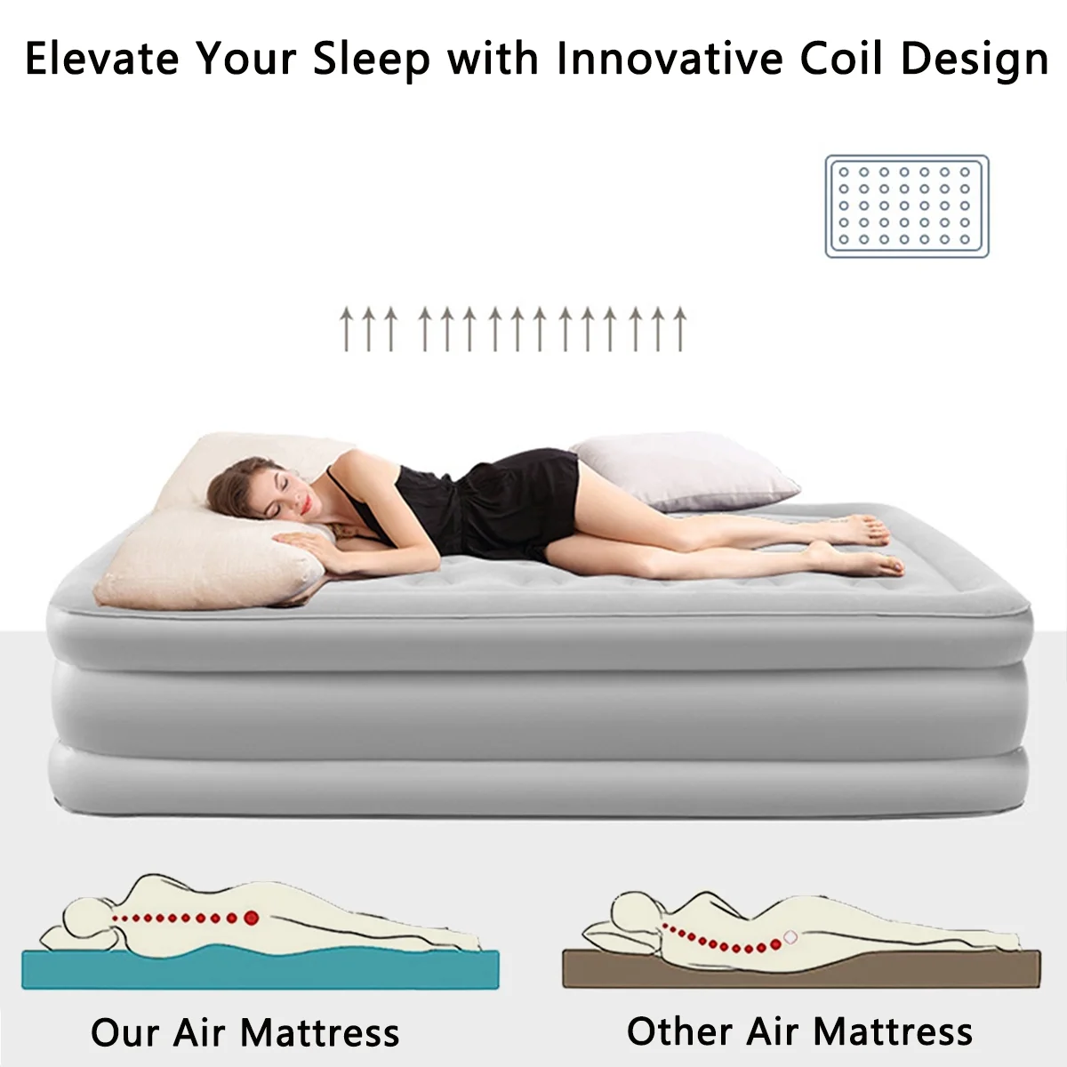 - Quick inflation and leak proof design: The inflation process is simple and fast. The inflatable mattress is equipped with a double-layer leak proof nozzle, which performs 85% better than a regular nozzle. The inflatable mattress adopts precise fusion connection, which is not prone to air leakage.