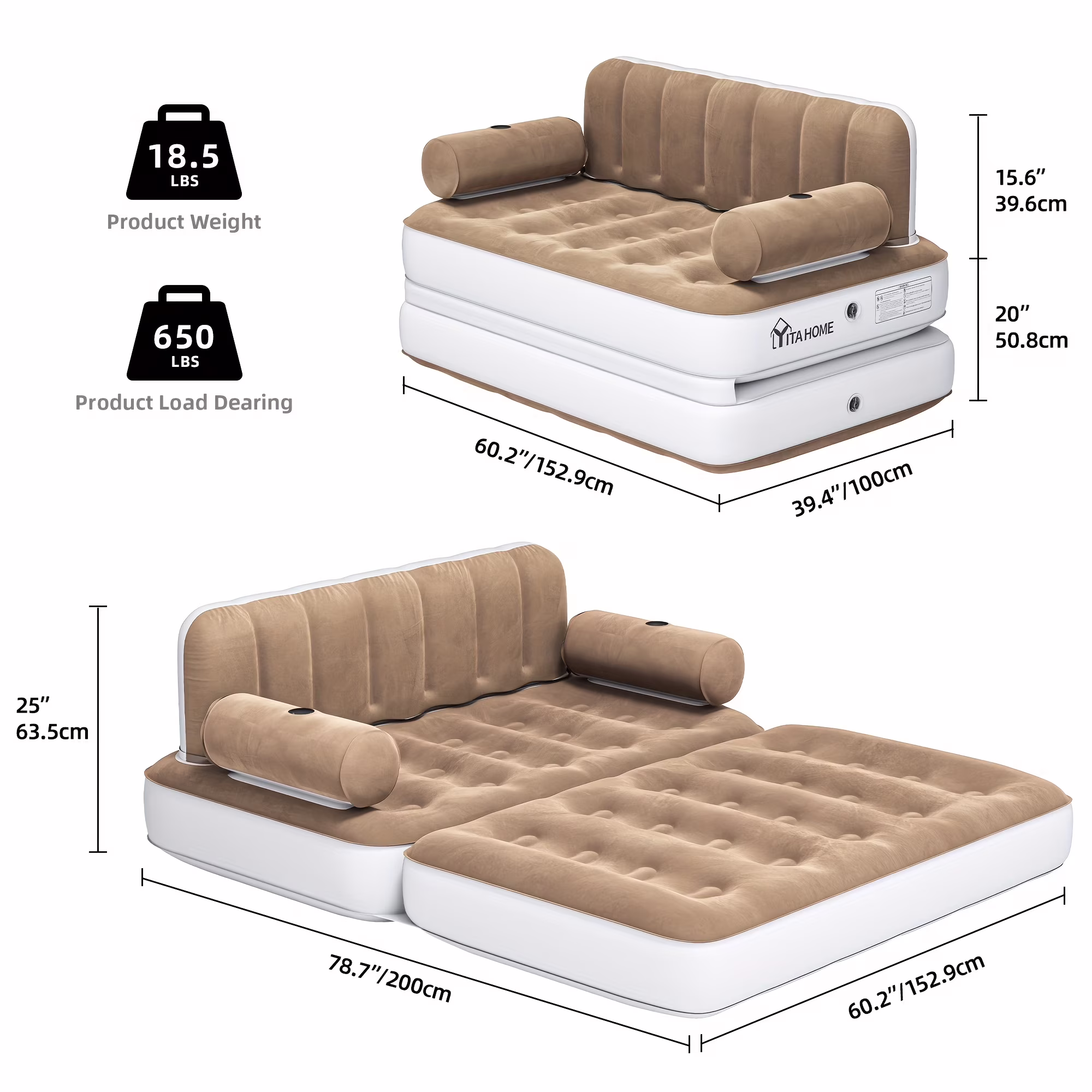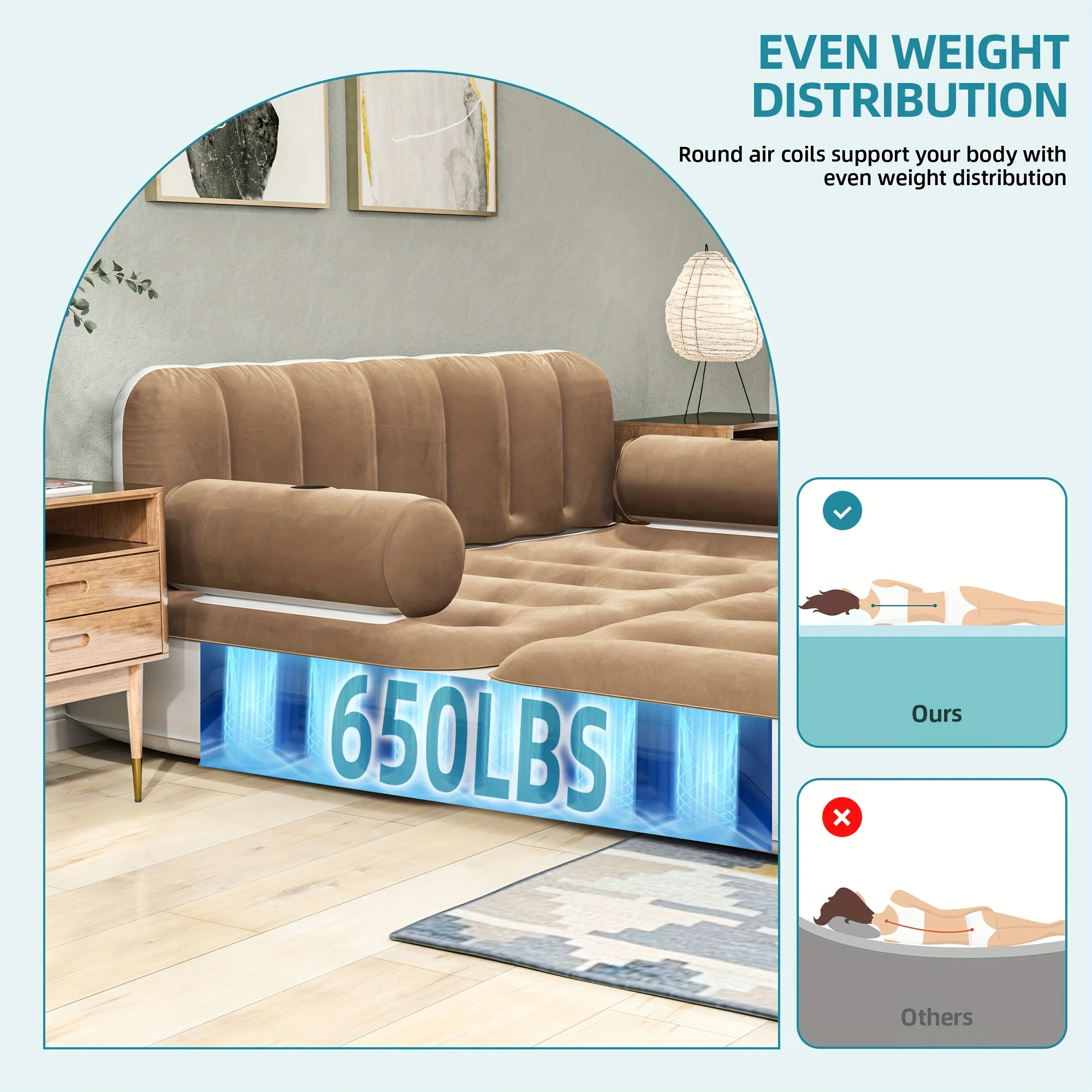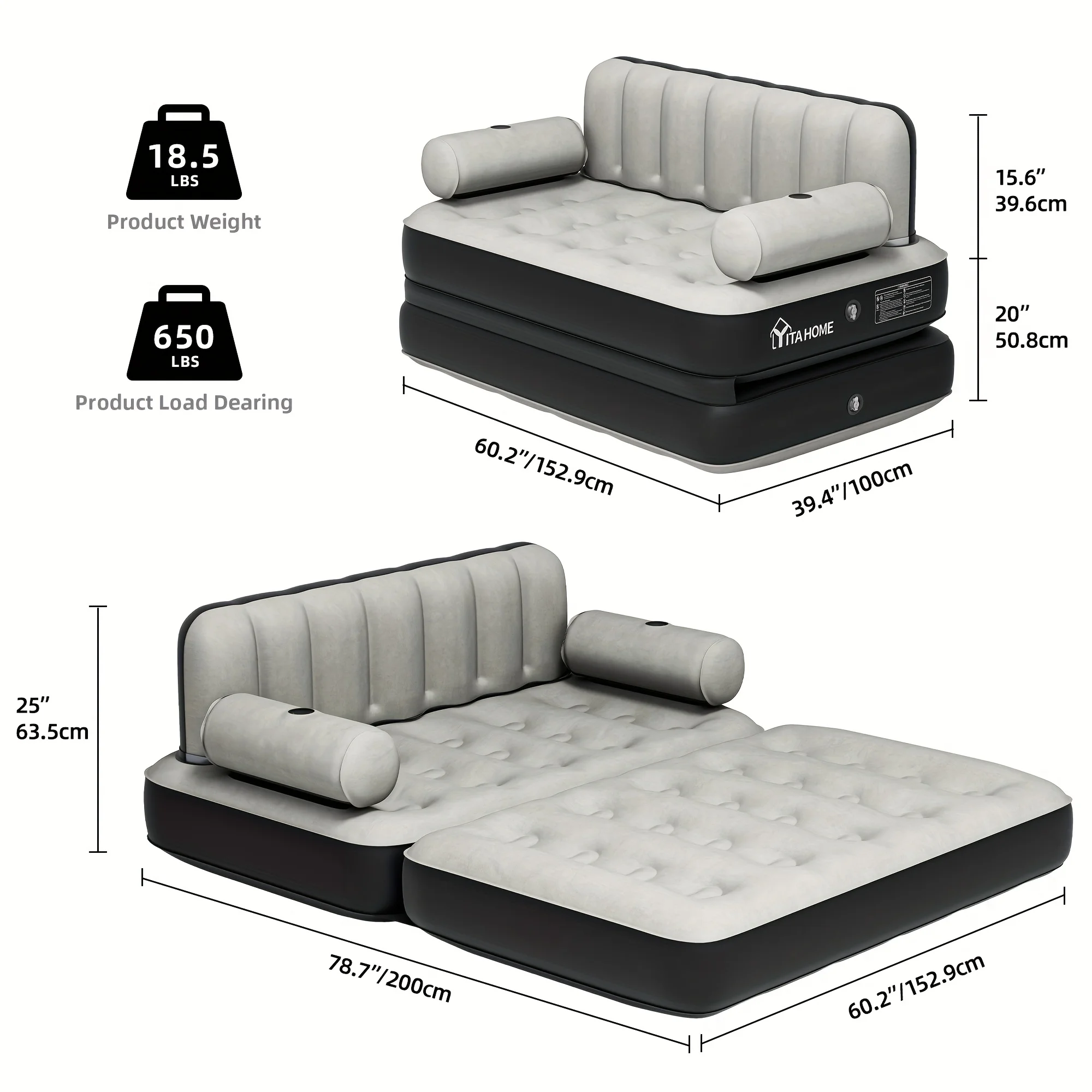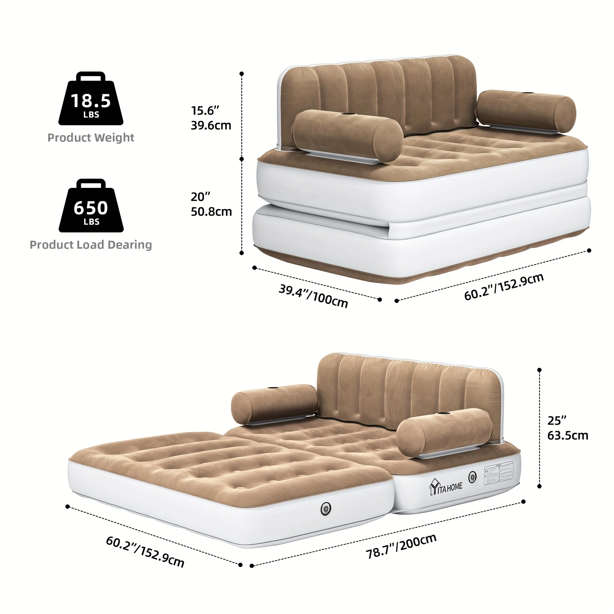 Inflatable Air Sofa Bed 2 - in - 1 Backrest Couch Airbed with Headboard and Pump Convertible Blow up Bed Mattress for Home, Camping, and Guests, Living Room Furniture, Queen Size