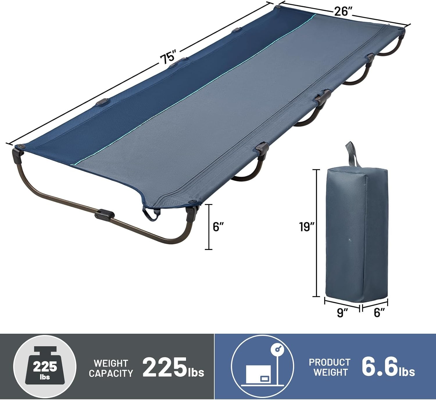 - LIGHTWEIGHT & HEAVY DUTY: This folding cot is made with 20mm*10mm aluminum pipes, only weights 6.6lbs. U-shape sturdy structure to distribute the weight well and prevents poking through the tent floor, supports up to 225lbs. (The maximum weight of our cot is 225 pounds, so sorry that some products TAG marked wrong)