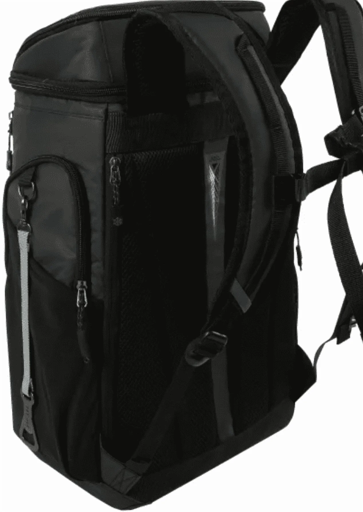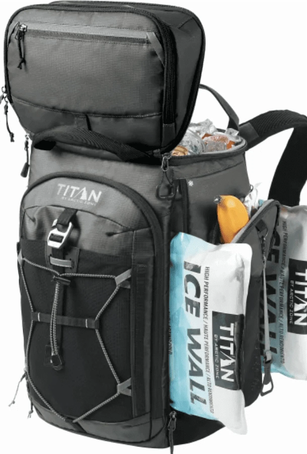 The Titan 26 Can Backpack Cooler keeps ice up to two days and has five insulated compartments, an organizer compartment, twelve accessory pockets and two removable Ice Walls that enhance the cold. The main compartment has a 26-can capacity and features SuperFoam insulation with Therma-Flect radiant barrier and an Ultra Safe leak proof easy clean lining. The organizer compartment is conveniently accessed from the front of the backpack cooler and is perfect for storing condiments, cutlery and other small accessories. The lid of the organizer compartment zips down to convert to a mat for accessories, food, etc. which comes in handy when there are no clean surfaces available. All five insulated compartments as well as the Ice Wall pockets have Microban which helps protect against bacterial odors and stains and also makes the lining easier to clean. The exterior front and sides of the backpack cooler are constructed of water and stain repellent, easy clean material. The back is padded with breathable mesh panels, adjustable, padded backpack straps, a sternum strap and a detachable bottle opener. The Titan 26 Can Backpack Cooler with Ice Walls is perfect for picnics, the beach, hiking, biking, camping