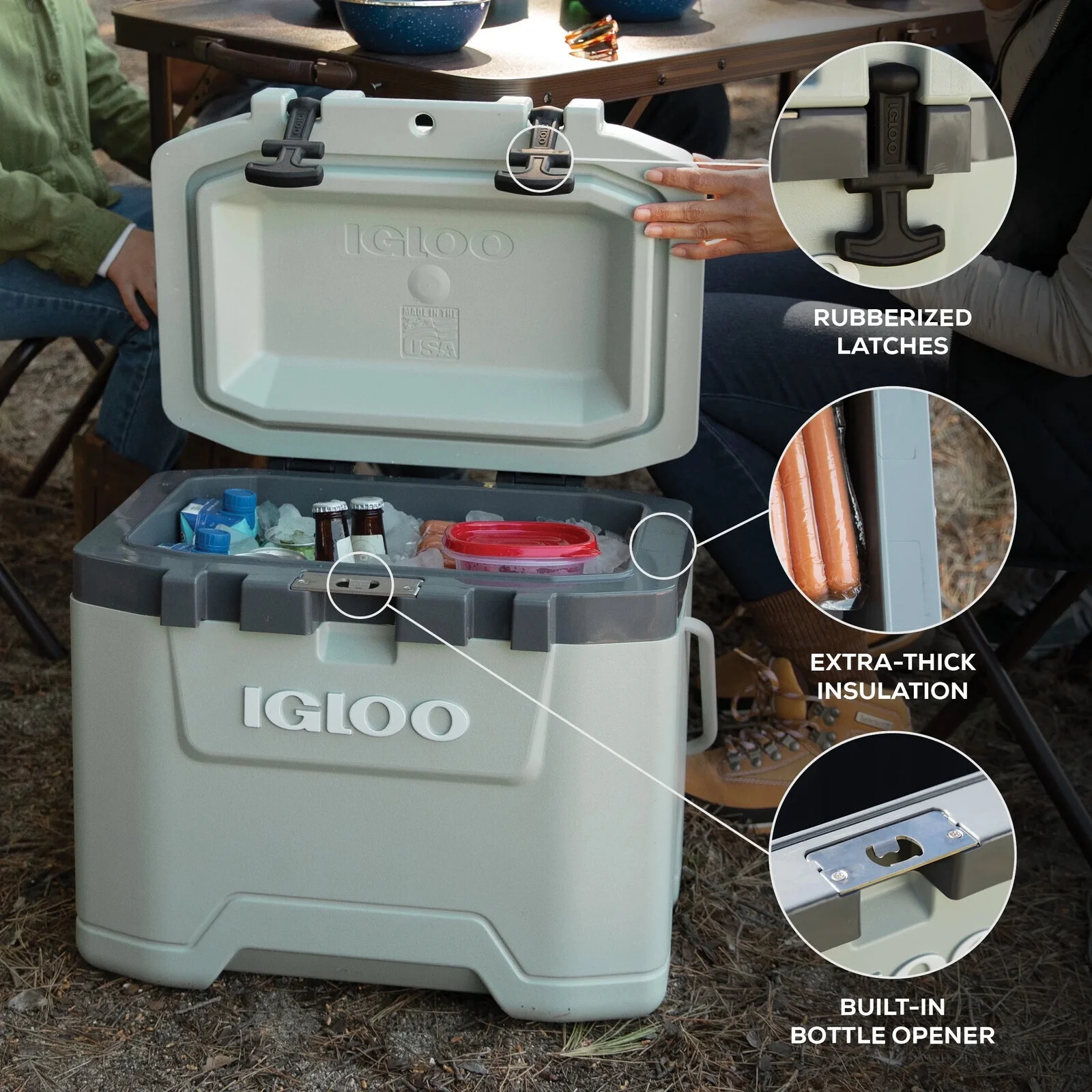 Durable rubberized lid latches help to lock in the cold