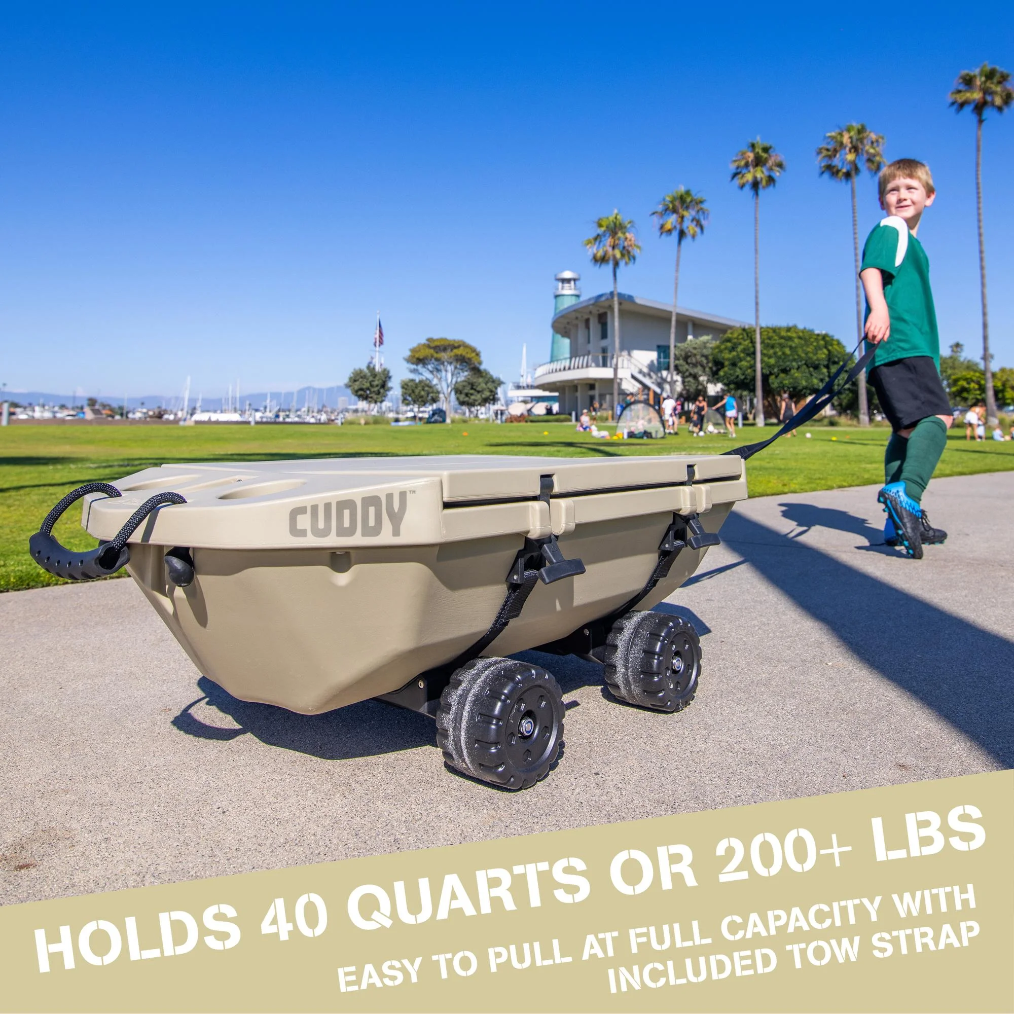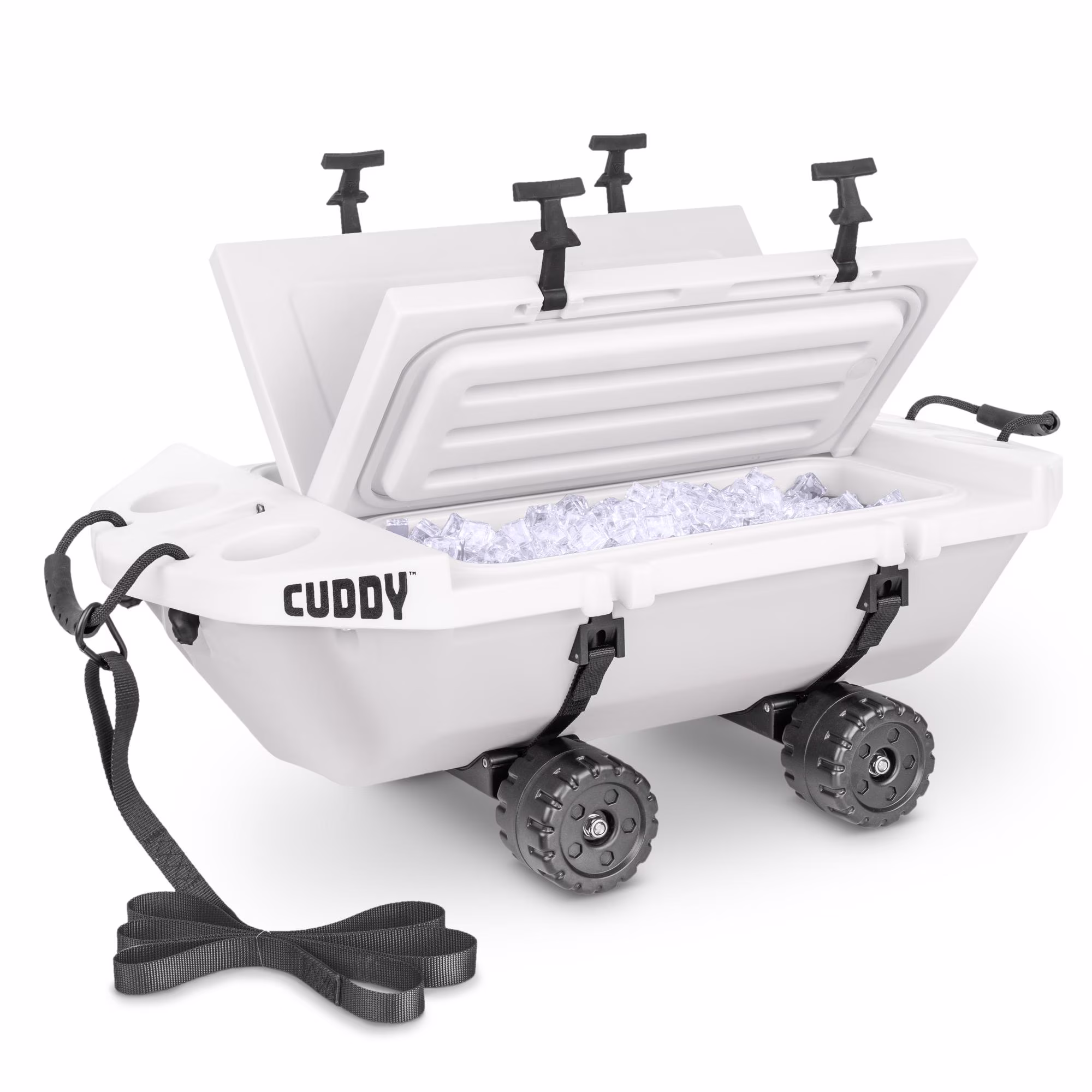 - AMPHIBIOUS COOLER: Take the wheels off in seconds and float or tow the CUDDY on water; Cold drinks or dry storage for pools, lakes, kayaking, tubing and more