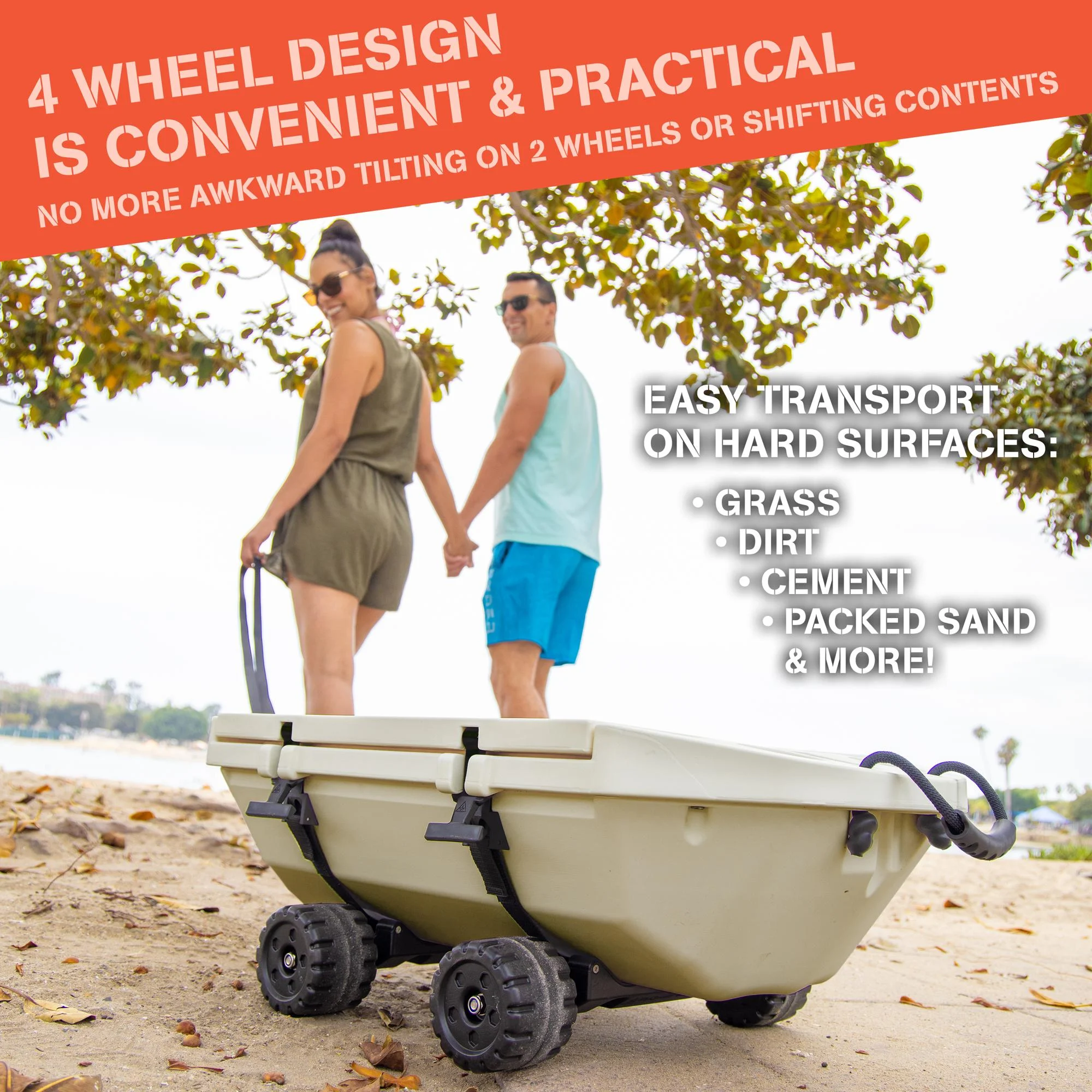 - 4 WHEELED COOLER: The only cooler with 4 wheels for far easier transport than heavy 2 wheeled coolers; Can easily be pulled with little effort when fully loaded (tow strap included)