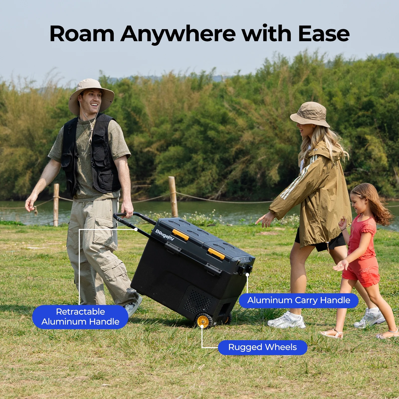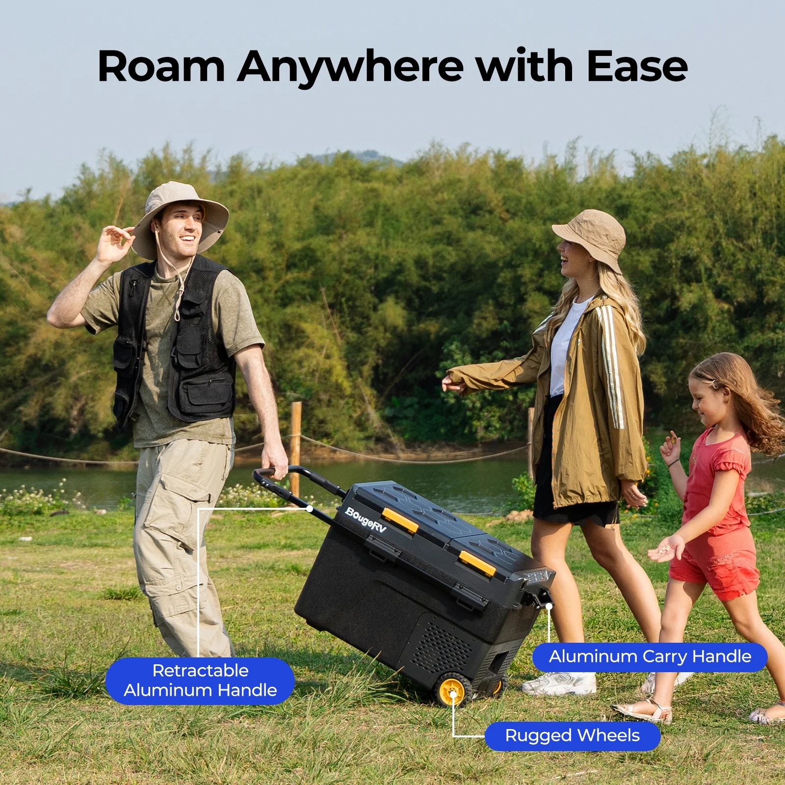 The door of our car refrigerator can be removed at will to change the opening method according to your needs/scenario/habit, making it more convenient for you to get food and drinks while driving; and our refrigerator comes with superior off-road wheels(non-slip) and extendable handle, making it more convenient to carry when you go on picnics and excursions.