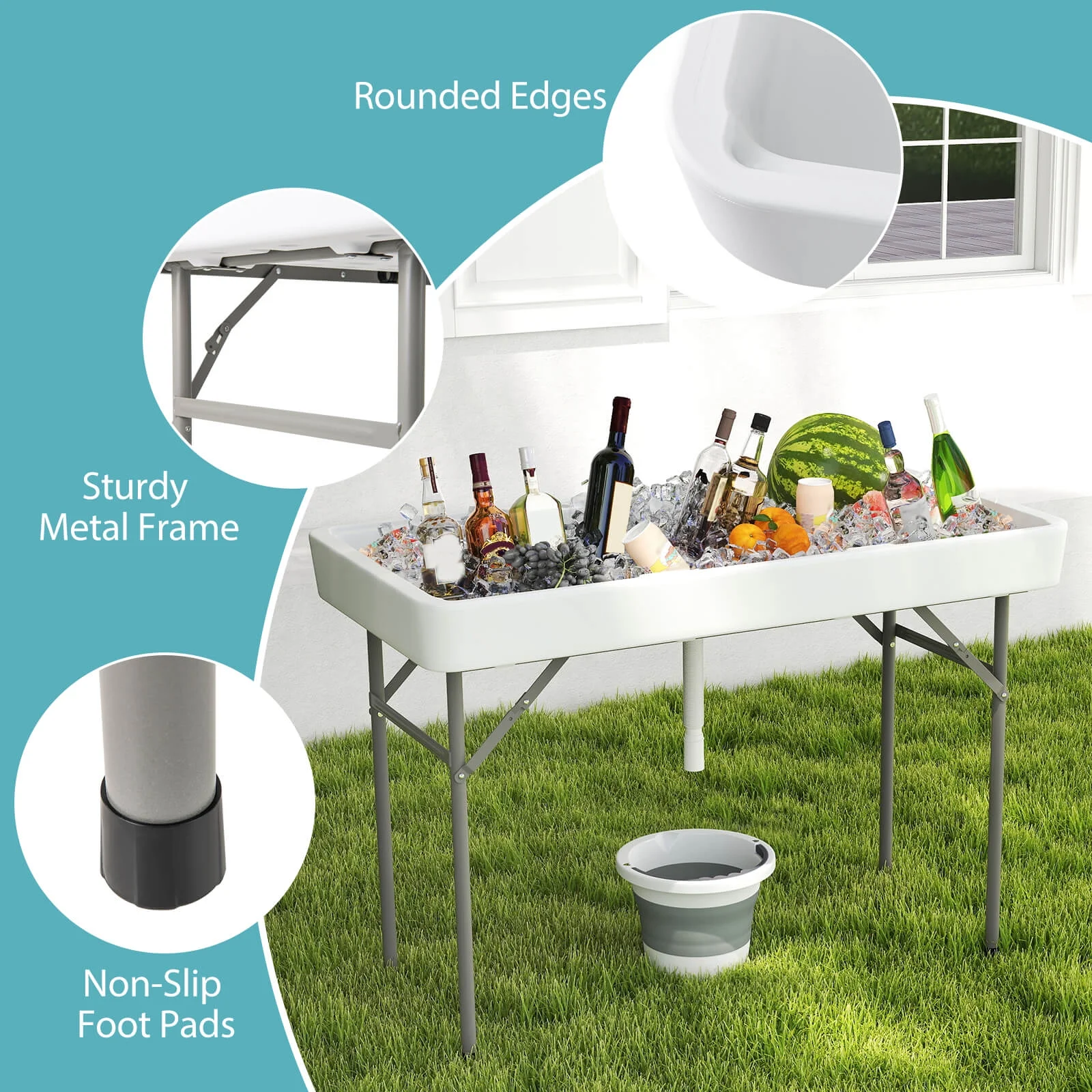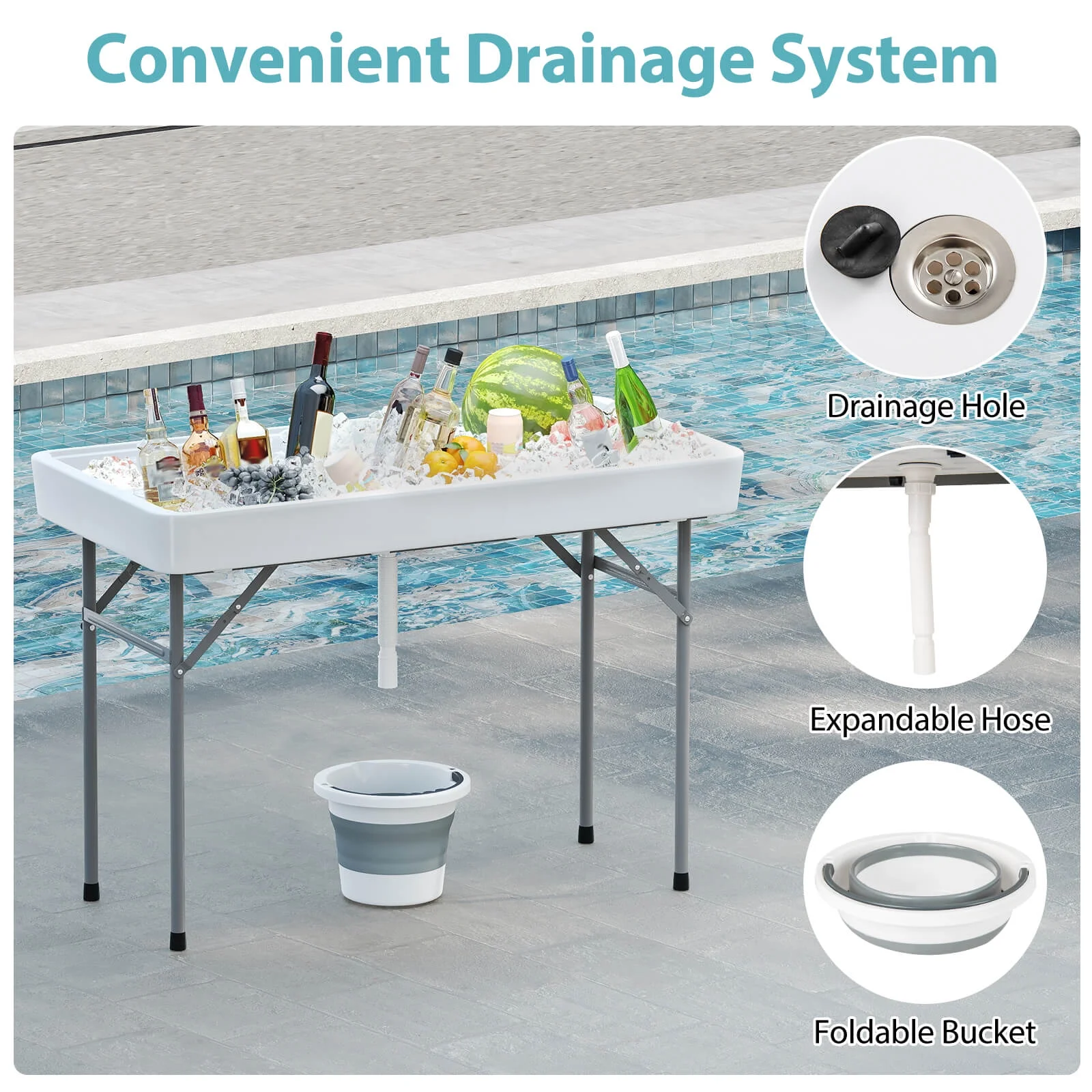 This portable ice bin table is built for long-lasting use with a high-quality HDPE tabletop and heavy-duty metal frame. Moreover, the matching skirt not only adds style to the table but also can be easily removed for washing. Along with a water-collecting bucket, the drainage holes and telescoping hose contribute to an efficient drainage system that keeps your floor clean. The outdoor chill table is perfect for different activities, such as parties, picnics, camping, and barbecues, serving as a great complement. When not in use, the foldable ice table can be folded for space-saving storage.