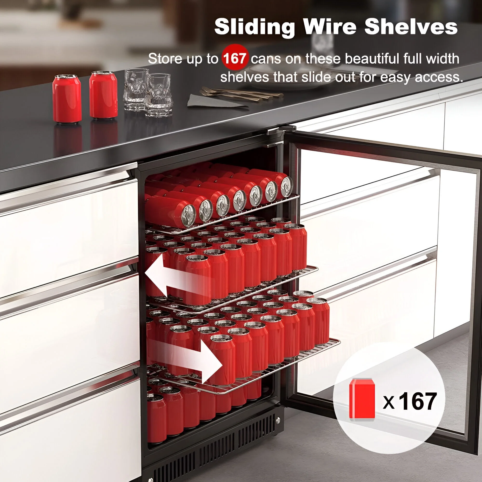 - Sliding wire shelves provide easy access to your beverages
