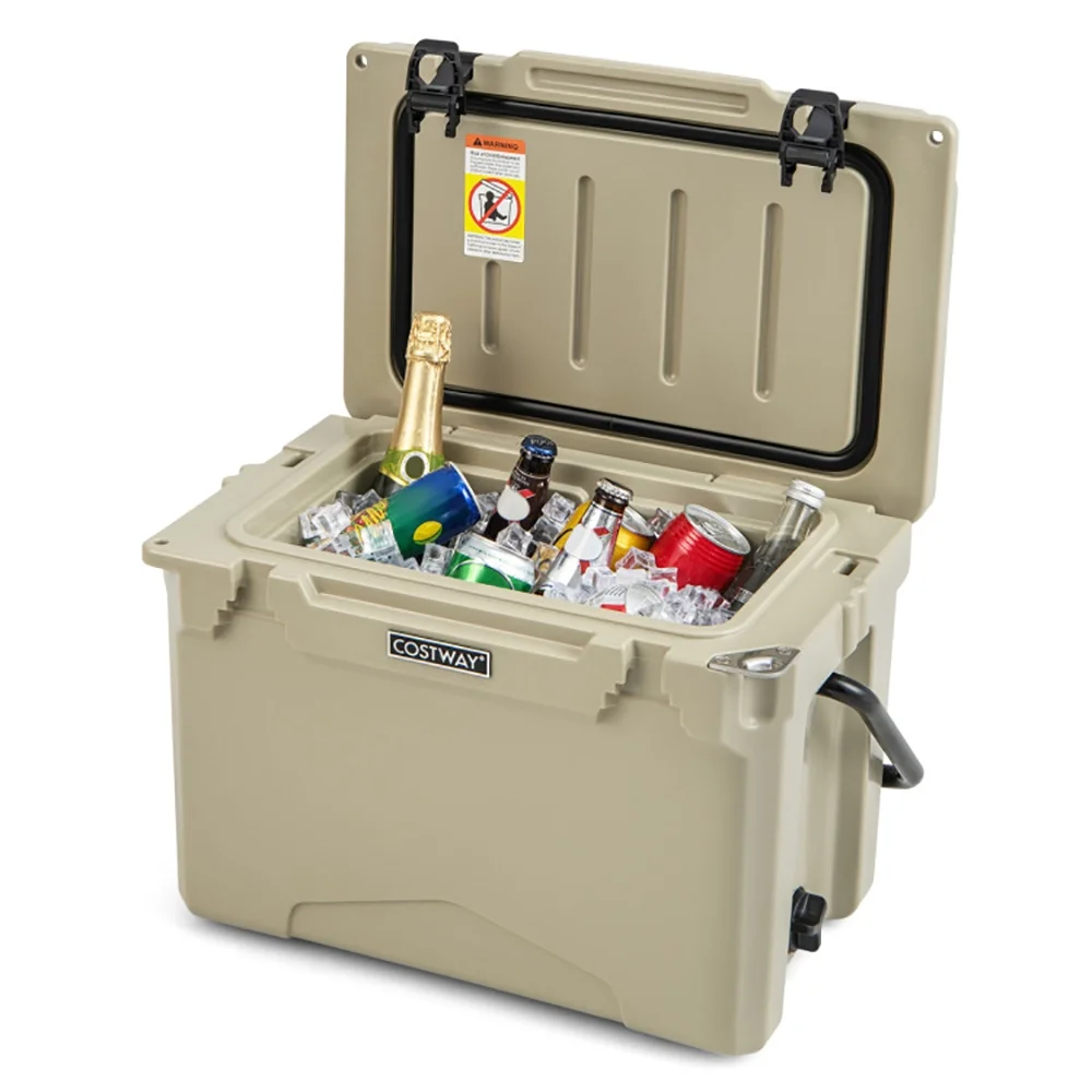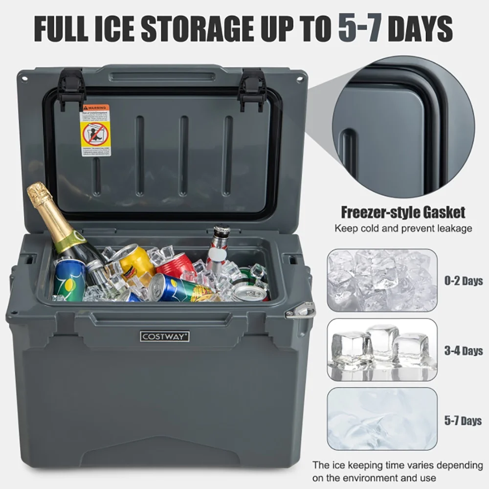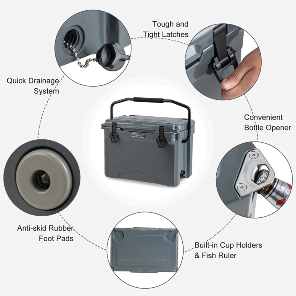 -High-strength LLDPE and polyurethane for long-term use-Sealed gasket and tight latches for full ice storage of 5-7 days-Can also keep fresh for 5-7 days and keep warm for 2-3 days-Worry-free movement with a foam padded aluminum handle-Convenient drainage system with plug for simple draining-Built-in cup holders and fish ruler and bottle opener for convenience-Anti-slip rubber foot pads for additional steadiness-Not only a cooler box but also a small table or extra seat-Ideal choice for camping picnic BBQ road trip and more