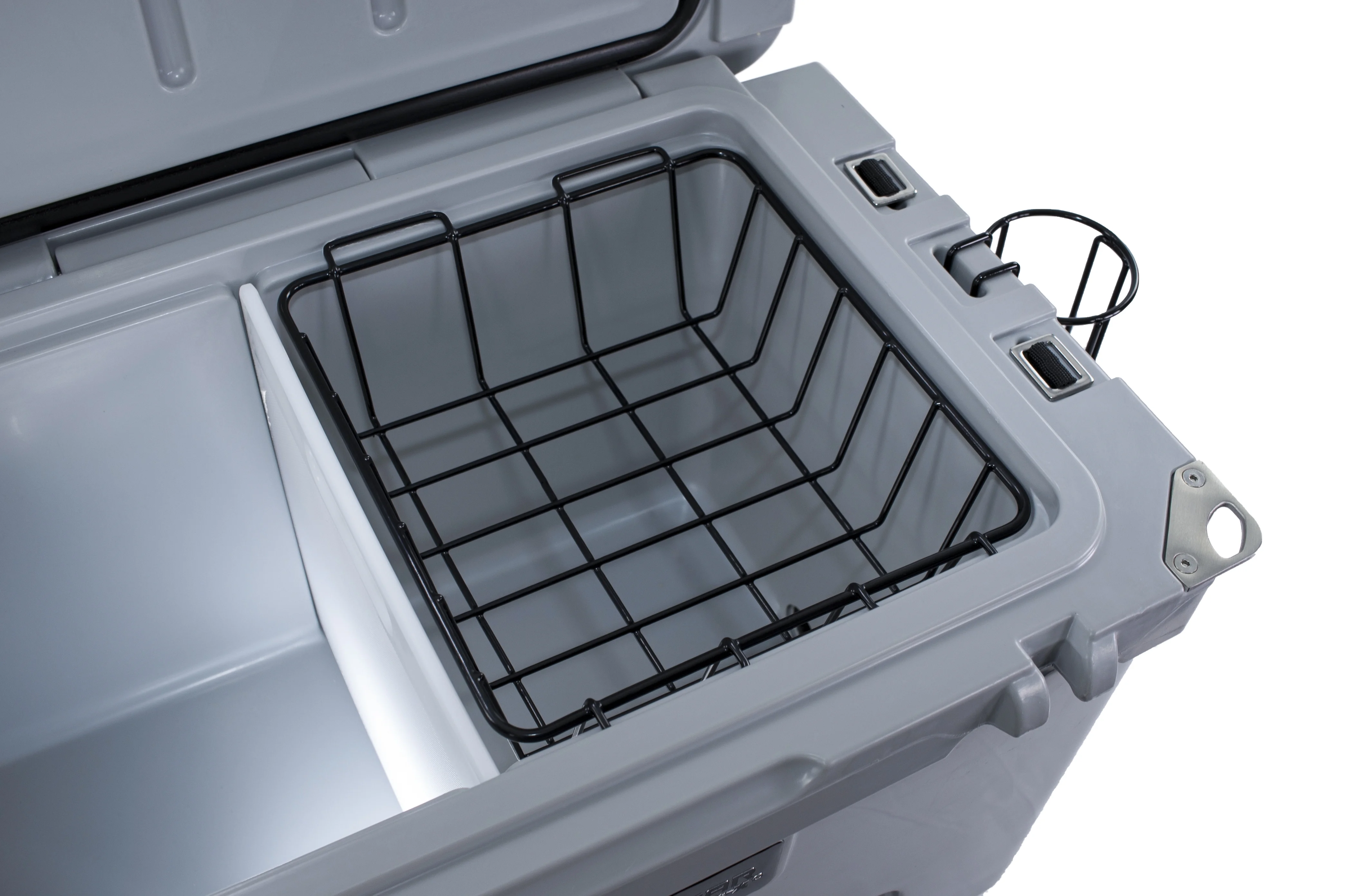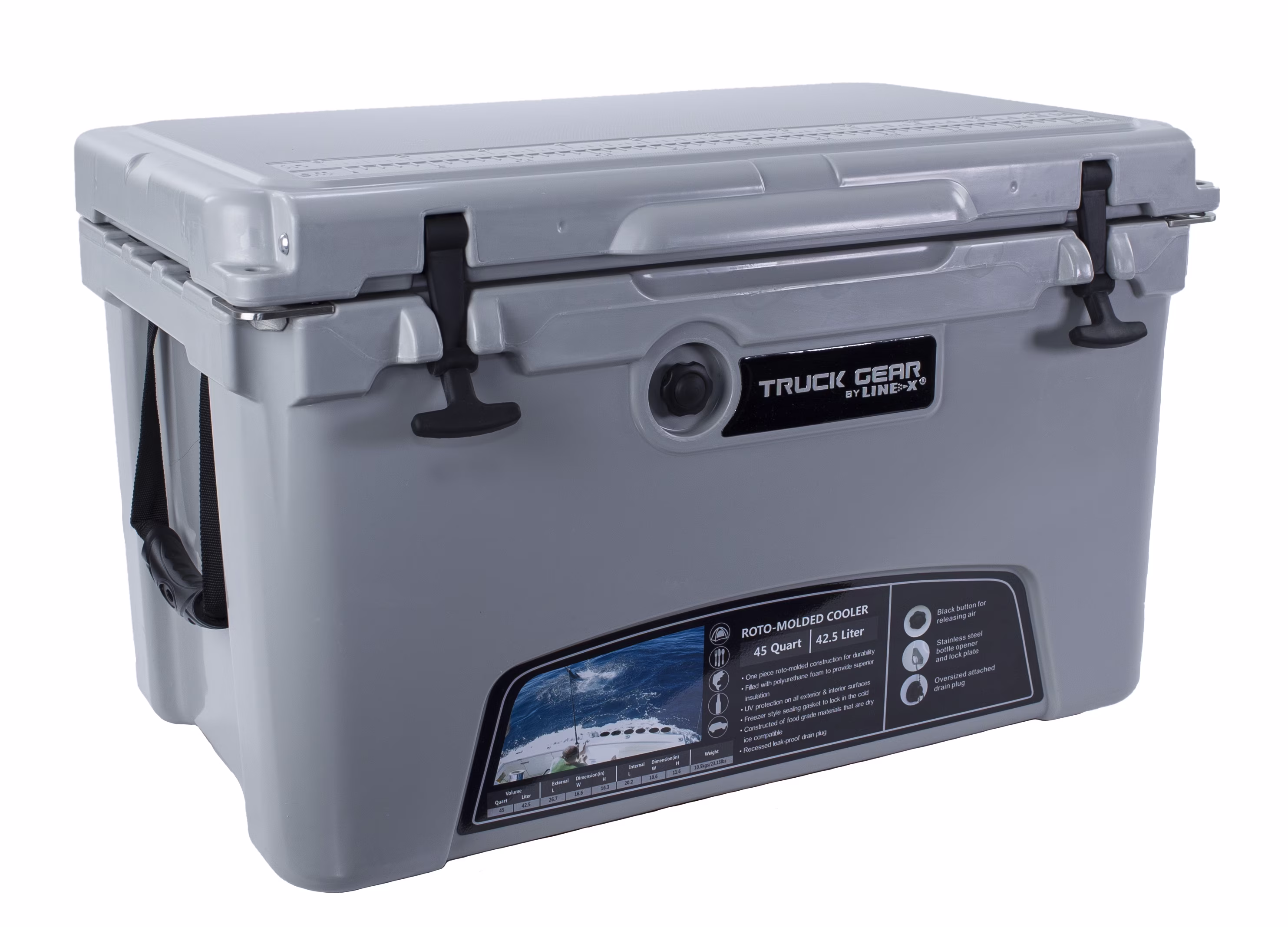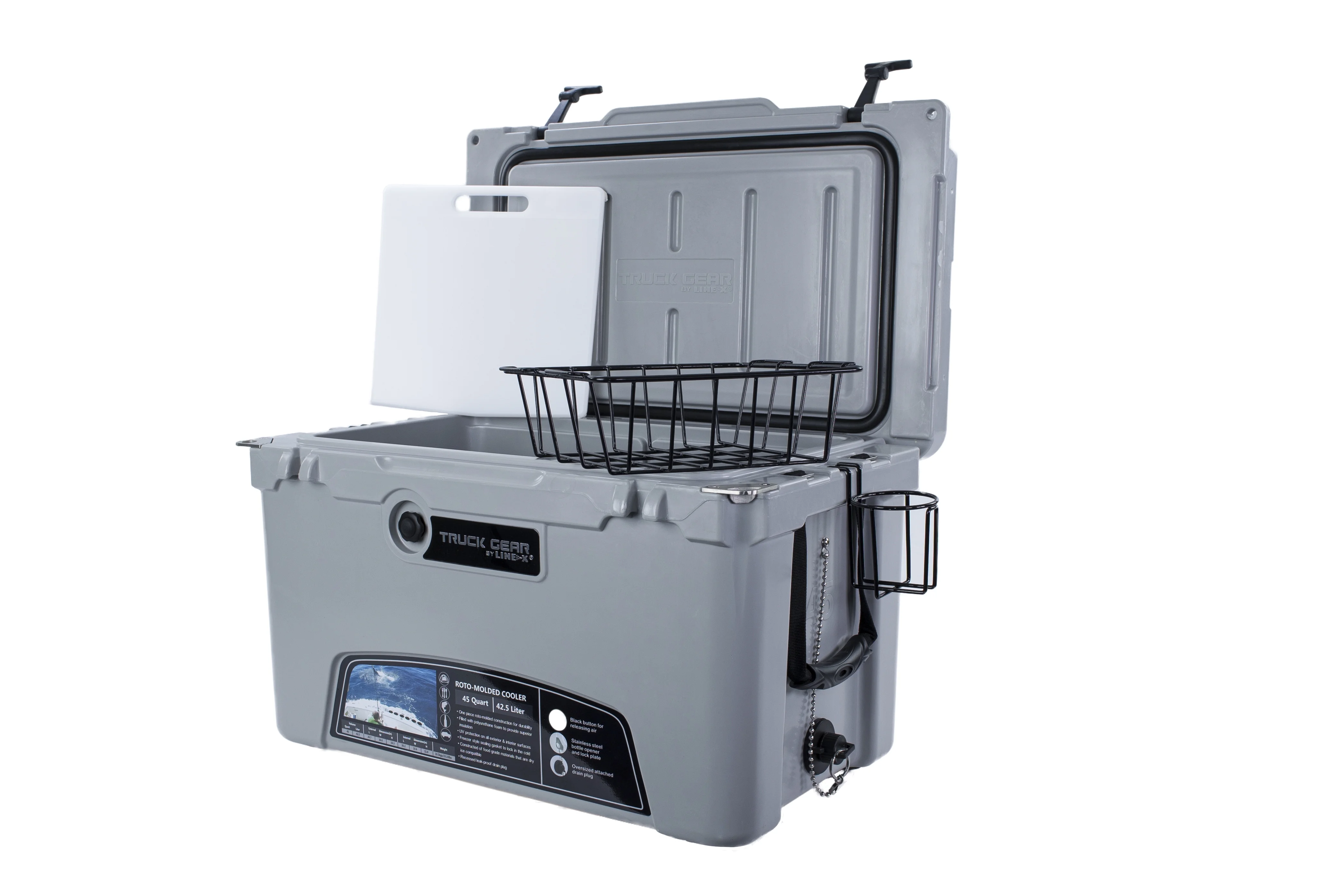 45 Quart; Hard; Uses Ice; Truck Gear By Line-X Logo; Gray; 26.4 Inch Width x 16.1 Inch Depth x 16.30 Inch Height; With Condiment Basket/ Chopping Board/ Cup Holder/ Built-In Bottle Opener and Ruler