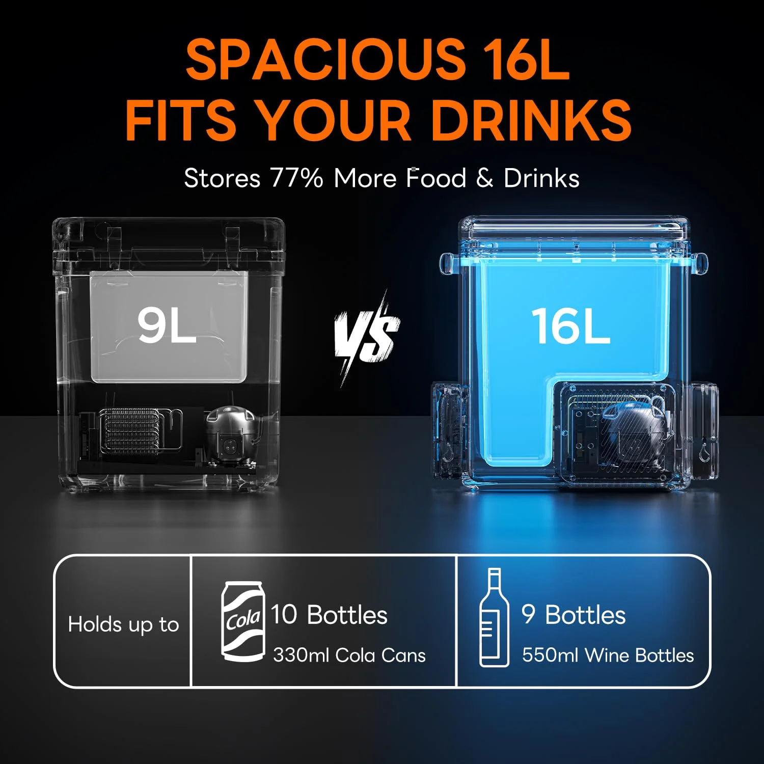 [Space-Efficient & Ultra-Quiet] The portable cooler with 16L capacity can hold 24 cans + 6 wine bottles with collapsible dividers. 42.1% effective volume ratio (industry average: 30%) with see-through lid for quick access. Lid closure becomes a snap closure for better cold retention. Ultra-quiet 35dB operation - quieter than office AC. *Bonus: Top-mounted control panel prevents accidental temp changes vs front-panel car fridges.