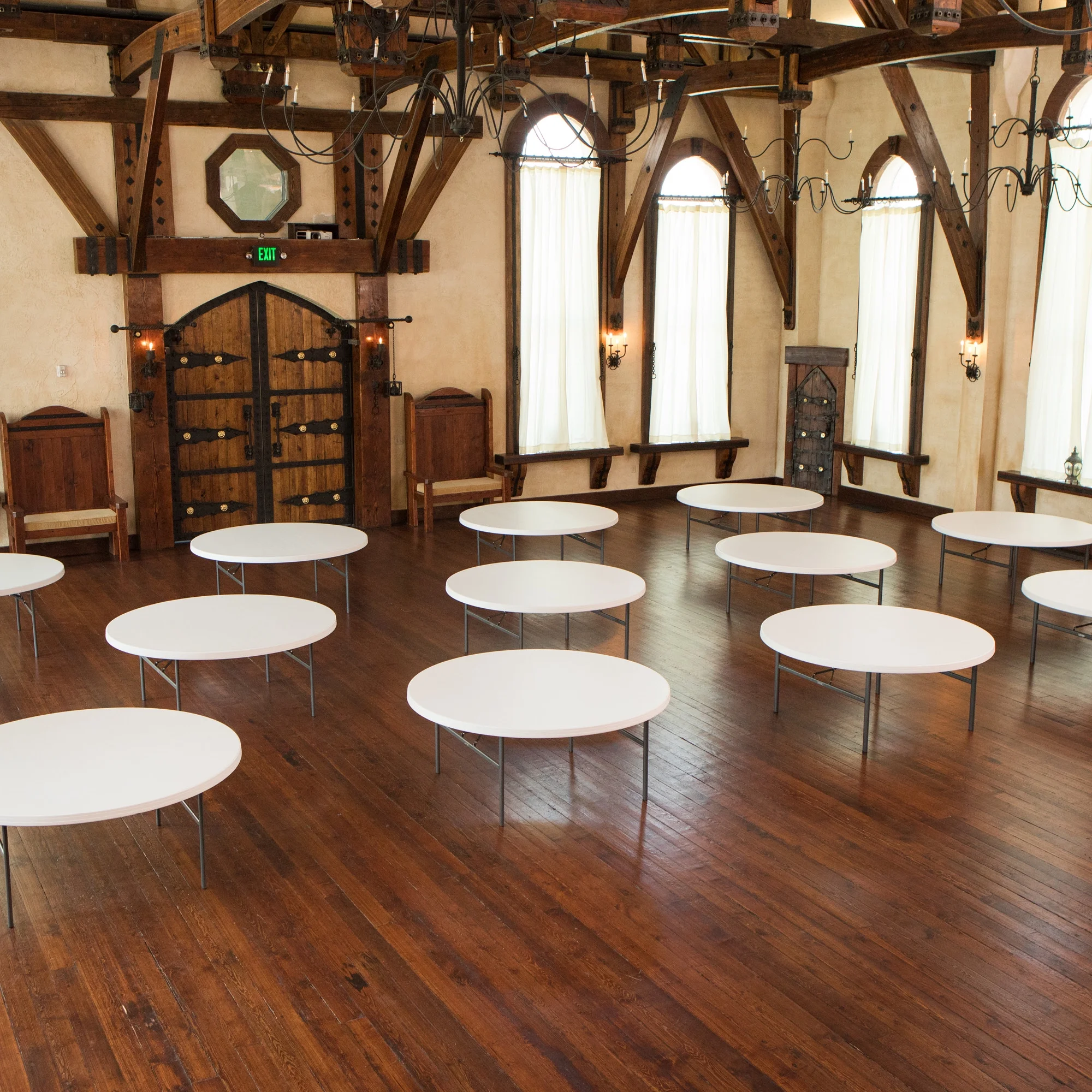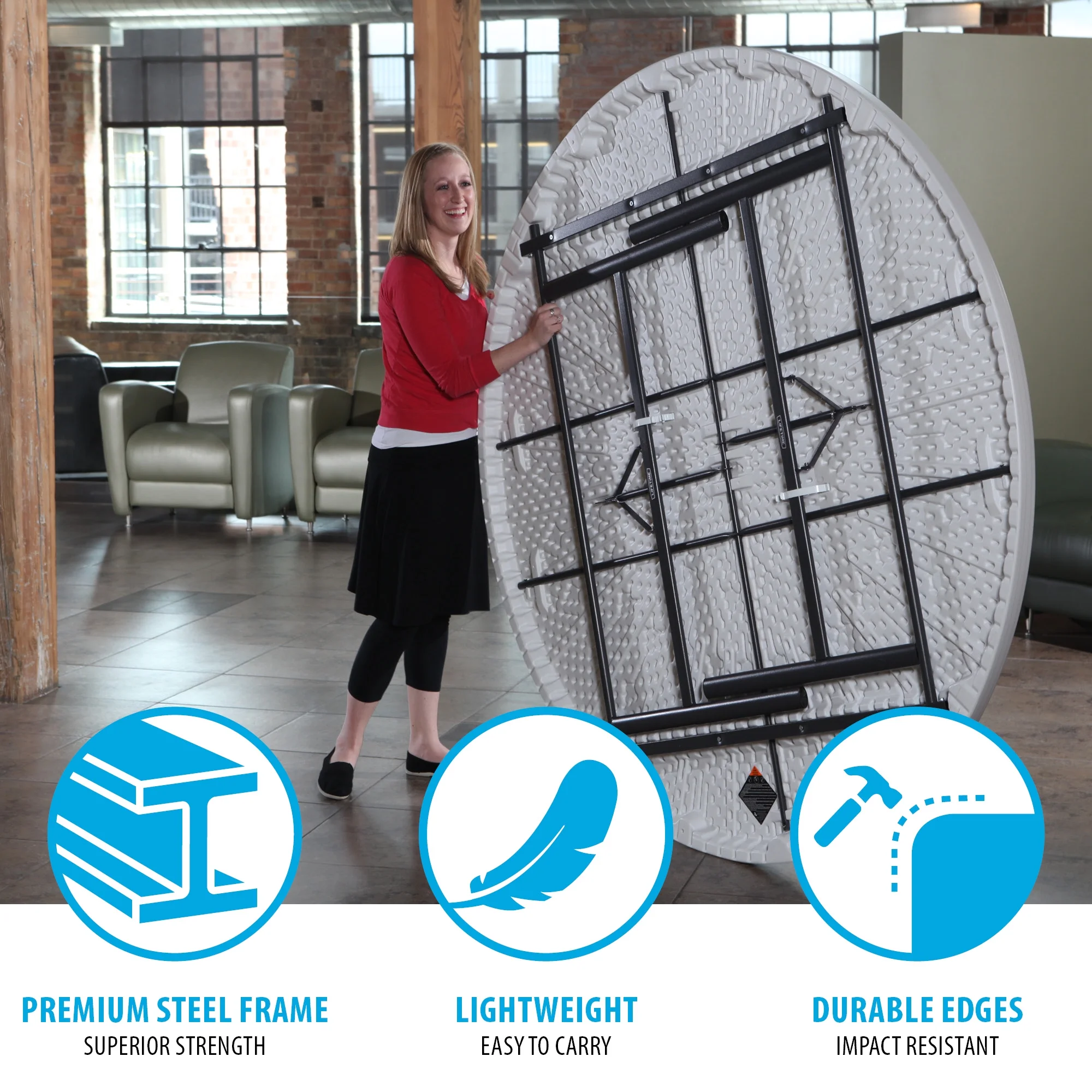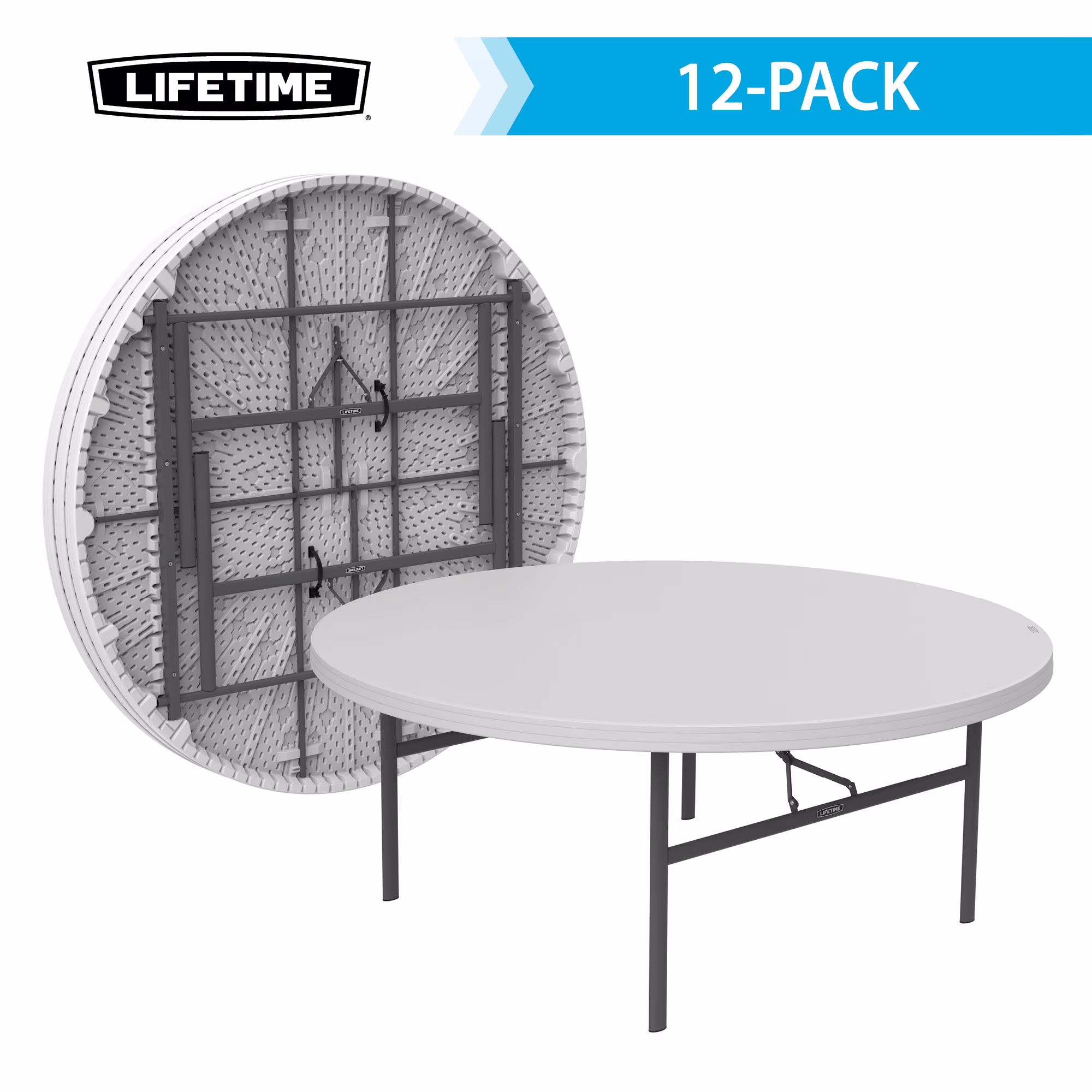 Lifetime 72-Inch Round Commercial Folding Tables are constructed of high-density polyethylene and are stronger, lighter and more durable than wood. They will not crack, chip or peel, and are built for indoor and outdoor use. The patented steel frame design provides a sturdy foundation and is protected with a powder-coated, weather-resistant finish. Perfect for banquets, meetings or large events, Lifetime 72-Inch Round Folding Tables are built for the rigors of demanding commercial use, and exceed challenging BIFMA standards.