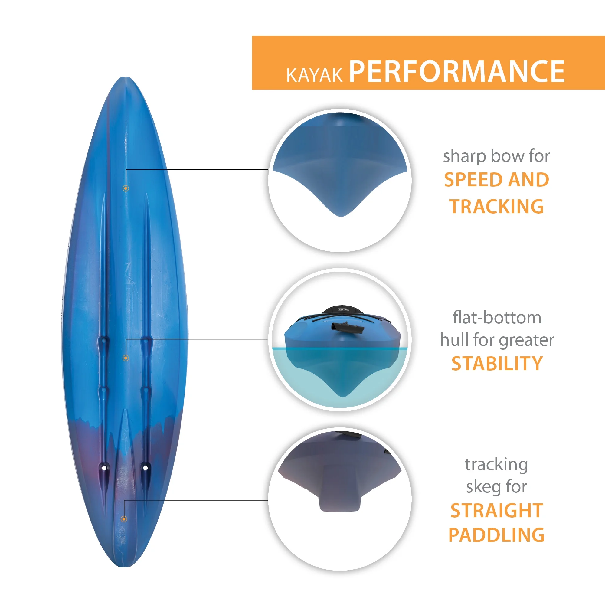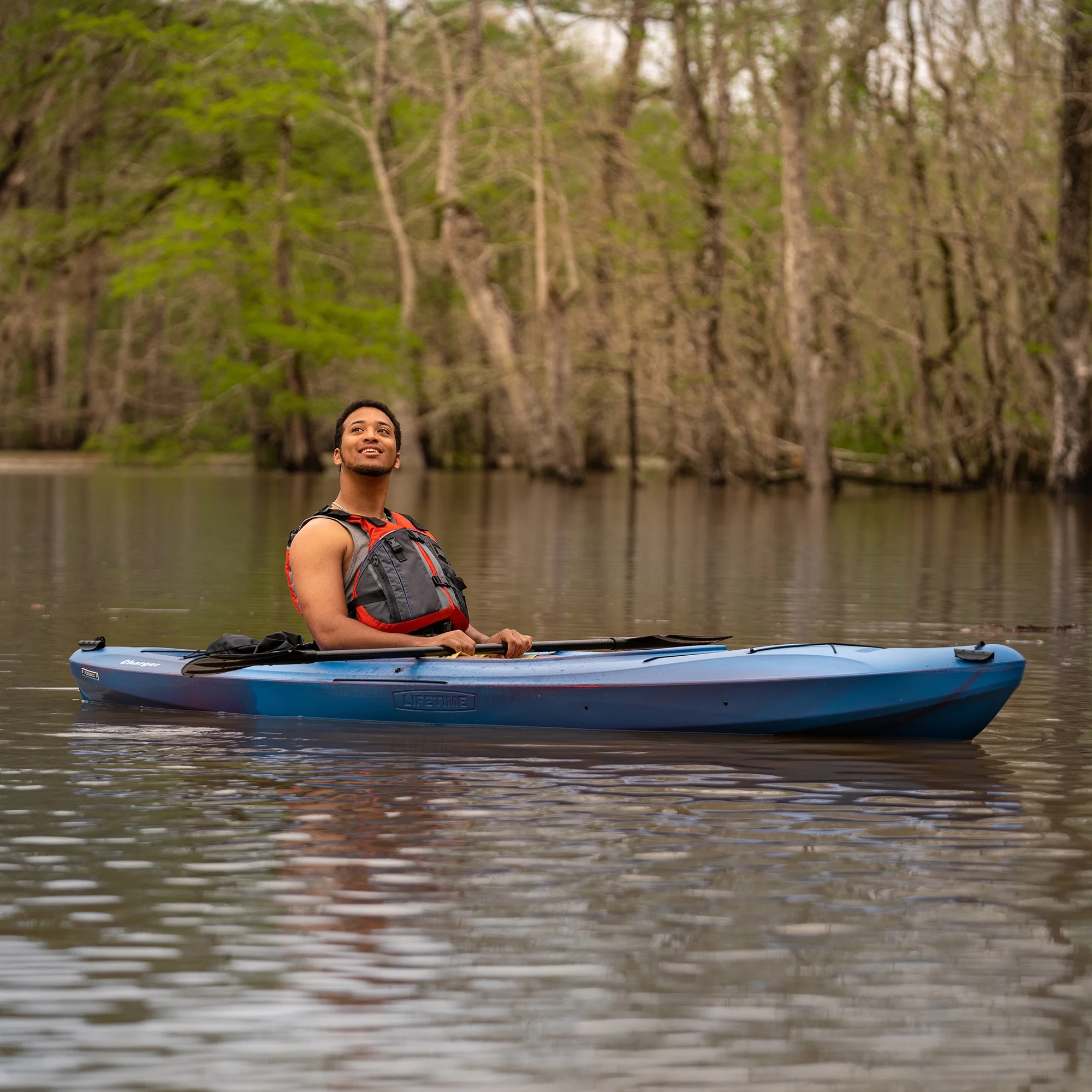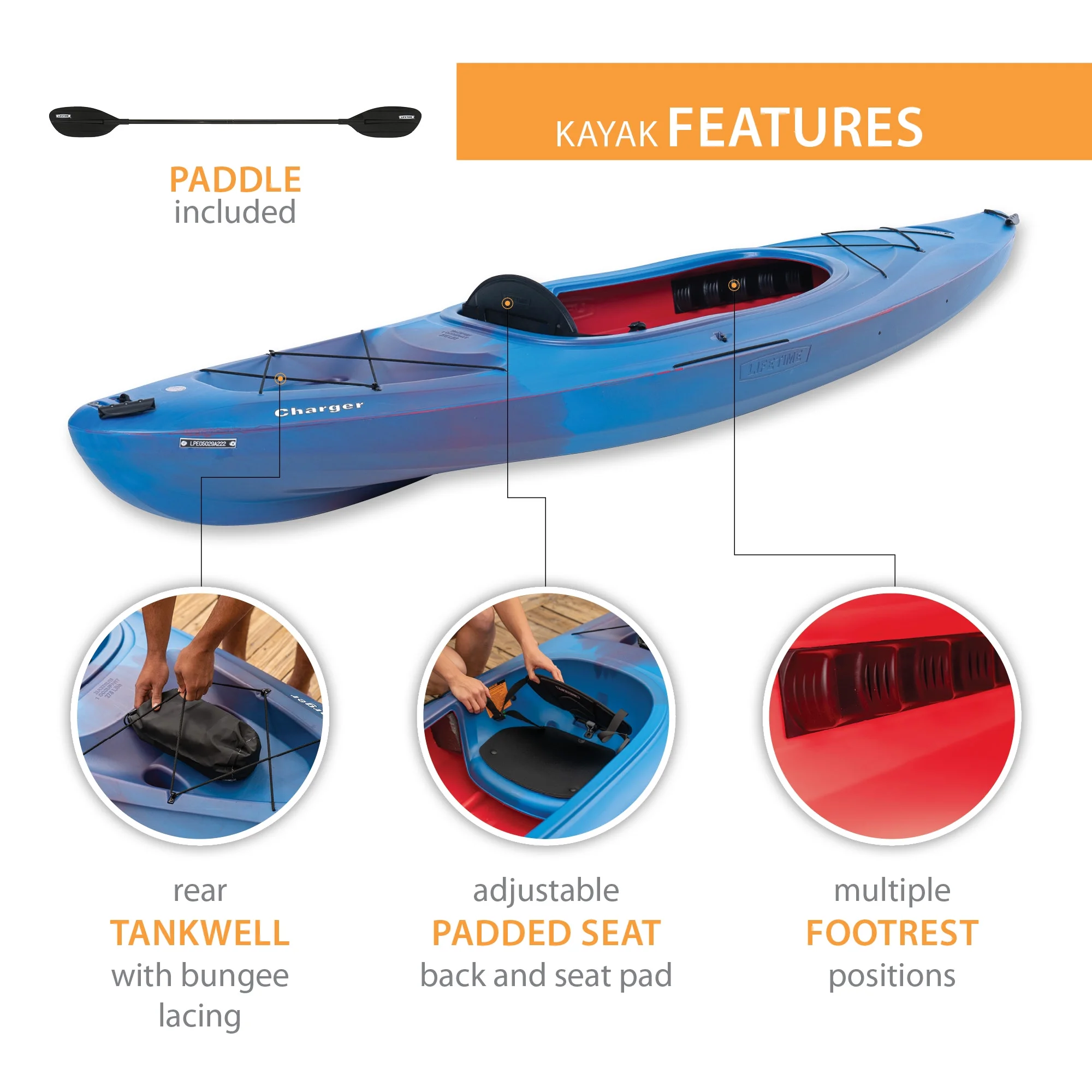 The Lifetime charger 100 is the perfect entry-level kayak to get you out on the water and into your next adventure. The charger 100 offers the perfect blend of stability, comfort, and performance making it suitable for use on slow-moving rivers, lakes, and calm ocean bays. This kayak is accessible to beginners but is still performance-driven for intermediate paddlers. The kayak provides great tracking making it easy to paddle straight and maintain its course on the water. Meanwhile, it features comfortable and adjustable seating with multiple footrest positions that will accommodate many different people. The large open cockpit is roomy and easy to enter and exit. It also comes equipped with bungee storage and rear tank well storage that is accessible on the water. Finally, the front and rear toggle handles make it easy to transport. With the Lifetime charger 100 kayak, you'll be gliding through the water in no time.