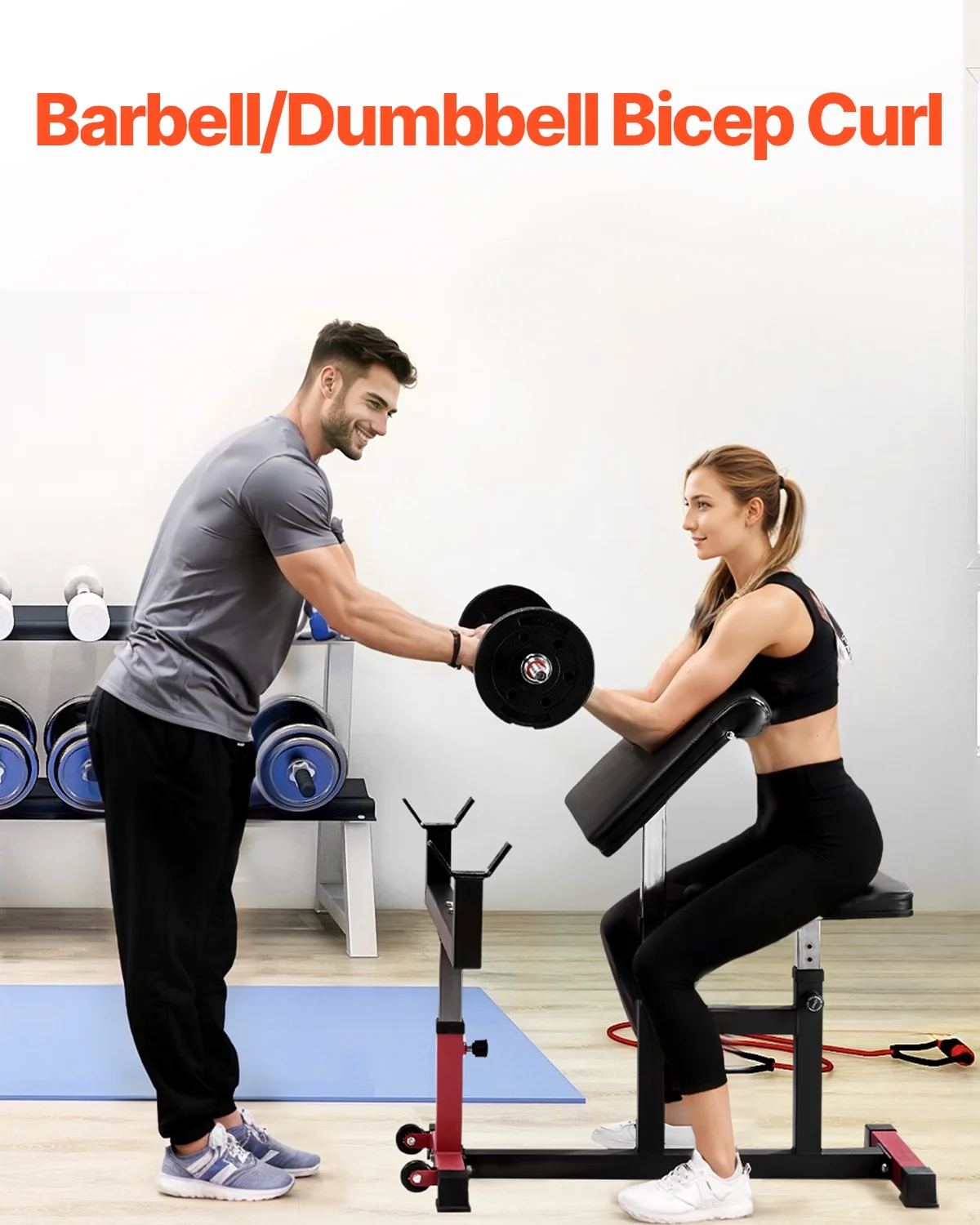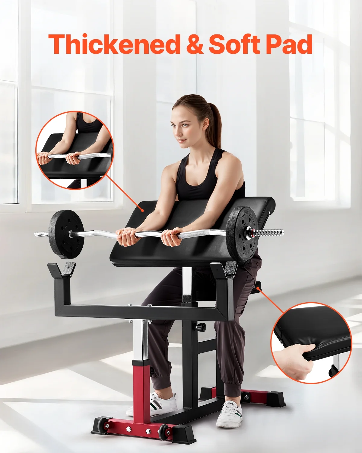 - More Humanized Details: Featuring movable wheels for easy transport, rubber-coated barbell catches for added protection, highly-elastic sponge padding for comfort, and non-slip foot pads for stability, this bicep strength bench is built for convenience and safety
