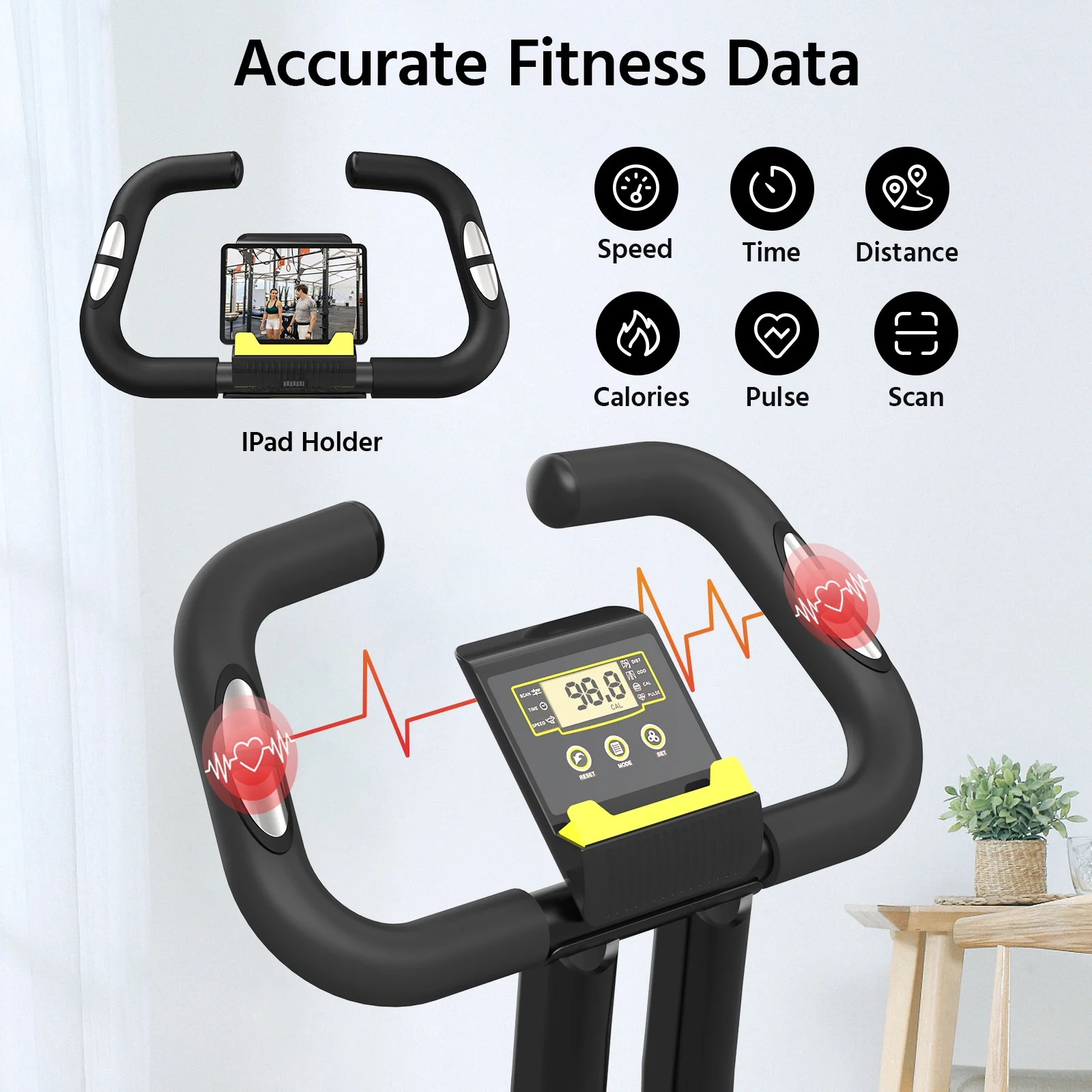 - 【LCD Monitor & Pulse Sensor] The large screen monitor on the stationary bike can show the data of speed, distance, time, calories and pulse clearly. Your heartbeat can be tracked when you hold the grip of the upright indoor bike, help you better check your healthy data.