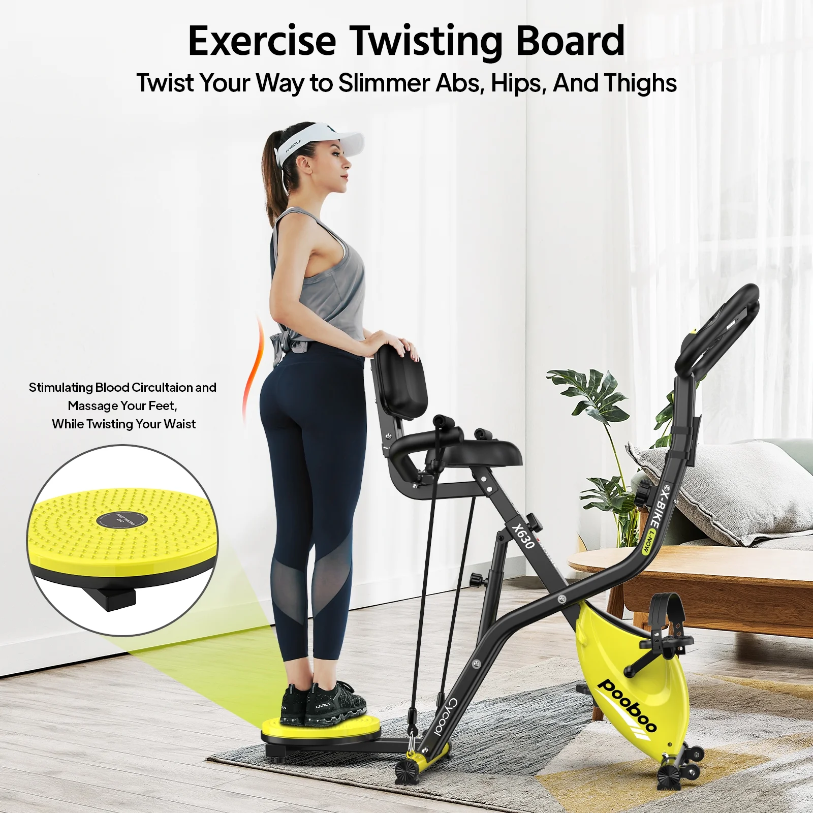 - 【Four-in-one Exercise Bike with Twister Board] Buy 1 foldable exercise bike, u can get 4 ways to exercise. Pooboo indoor cycling bike comes with arm resistance bands and twist board, you can train arm muscles and slim your waist to achieve a balanced and scientific full-body training. Stimulates blood circulation and massage your feet at same time
