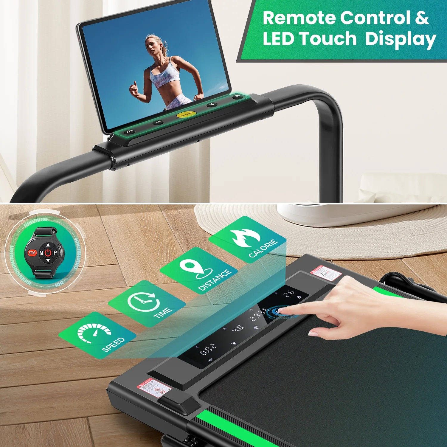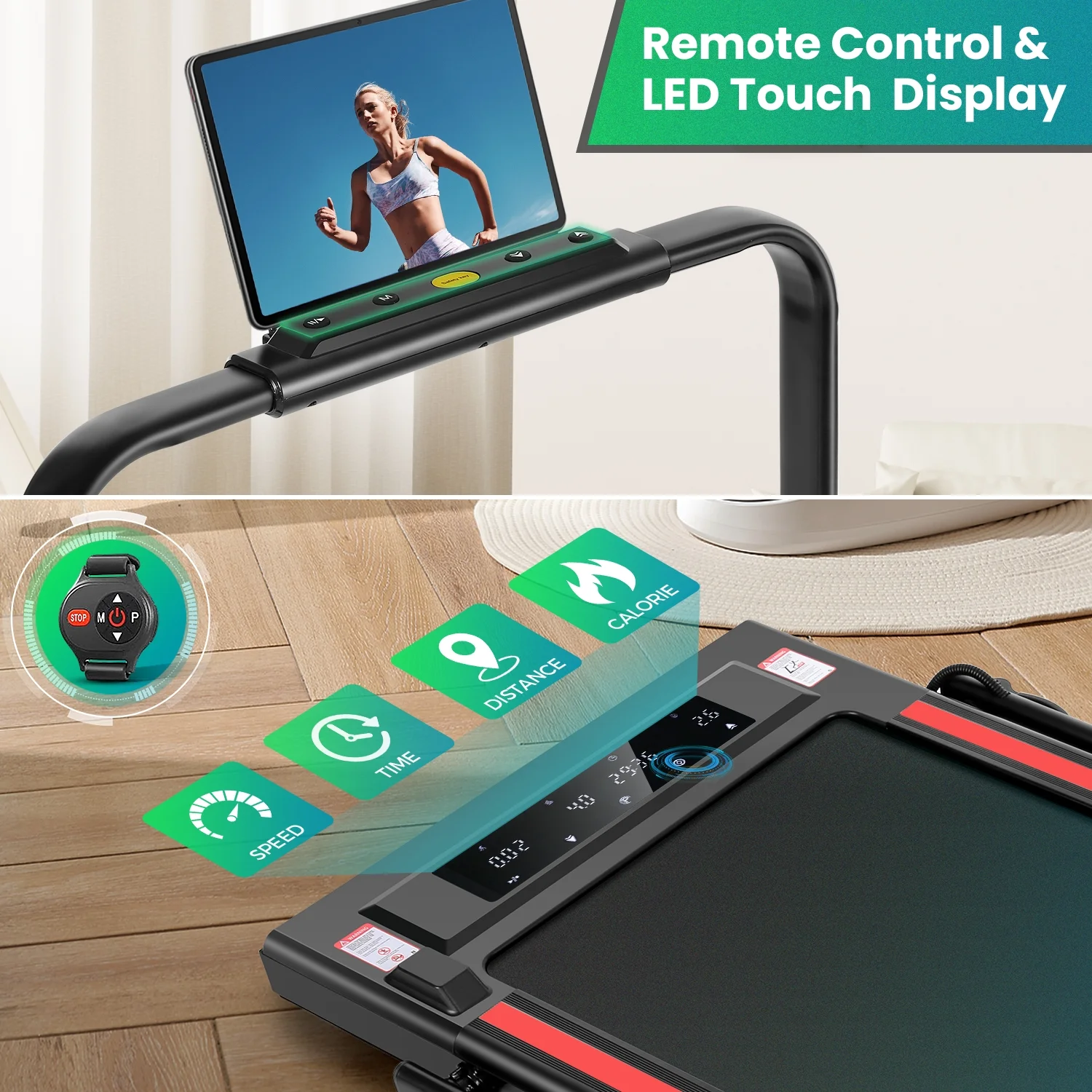 There are 3 control modes. When running, the buttons on the riser make control easier. They allow you to turn on/off, speed +/—, or stop running the walking pad treadmill. The remote control can change the speed or stop running easily when walking. The LED display on the running board can not only easily track the speed, distance, time, and calories in real time but also can control the program by touch, which is very easy.