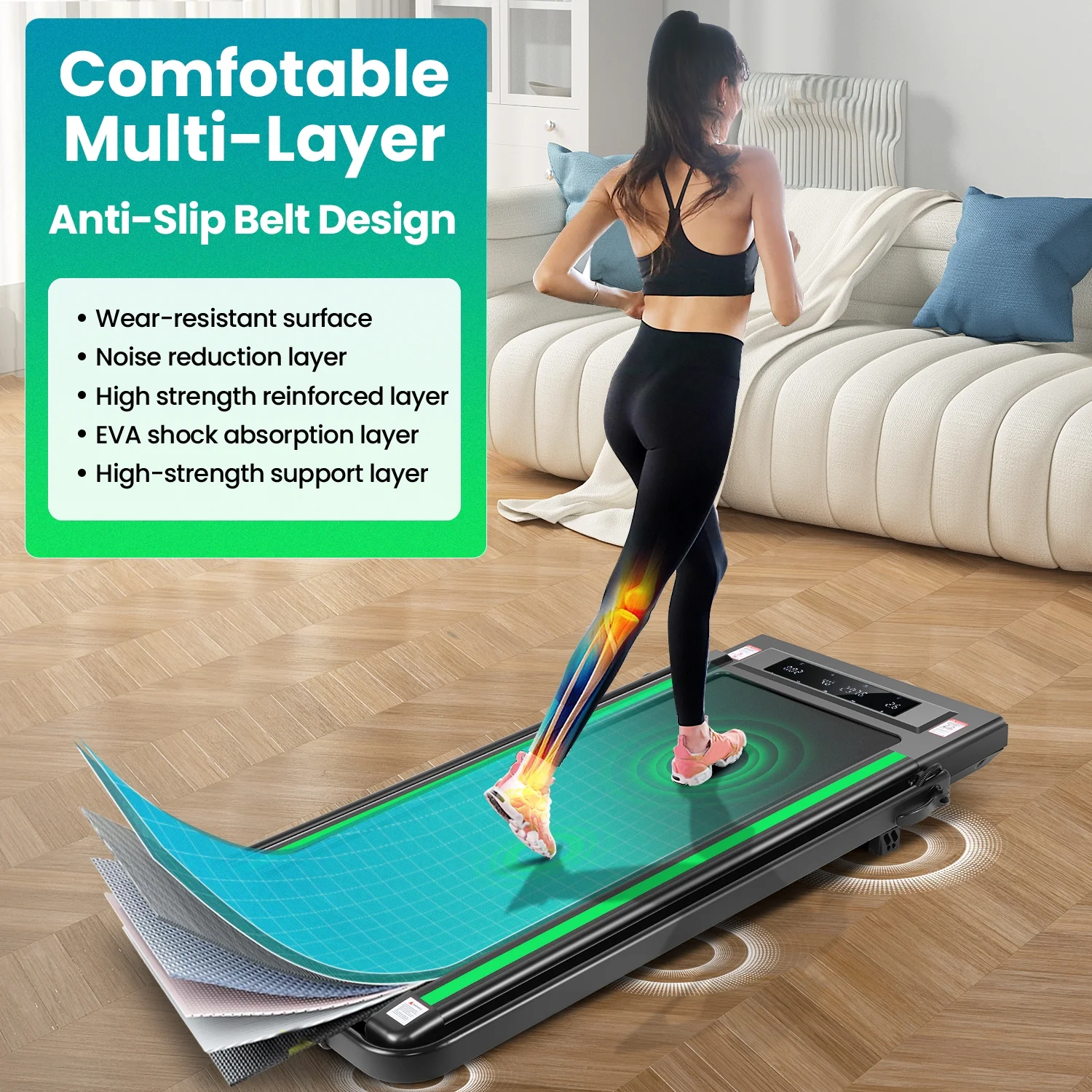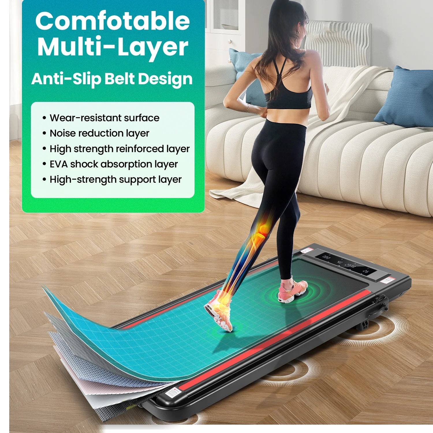 🚀 5.Wide Running Belt & Multi-Layer Treadmill Belt