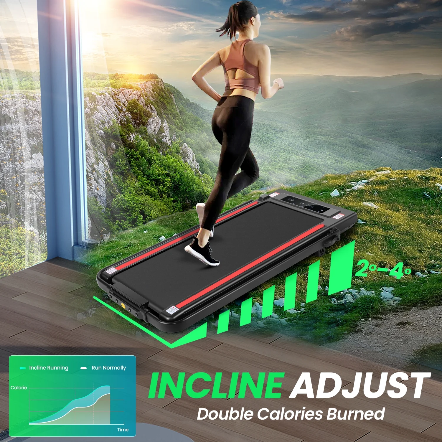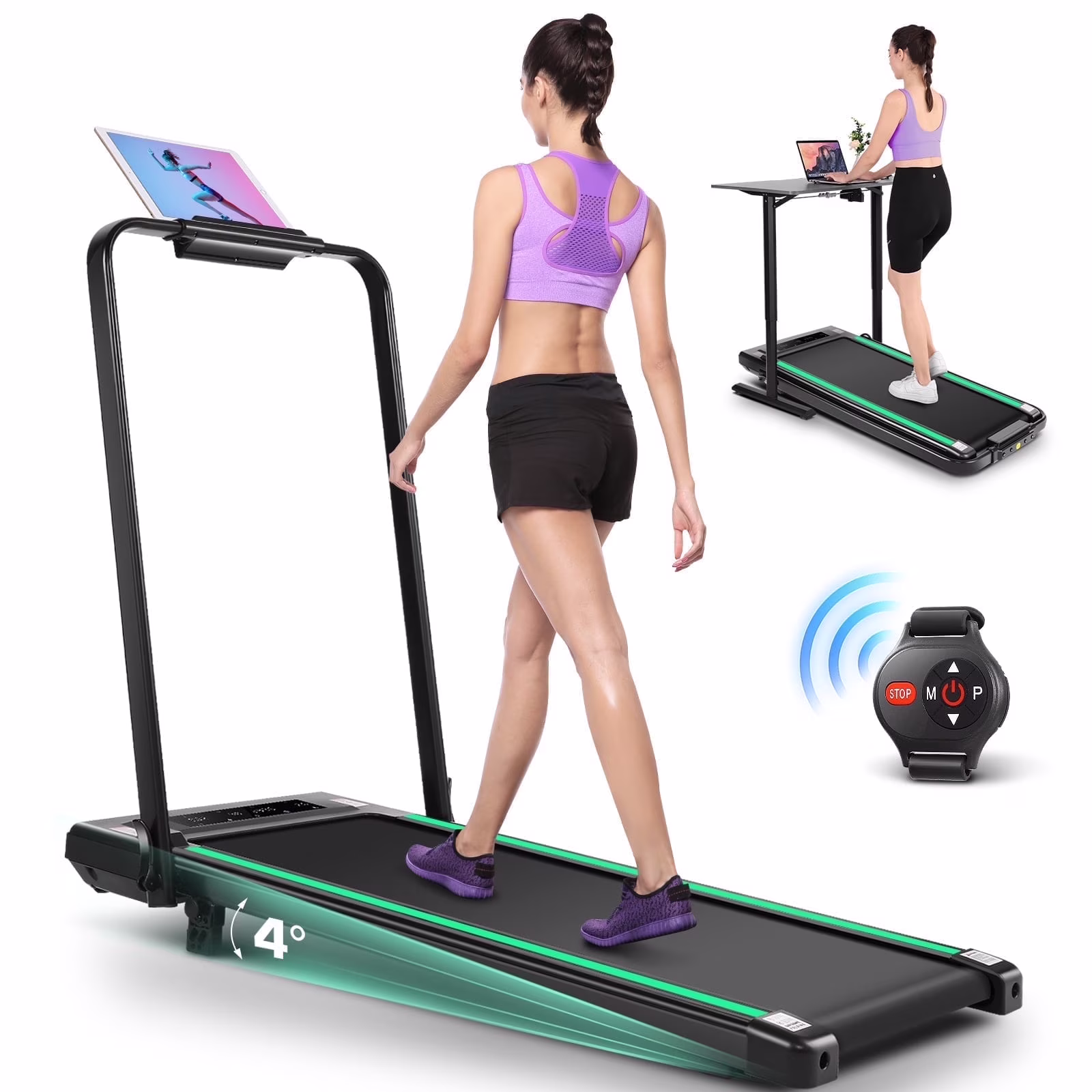 - 🏃♀️ Adjustable incline:The walking pad with incline and handle has a 4° slope adjustment function, which increases the diversity and challenge of exercise and is suitable for users with different fitness needs.