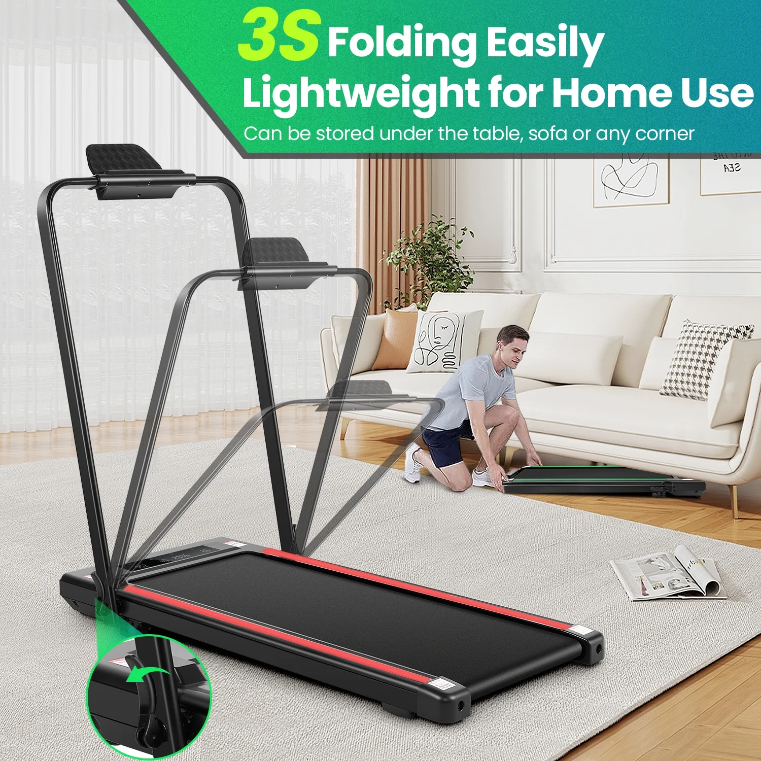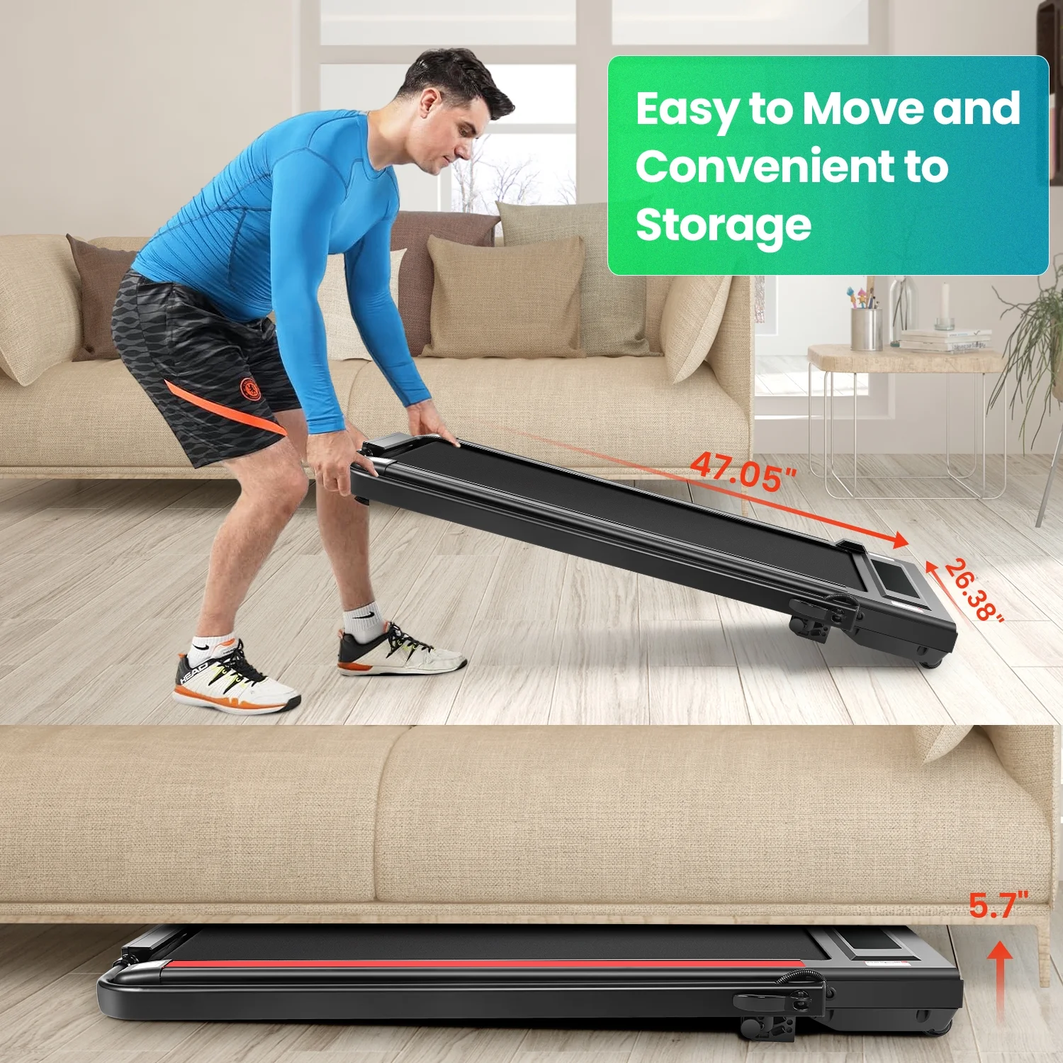 No assembly is required; the walking pad with incline can be used directly after unboxing. The one-step folding system allows the treadmill to be folded in just 2s. This walking mat is only 4.5 inches thick, allowing you to hide it under your couch or bed. The front transport wheels make it easy to move anywhere, making it perfect for homes, apartments, and offices.