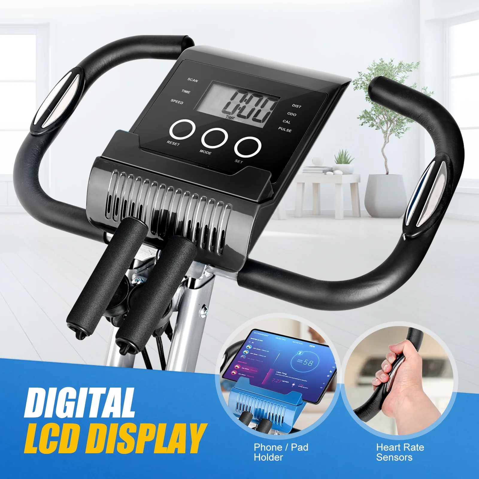 - 【LCD DISPLAY & PHONE HOLDER】 LCD monitor tracks your time, speed, calories burned, odometer, and pulse while you are cycling--to give you a more scientific exercise plan. You can place your phone or tablet on the holder to watch your favorite shows while exercising.