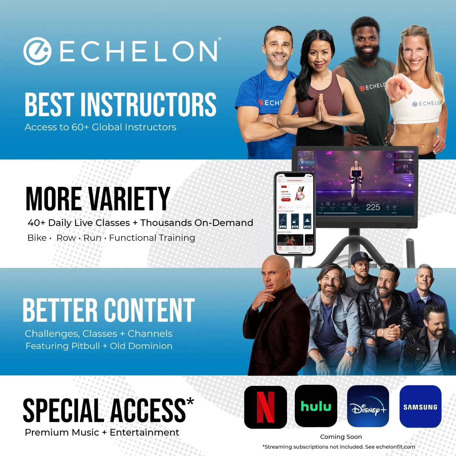 - FREE 90-day Echelon Premier Membership Enjoy 24/7 access to all Echelon instructor-led classes and exclusive content — all available through the Echelon Fit app.