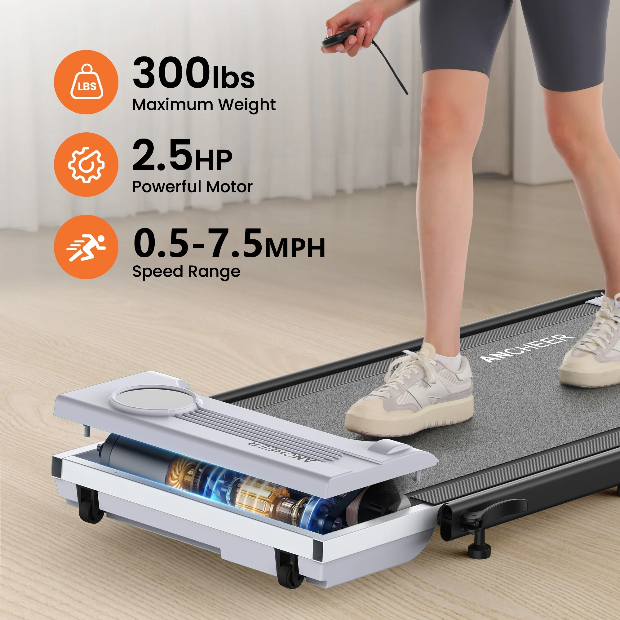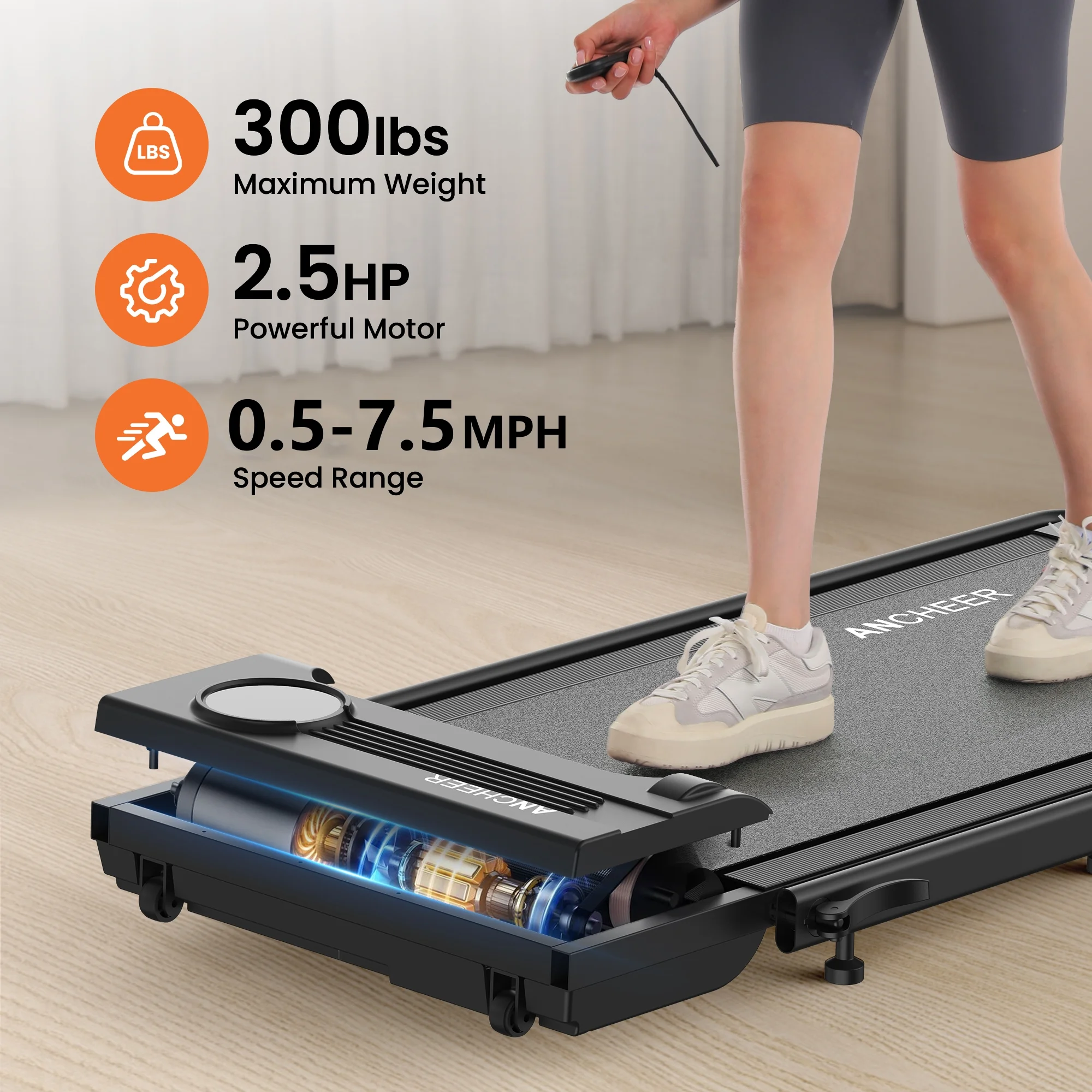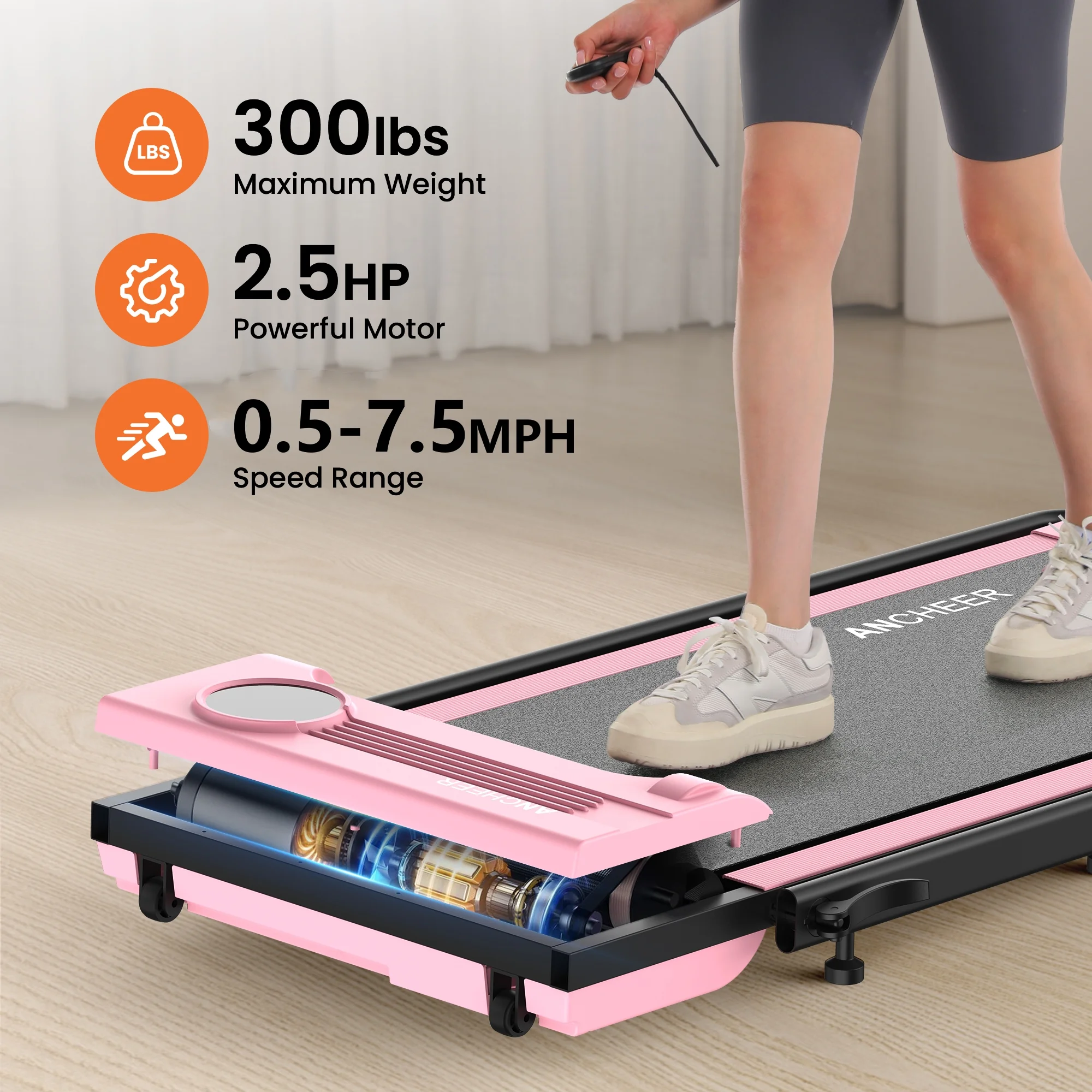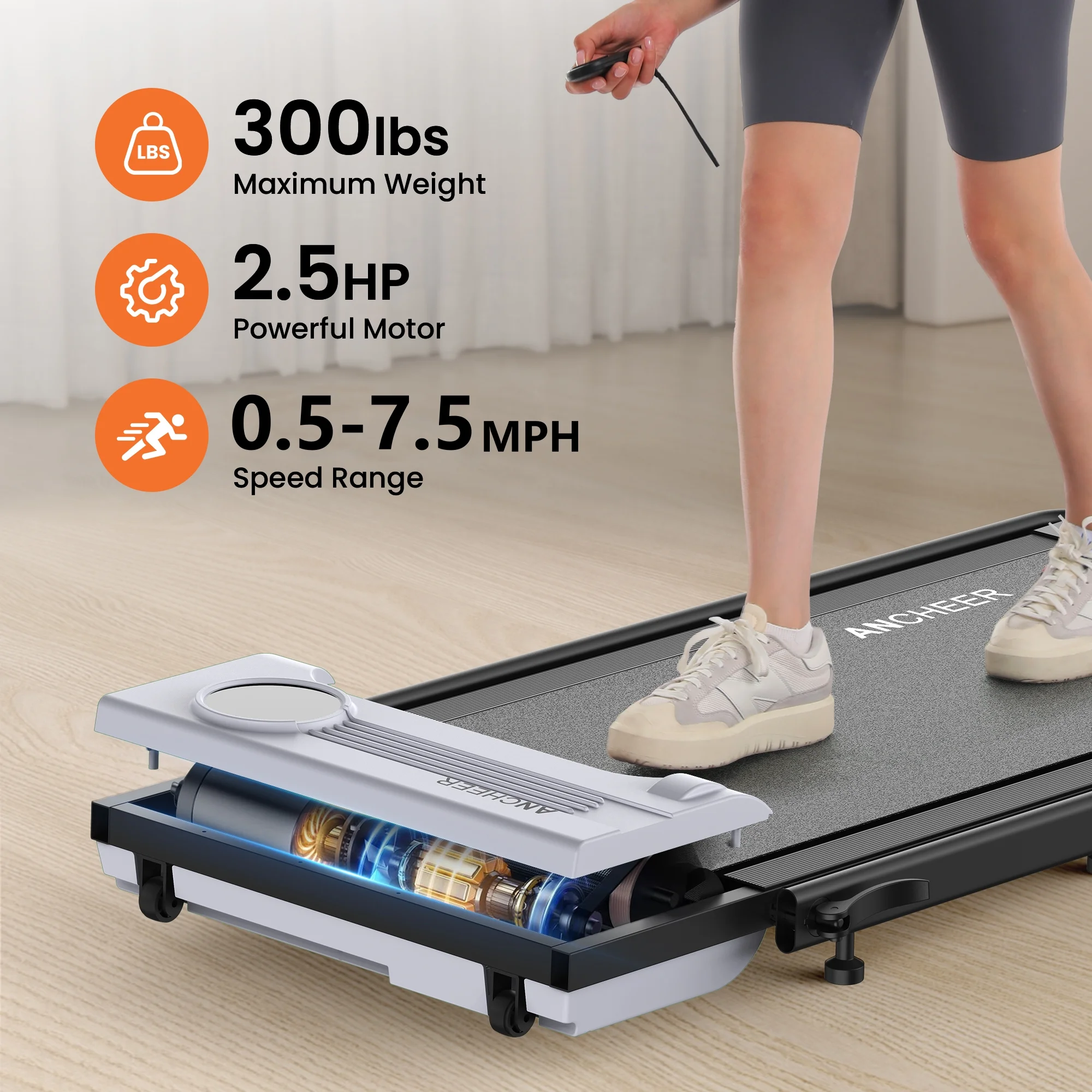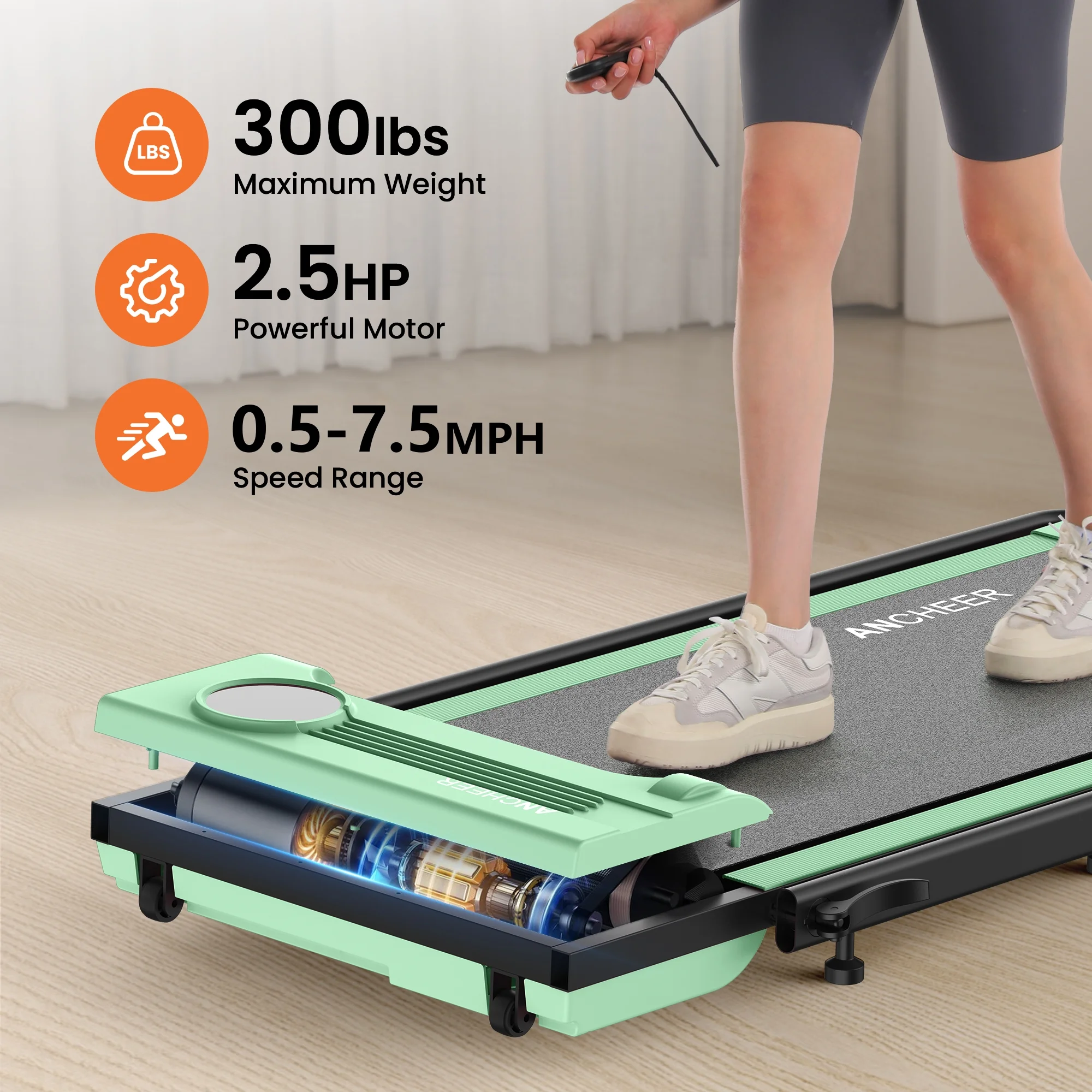 - [Upgraded 2 in 1 Folding Treadmill] The under desk treadmill is Featuring a powerful yet silent 2.5HP motor and a speed range adjustable from 0.5 to 7.5MPH. 2-in-1 treadmill comes with two exercise modes: walking pad mode (speeds from 0.5 to 4.0MPH) and a running mode (speeds from 0.5 to 7.5MPH). Versatile and convenient, this treadmill is perfect for homes, gyms, offices and under desk walking