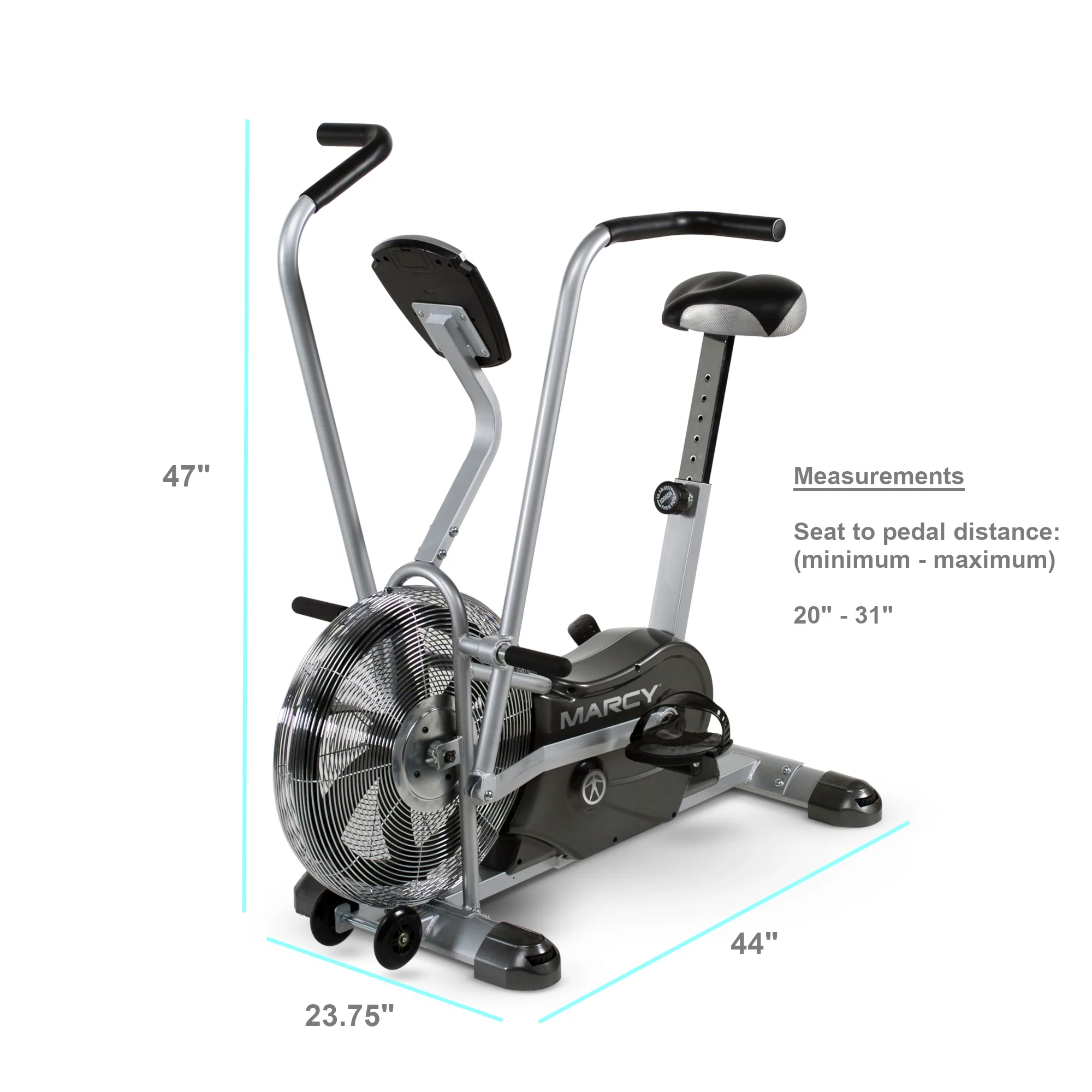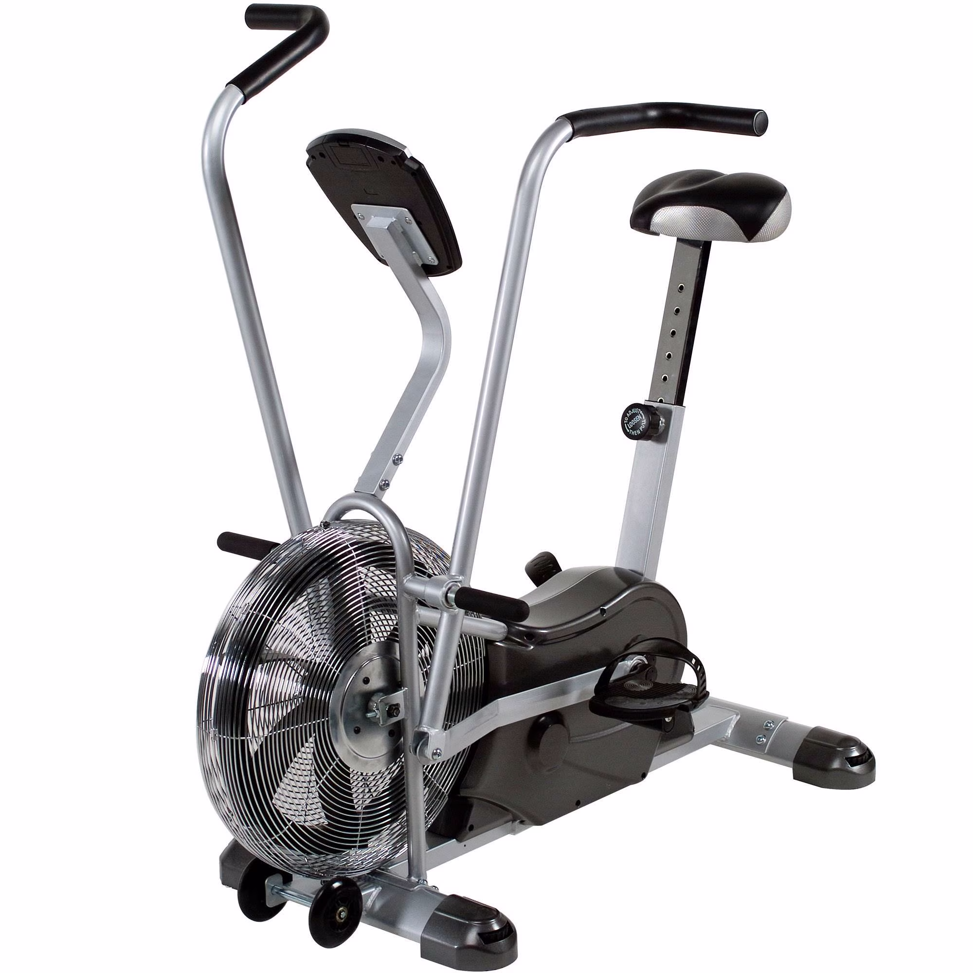 Get a total body workout without ever having to leave your home, thanks to the Marcy air fan fitness bike with exercise arms. This fan bike has dual action arms so your whole body gets a great sweat going. The monitor tracks and displays your workout time, current speed, distance biked, and the calories you've burned. The seat and handles are covered in foam for a more comfortable workout and you can adjust the height of the seat for the perfect amount of stretch. Move it around your home gym on the wheels and balance it on your floor with the adjustable levelers.