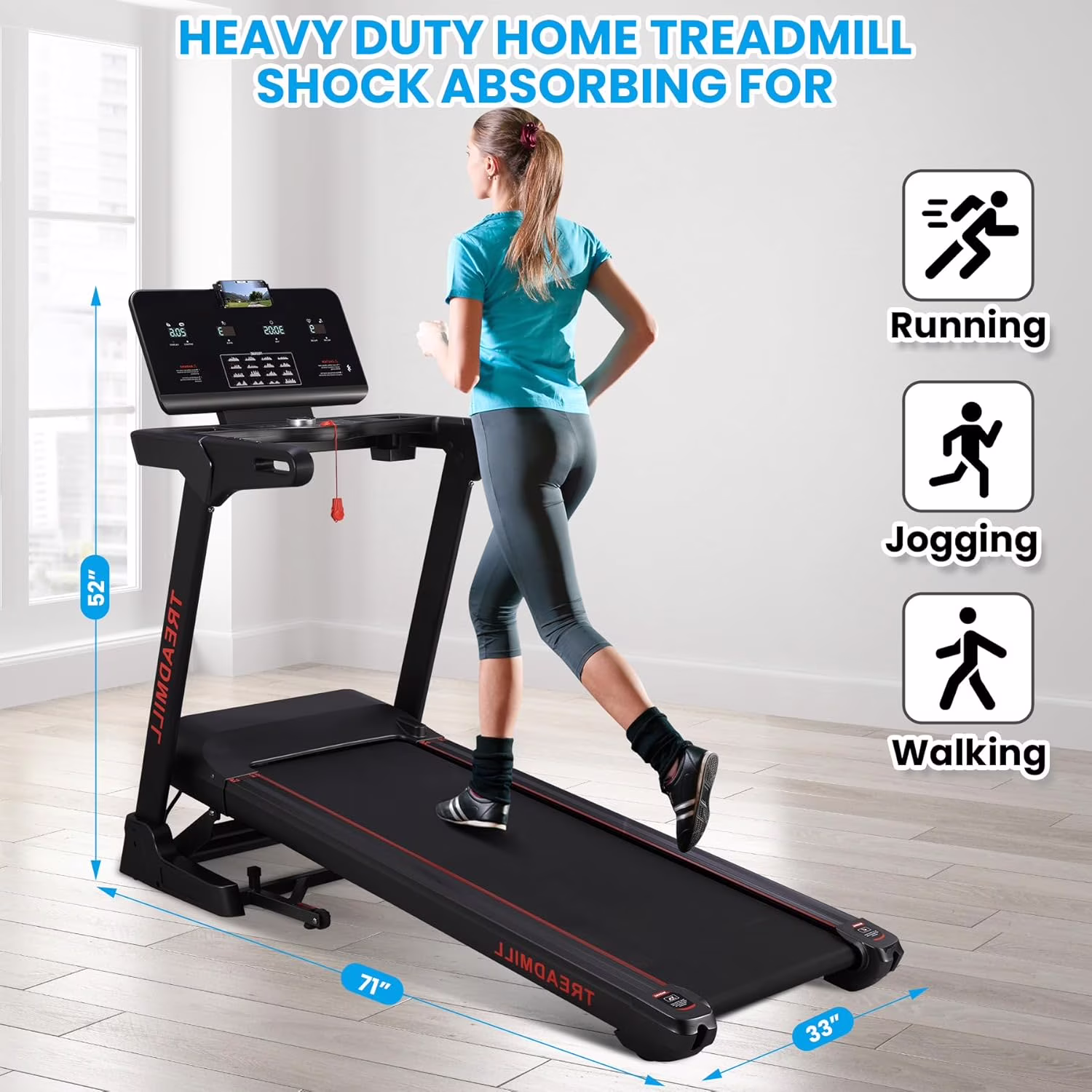 - Heavy-Duty Home Treadmill: This incline treadmill features a wide running belt measuring 56" x 20", providing ample space for a natural running stride; With a robust weight capacity of 350 lbs, the electric treadmill supports users of various sizes