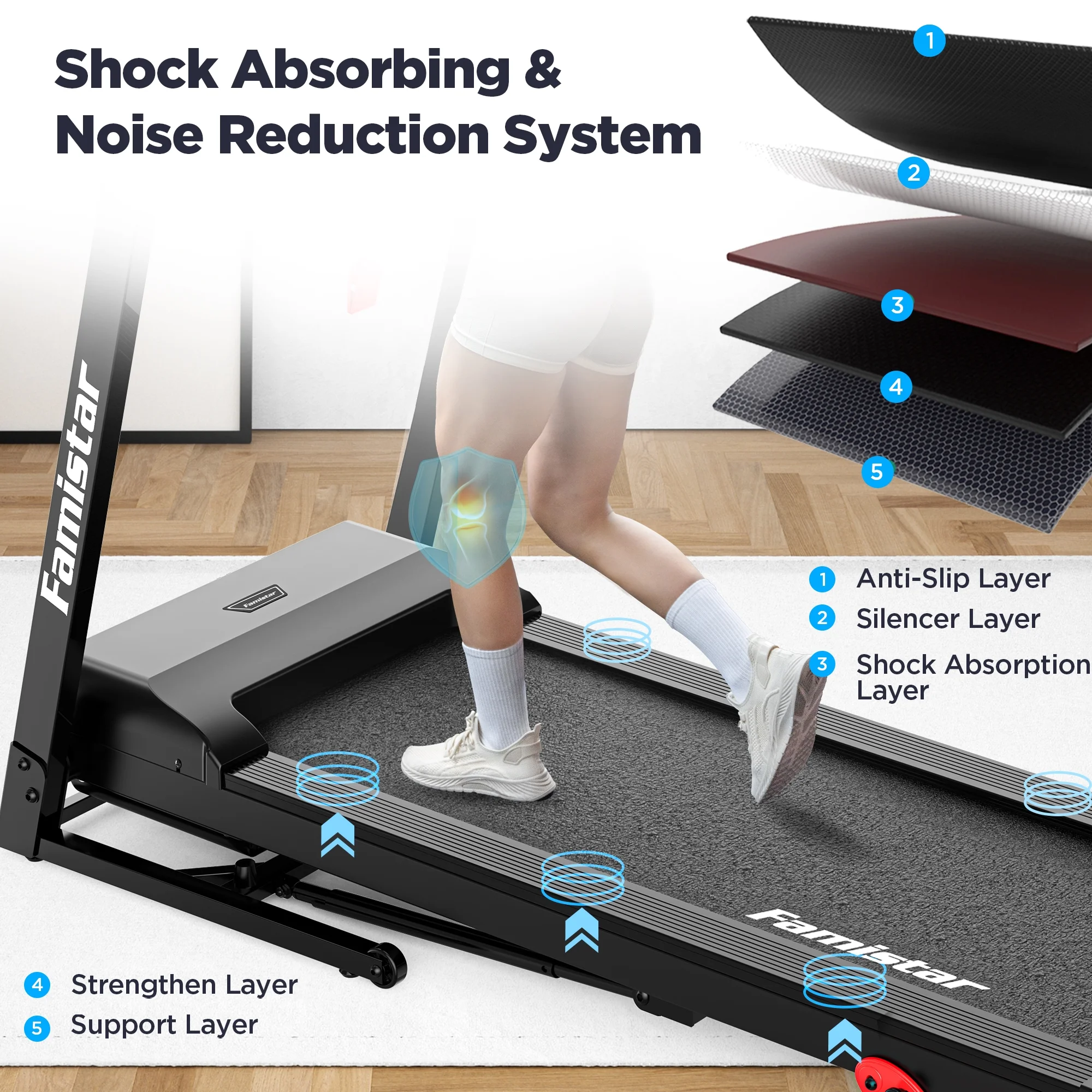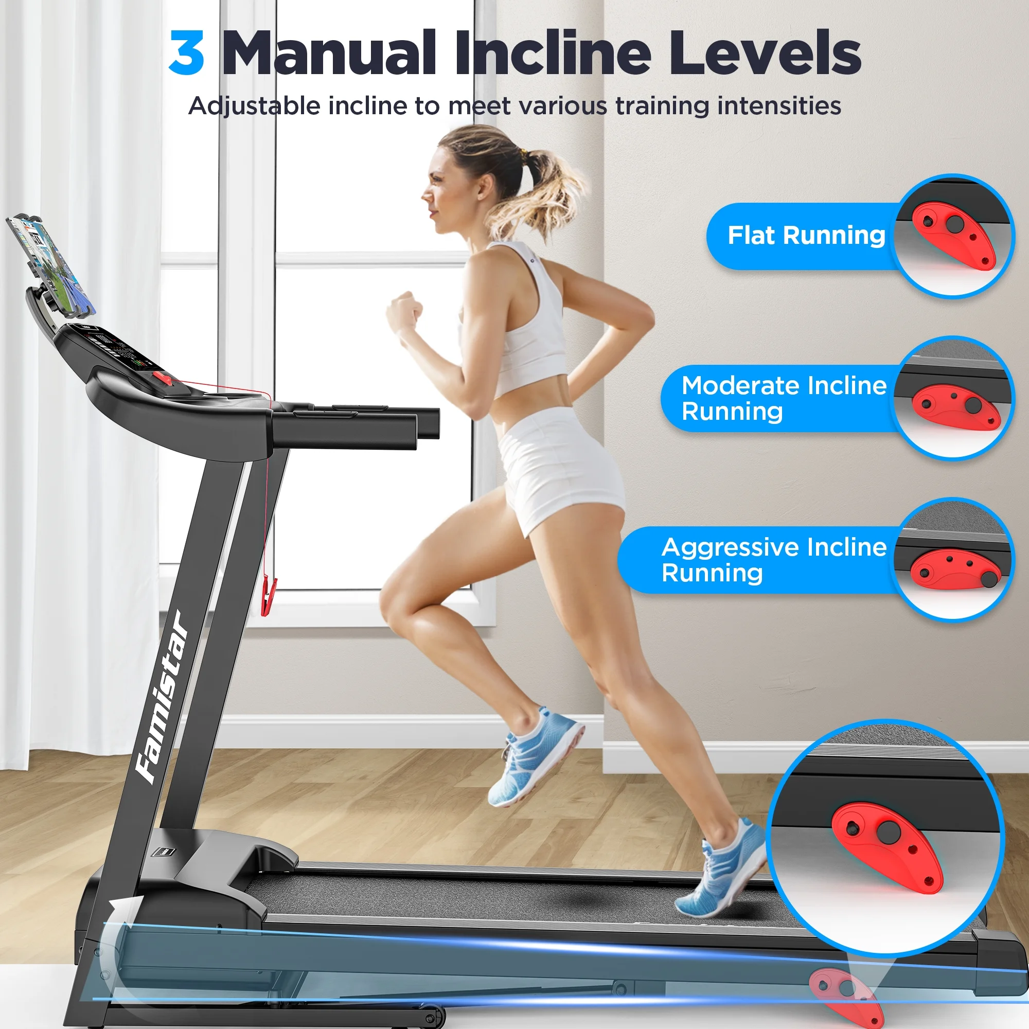 While ensuring stability and durability, the sturdy 2.5 HP motor of folding treadmill can reach speeds of up to 7.5MPH, plus three levels of manually adjustable incline to meet your various fitness intensity needs. The cushioned running belt and noise-reducing motor provide a track-like running experience without disturbing others.
