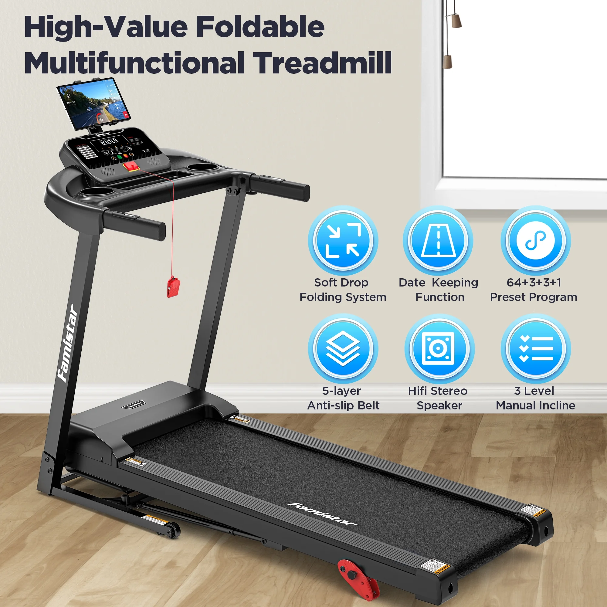 - 🛋️ Comprehensive Workout: The multi-functional LCD provides clear data visibility, allowing for direct monitoring. With 64 built-in presets, users can range from beginners to high-intensity workouts. 3 distinct user modes and 3 countdown modes cater to different exercise needs. The treadmill also supports body fat measurement and pause memory, eliminating the need for tedious resets during short interruptions.
