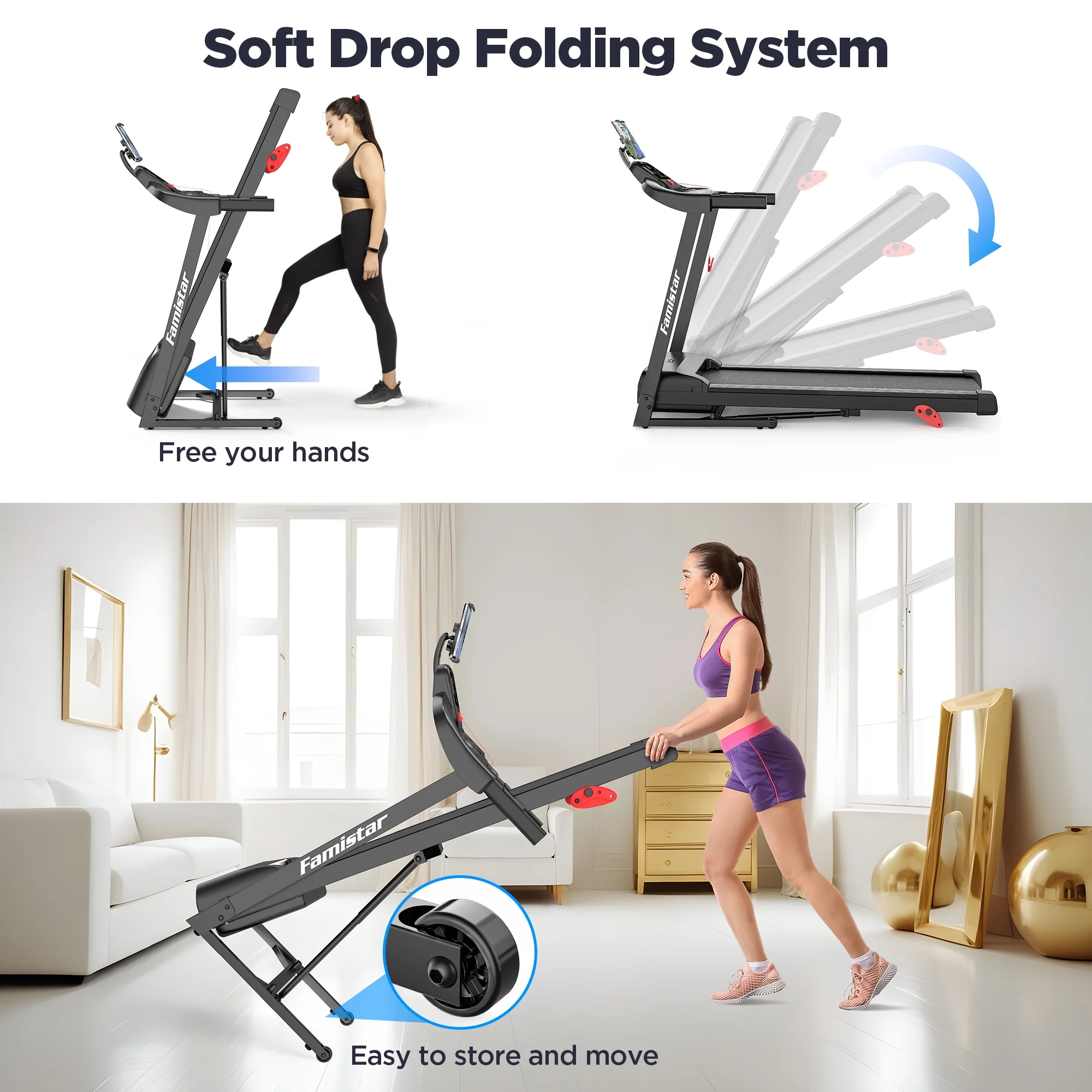 Our portable home treadmill is easy to assemble. We pre-assemble it 90% before shipping it to you. The advanced soft-fall system allows you to unfold the motorized treadmill with just a flick of the hydraulic lever. It also folds up easily when not in use, so you don't have to worry about it taking up space in your home. And with the convenient transport wheels, you don't have to worry about damaging floors or struggling to move it.