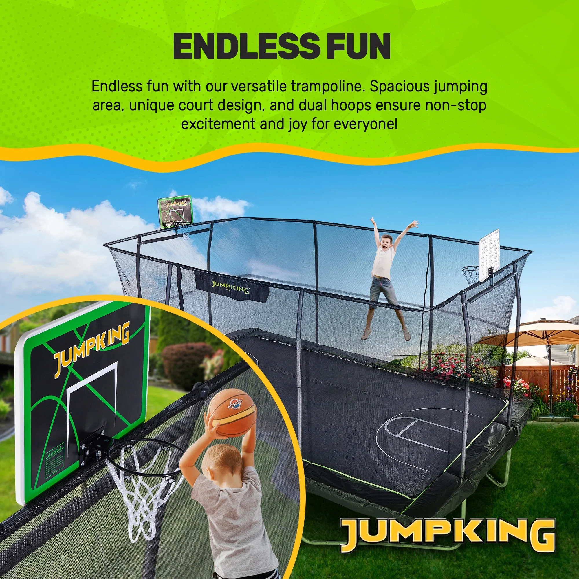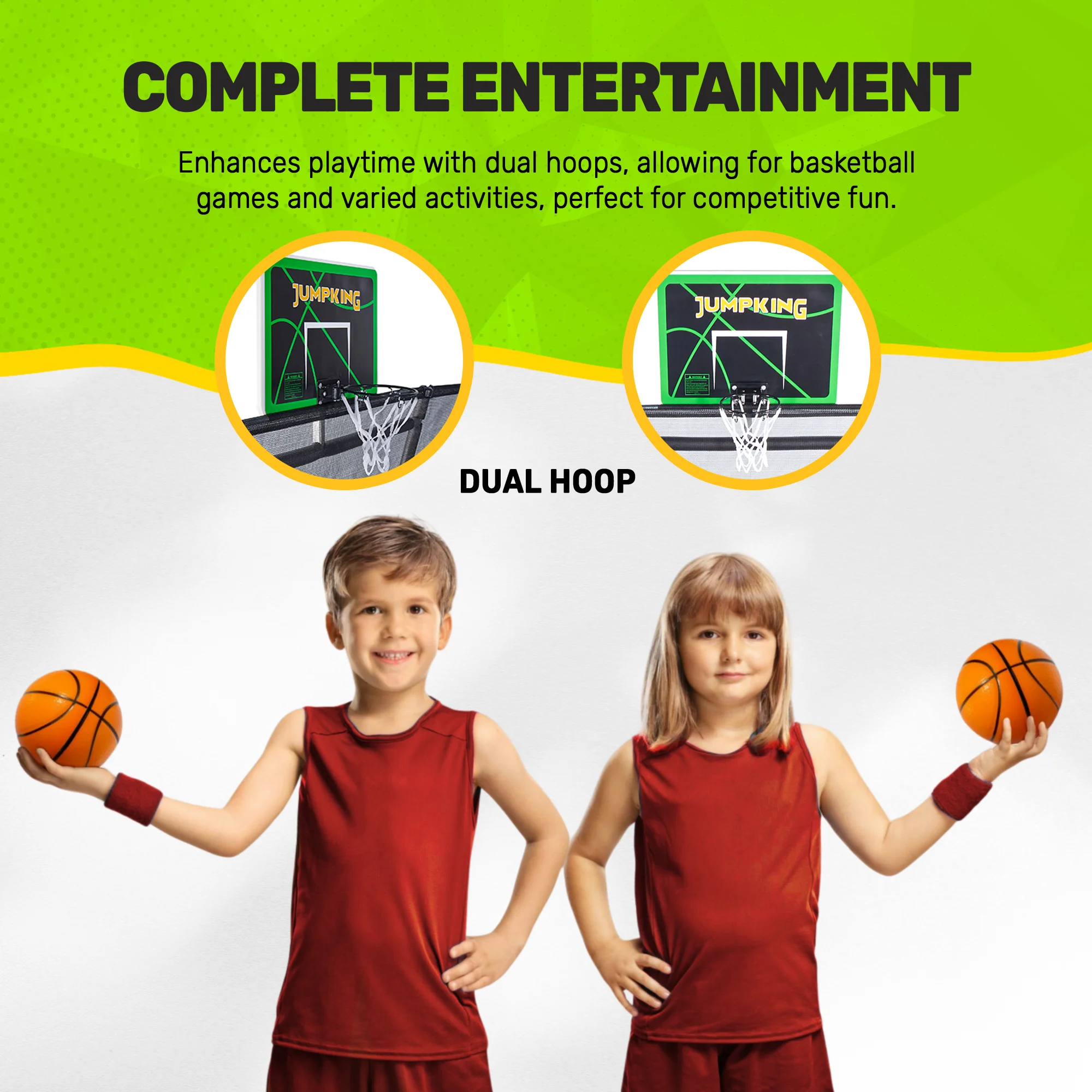 - Innovative jumping surface with basketball hoop: Our aerodynamic jumping surface, complete with a printed court design, offers durability and optimal bounce. The integrated Powder coated breakaway basketball hoop adds extra fun, turning every jump into an exciting game. With a spacious area of approximately 126 sqft, it’s ideal for fitness enthusiasts, kids, and family playtime.