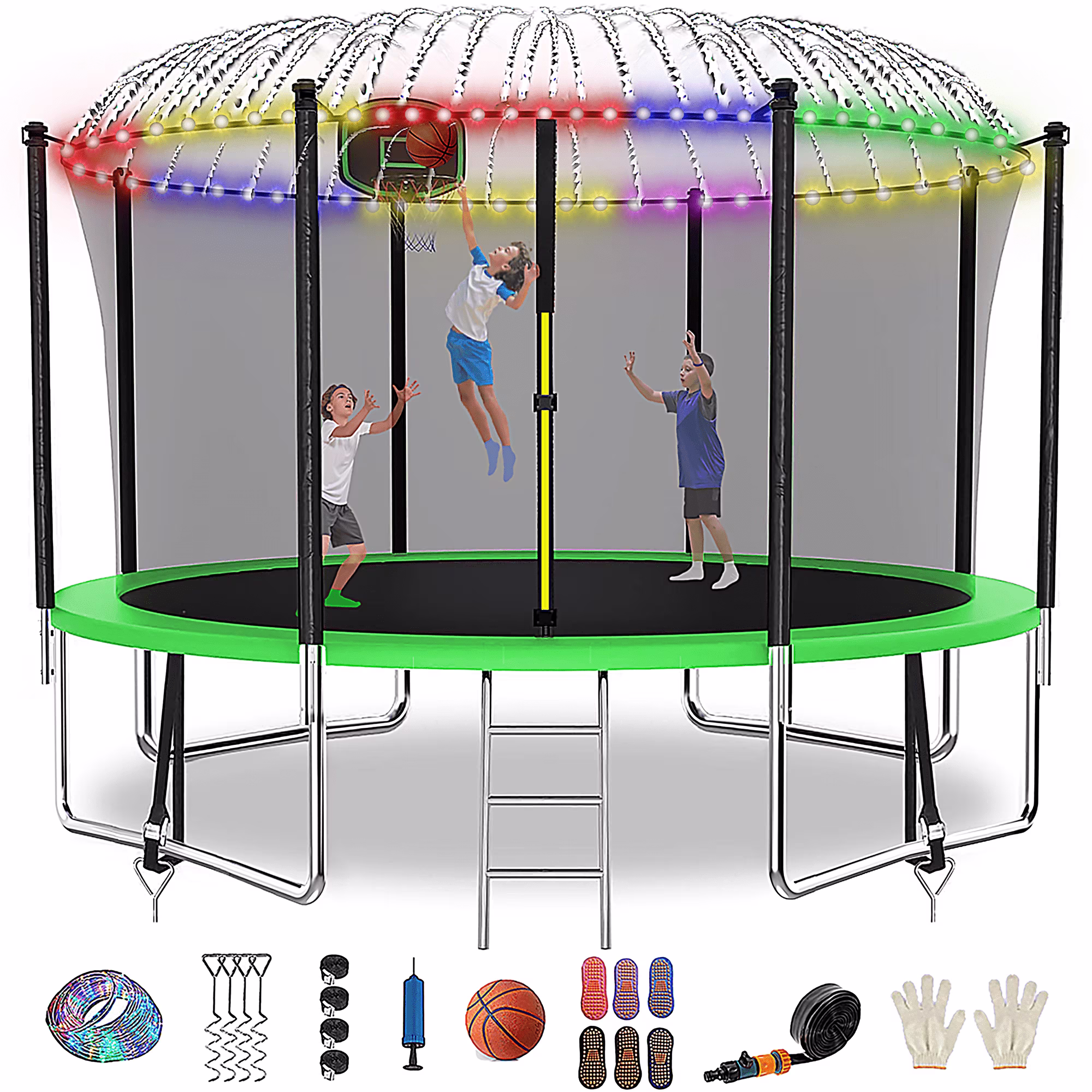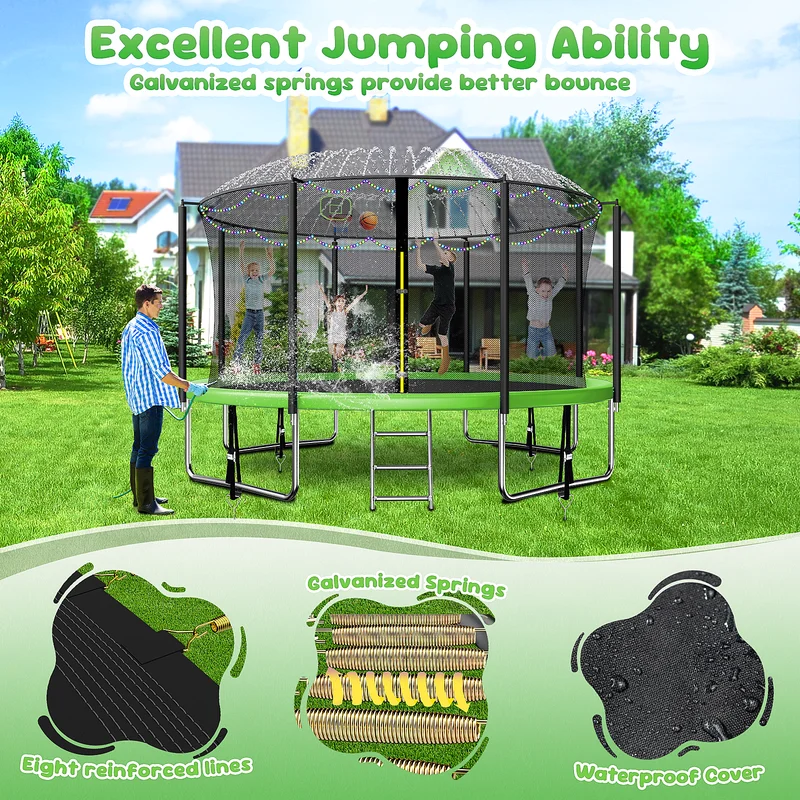 Our outdoor trampoline provides 1* rubber ball+ inflator,1*sprinkler,1* LED light,6 socks,6*wind stakes straps combination. The wind stakes twist deep into the ground for the highest level of trampoline stability, help protect your trampoline during stormy/windy conditions, safely secure the trampoline to the ground. Strong belt straps easily connect to the steel buckles for fast assembly and disassembly. Playing rubber ball can improve kids' motor coordination, ideal as the best gift for kids.
