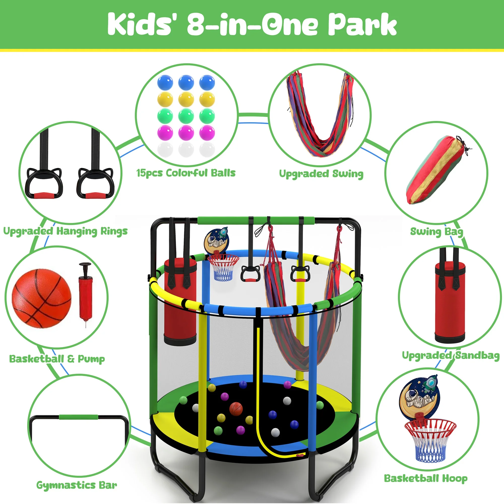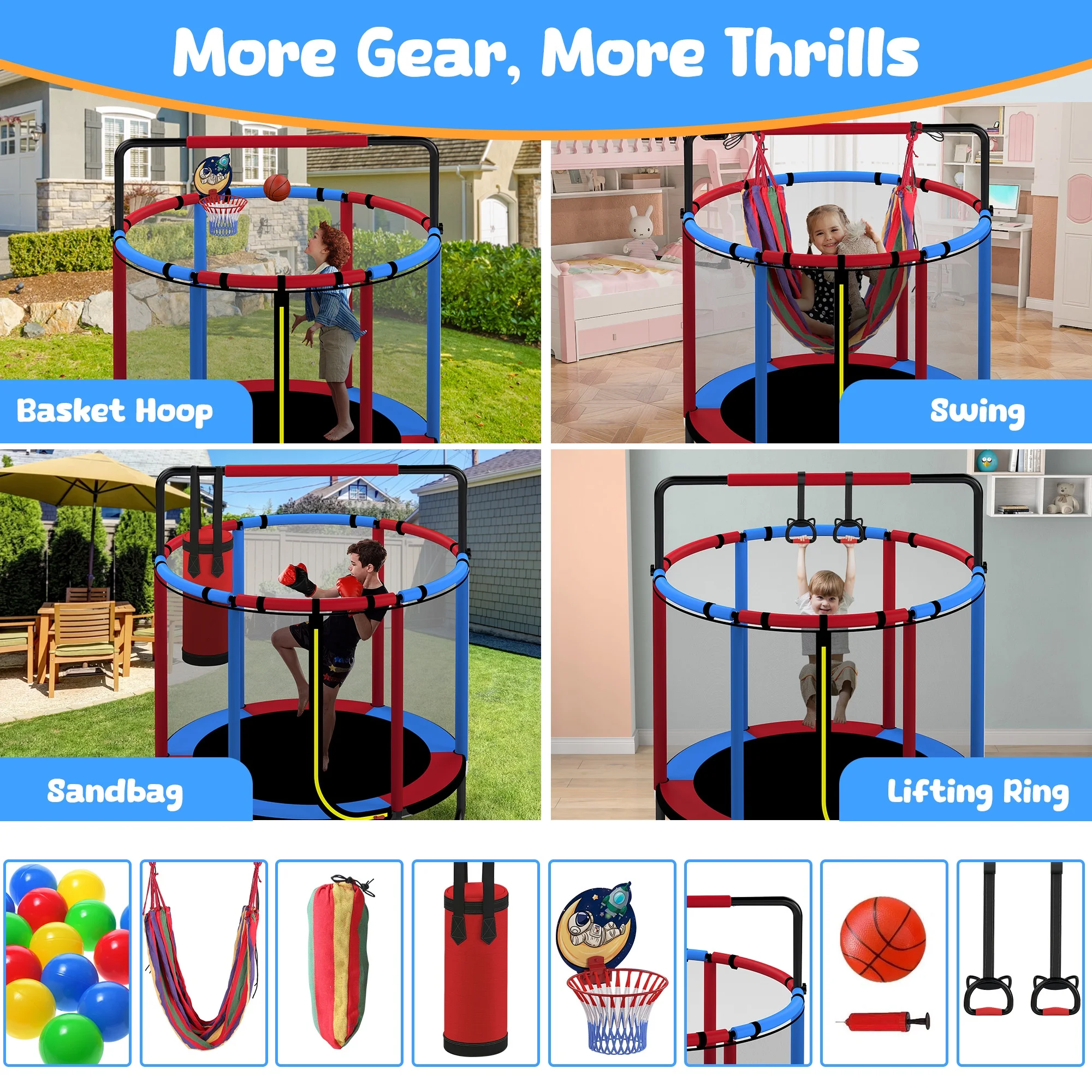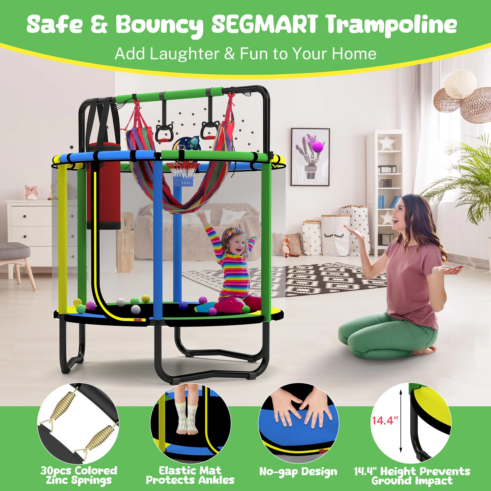 The Segmart upgraded 55'' trampoline comes with 7 exciting accessories: 1 basketball hoop & rubber ball, and a pump, 1 swing, 1 swing bag, 1 sandbag, 1 gymnastic bar, 2 lifting rings, 15 ocean balls.