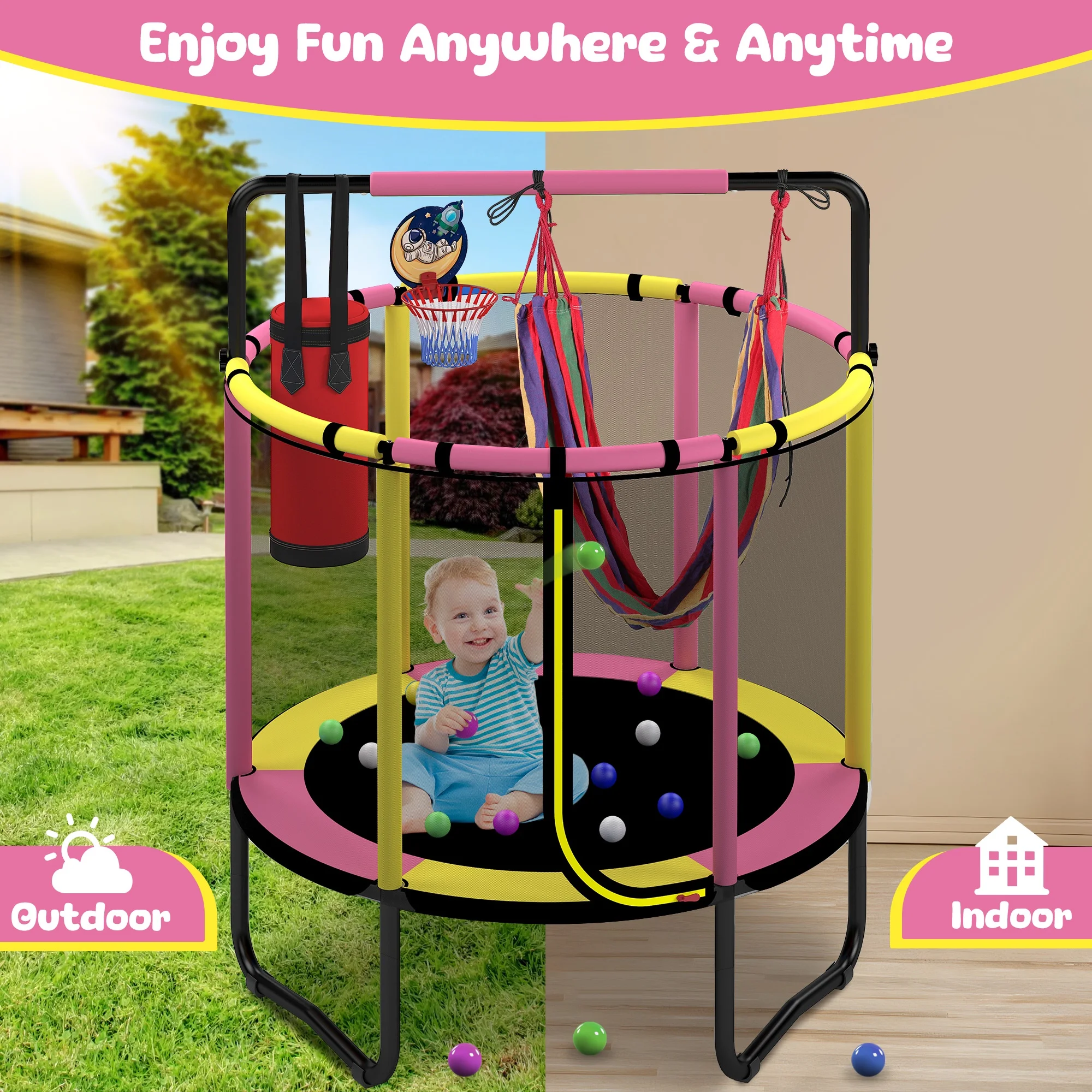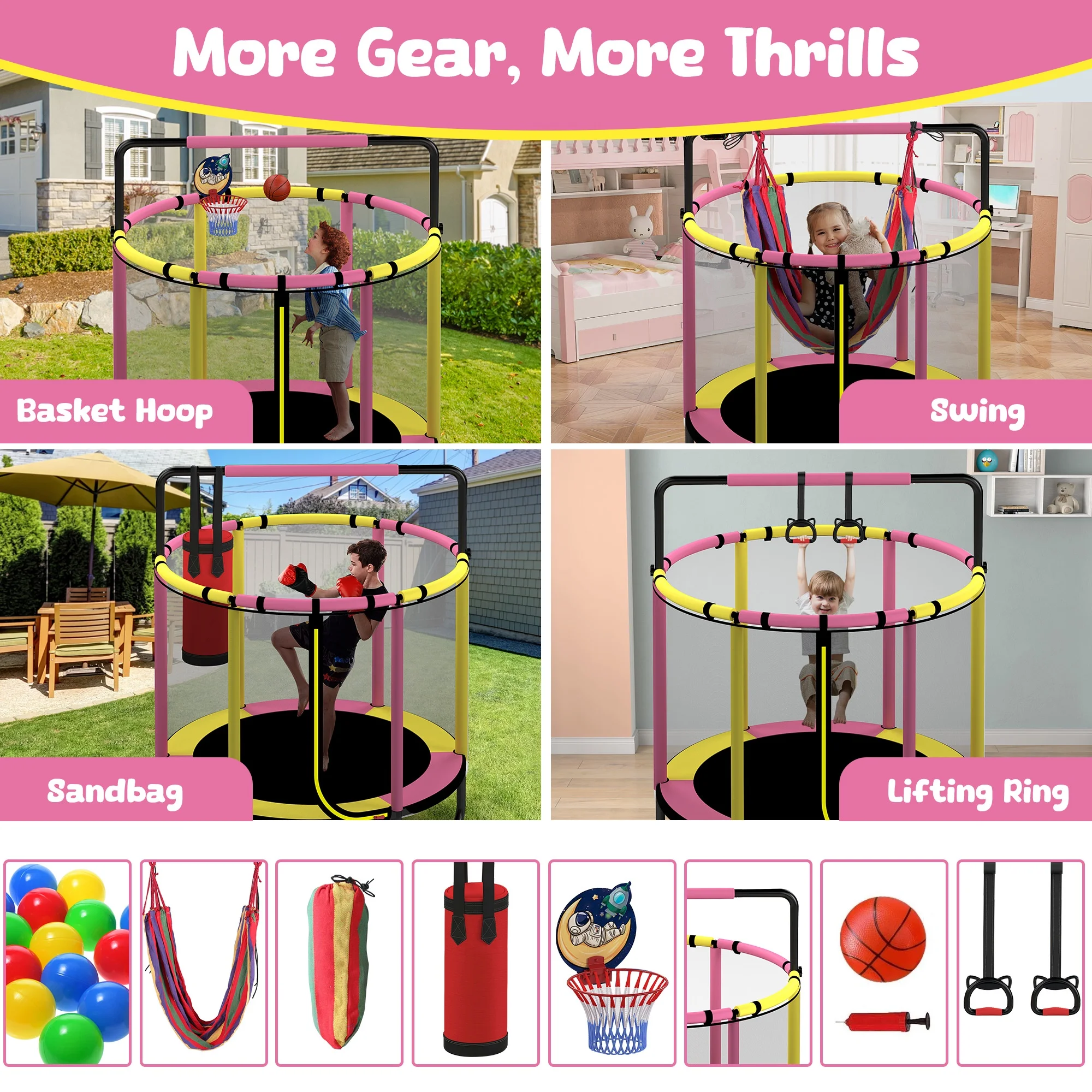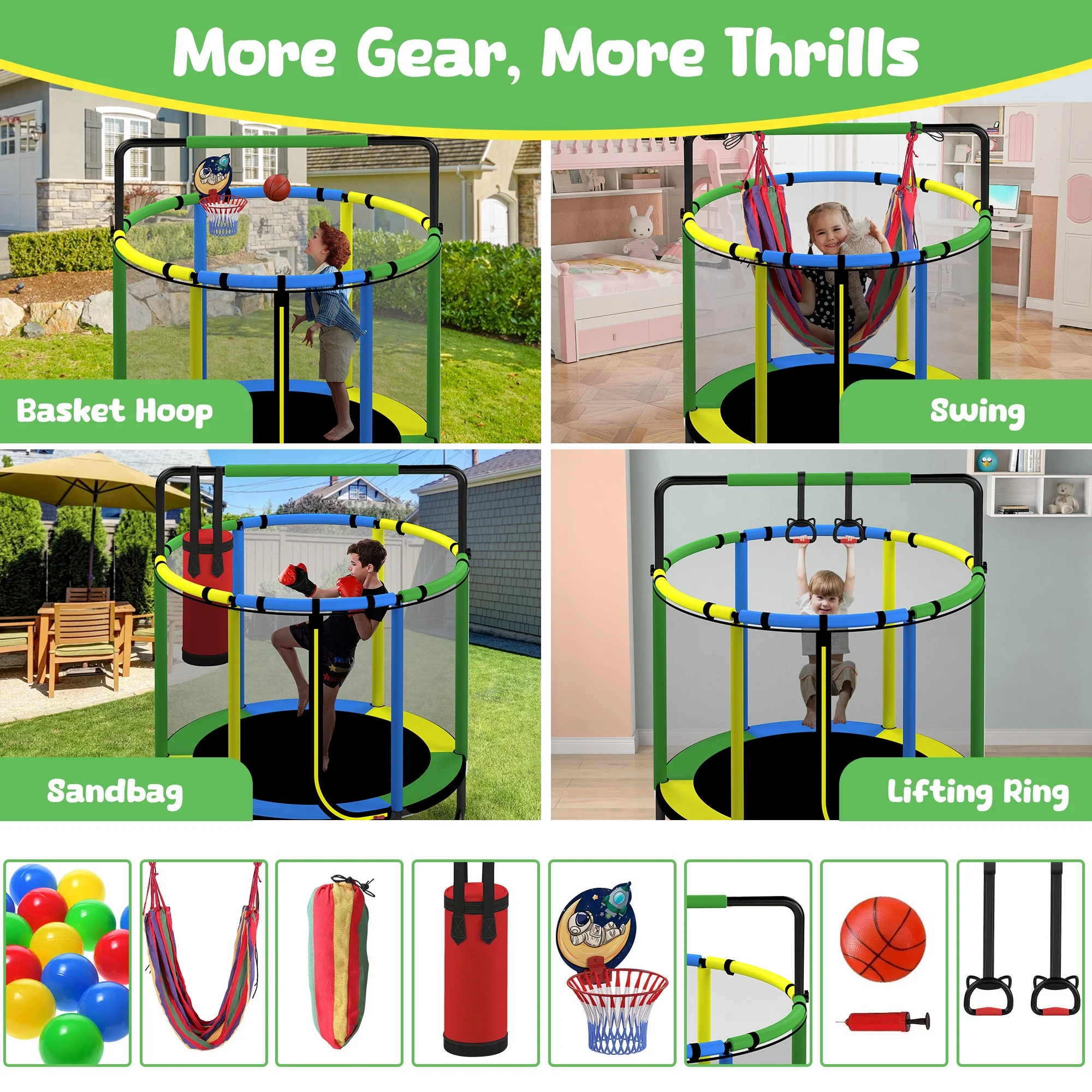 The Segmart upgraded 55'' trampoline comes with 7 exciting accessories: 1 basketball hoop & rubber ball, and a pump, 1 swing, 1 swing bag, 1 sandbag, 1 gymnastic bar, 2 lifting rings, 15 ocean balls.