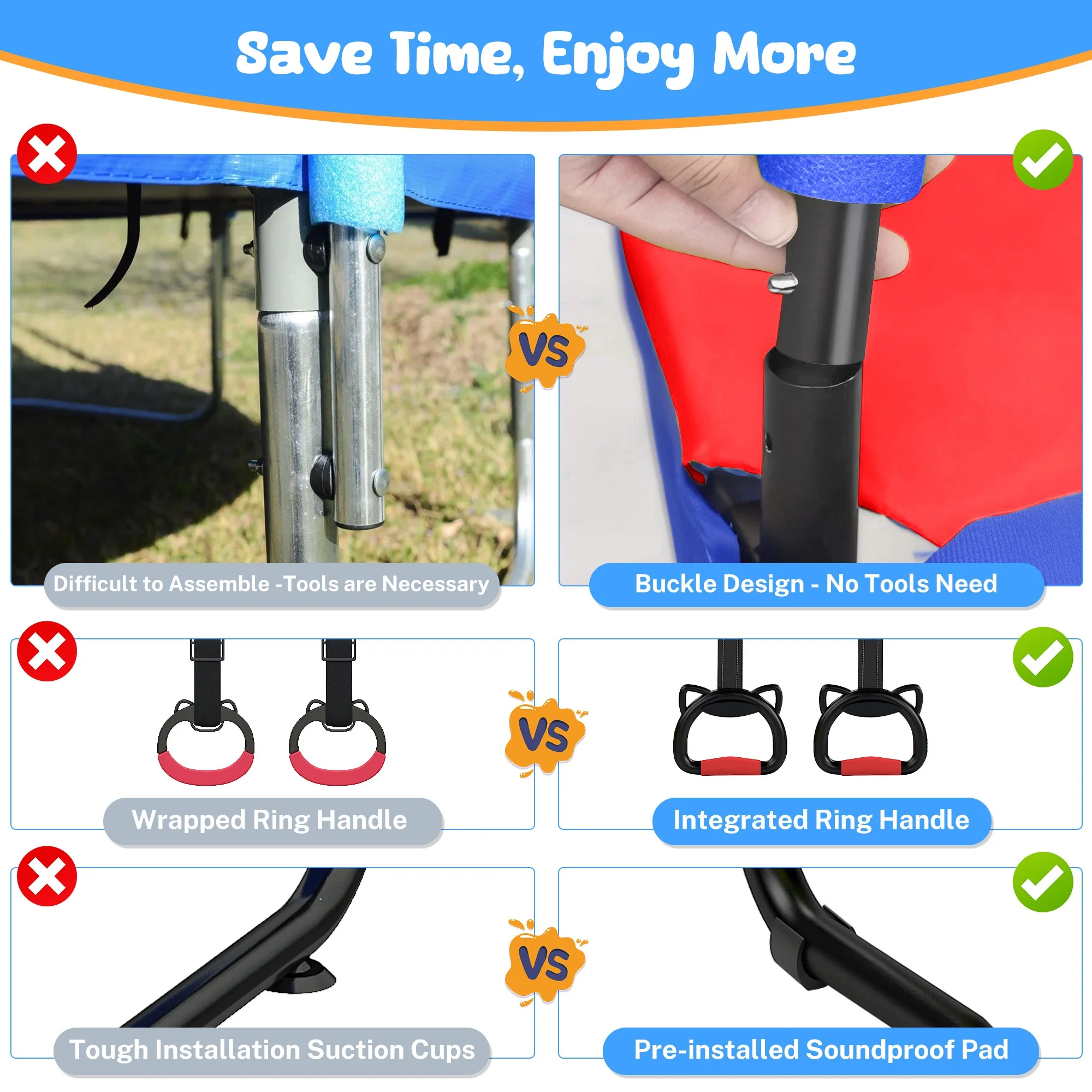 The Segmart upgraded 55'' trampoline makes setup a breeze. No tools are needed with our buckle design. The improved ring handle and pre-installed soundproof pads ensure hassle-free installation.