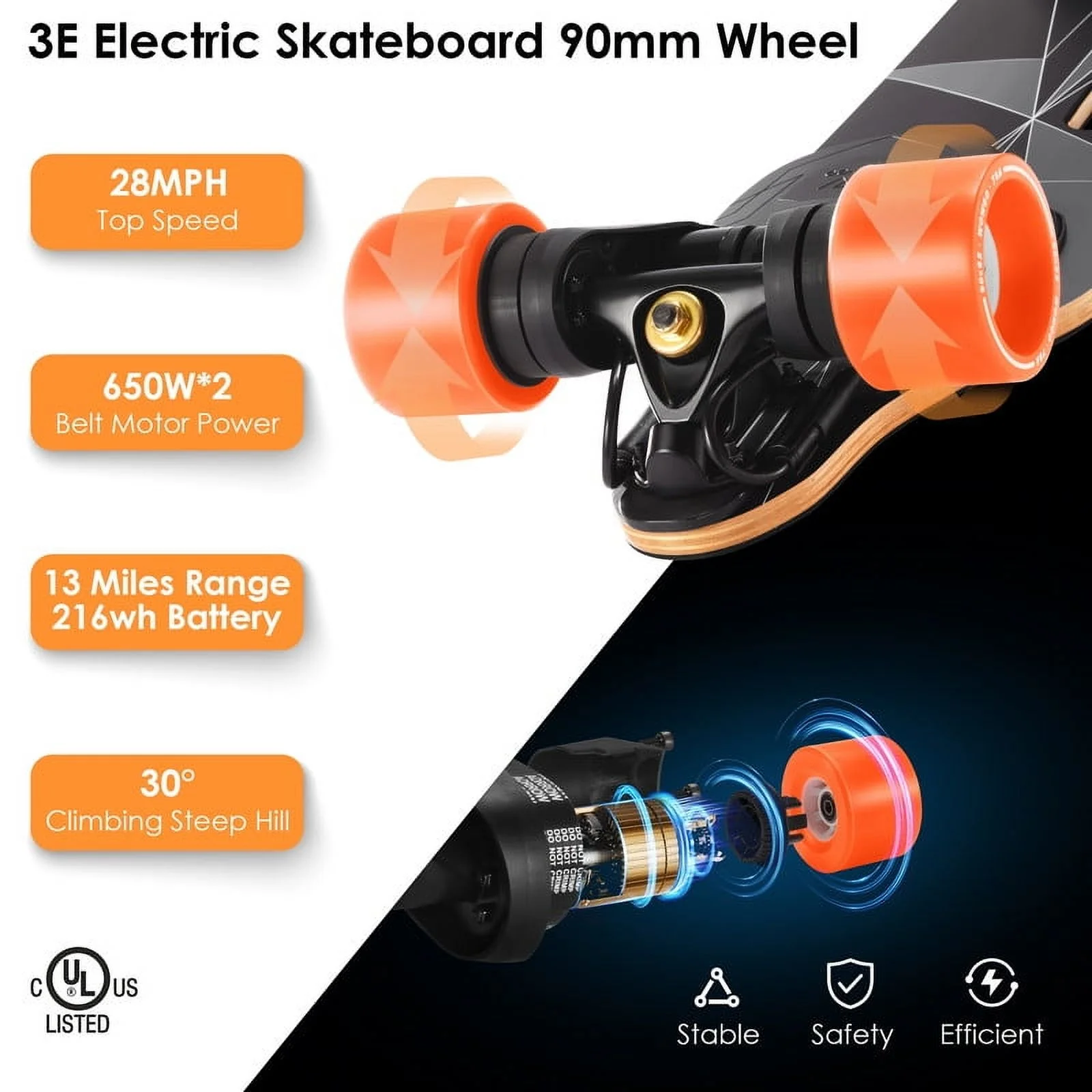 - Brushless Motors with Ultimate Performance: Assembled with dual 650W belt motors, this e-skateboard reaches top speeds of 28-30 MPH, making it ideal for commuting without traffic jams. Certified with UL 2272 standard for safety