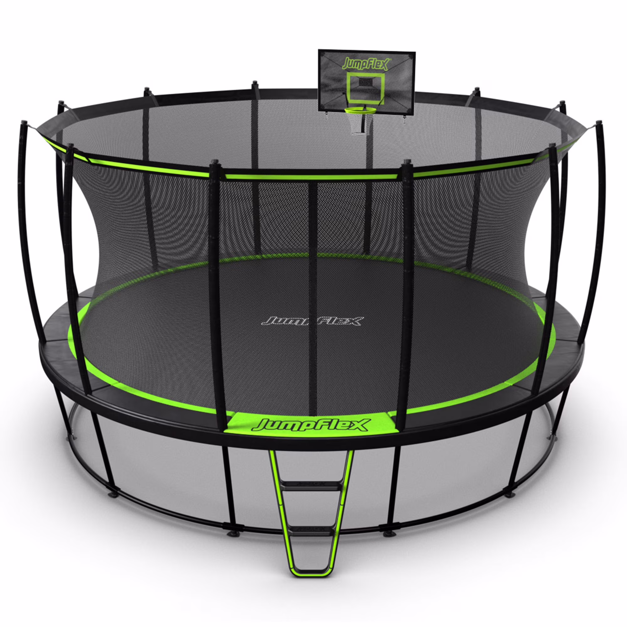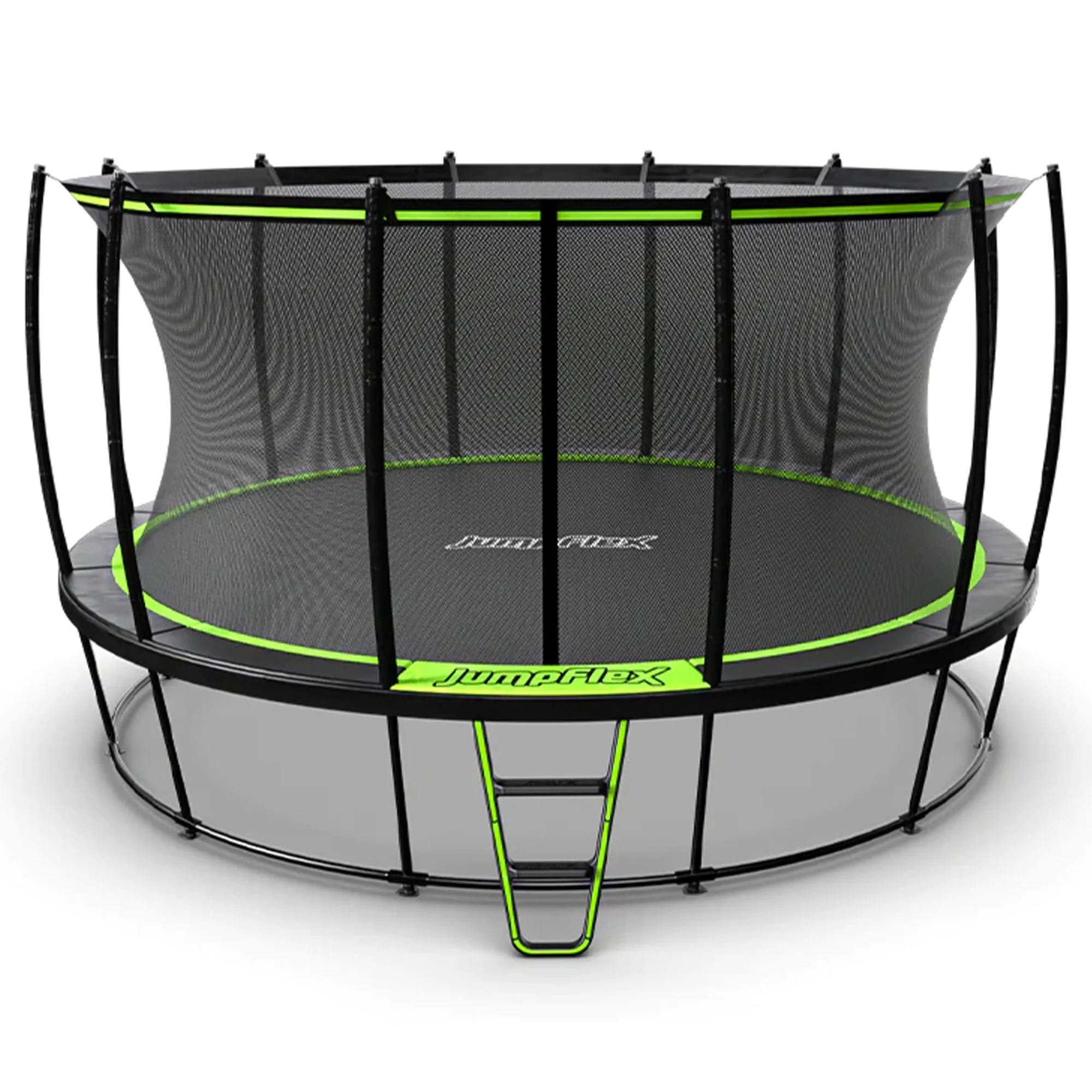 - 360-degree net enclosure securely clips down to the jumping mat; Ladder provides easy entry and exit for all jumpers