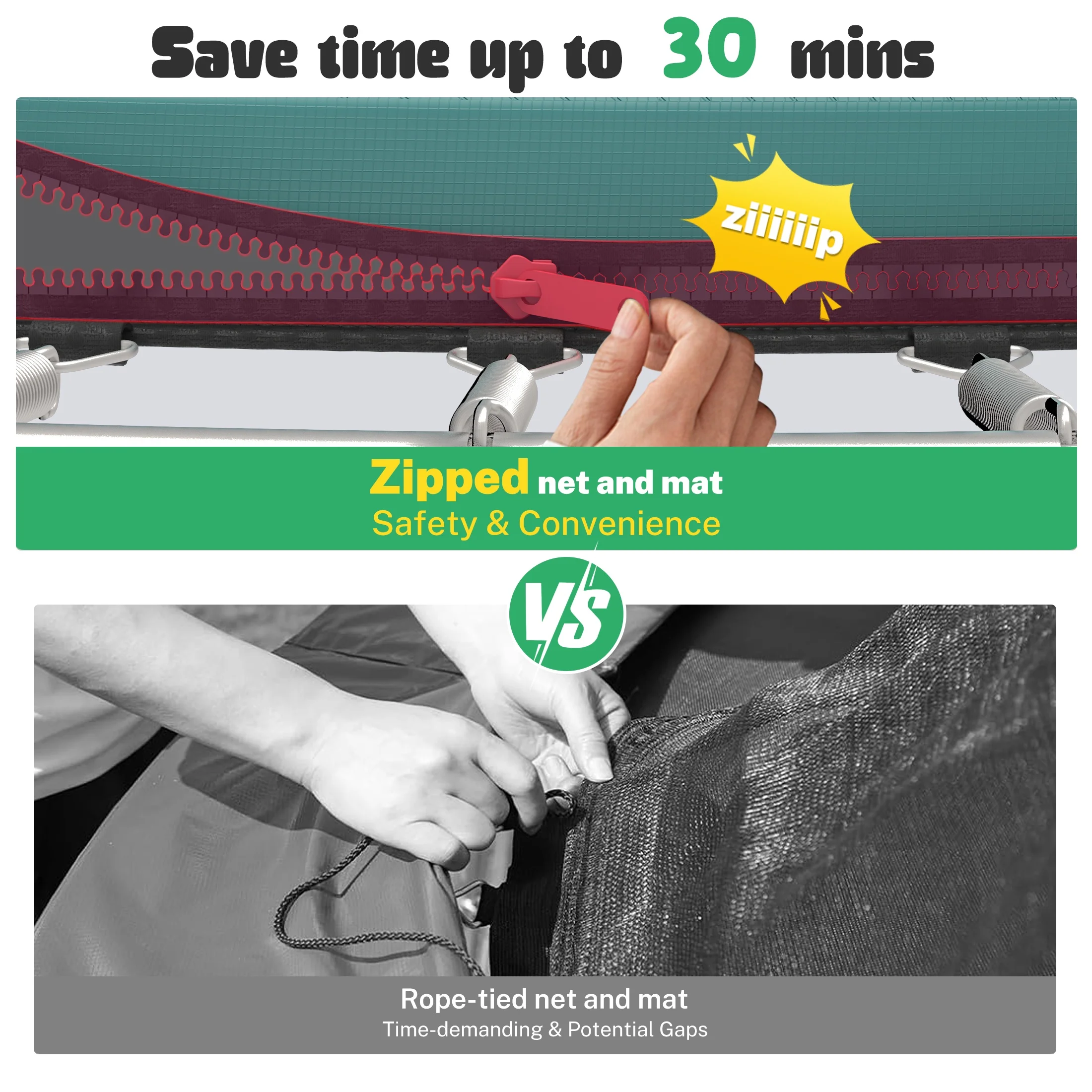 - Smart Zipper System: Pre-attached safety net and jump cloth mean you’re ready to bounce in no time—five times faster than traditional setups! Just clip and enjoy.