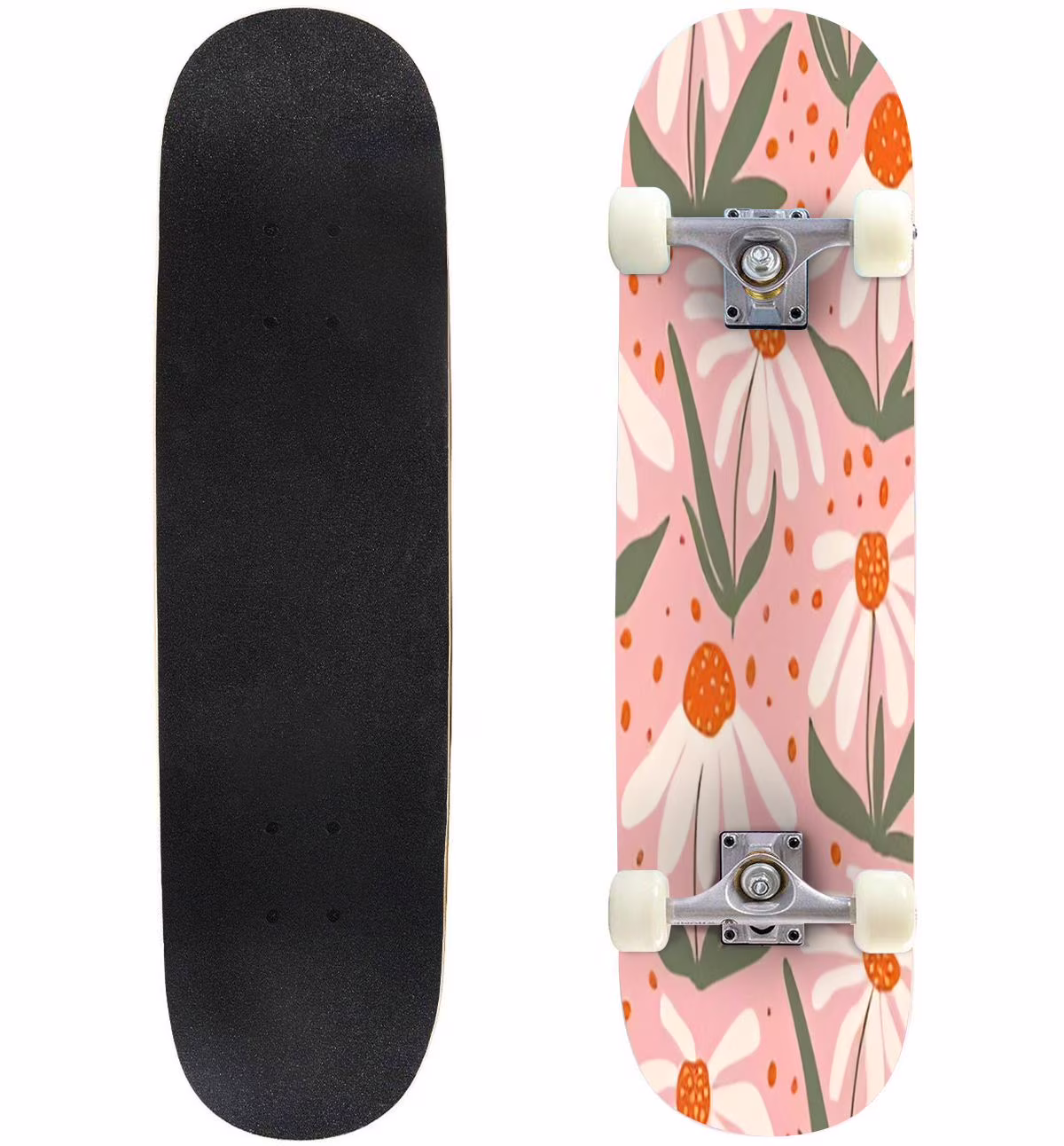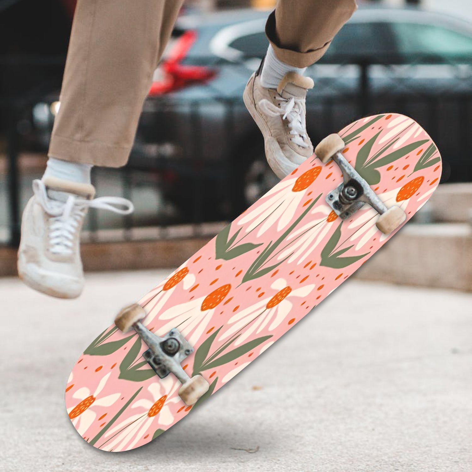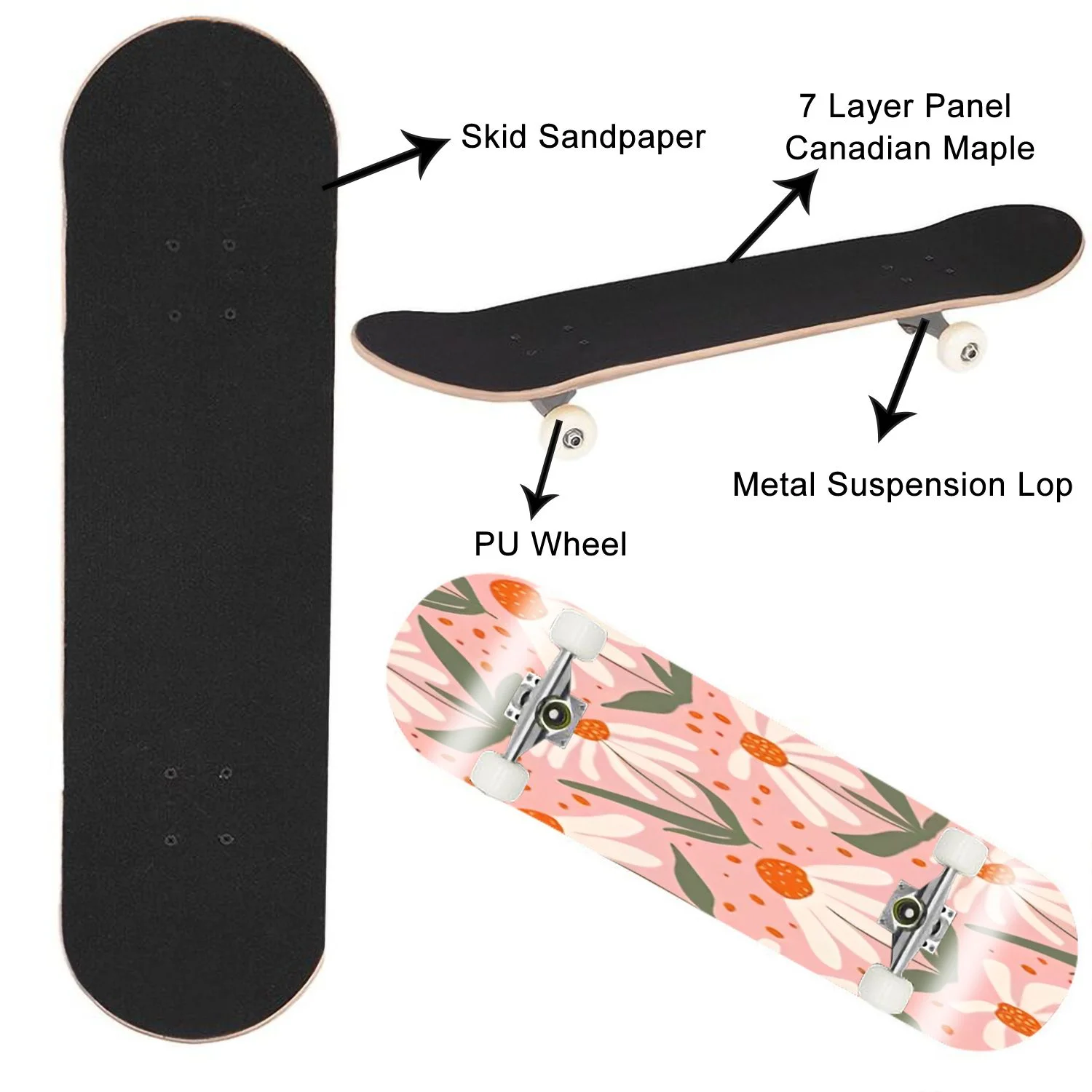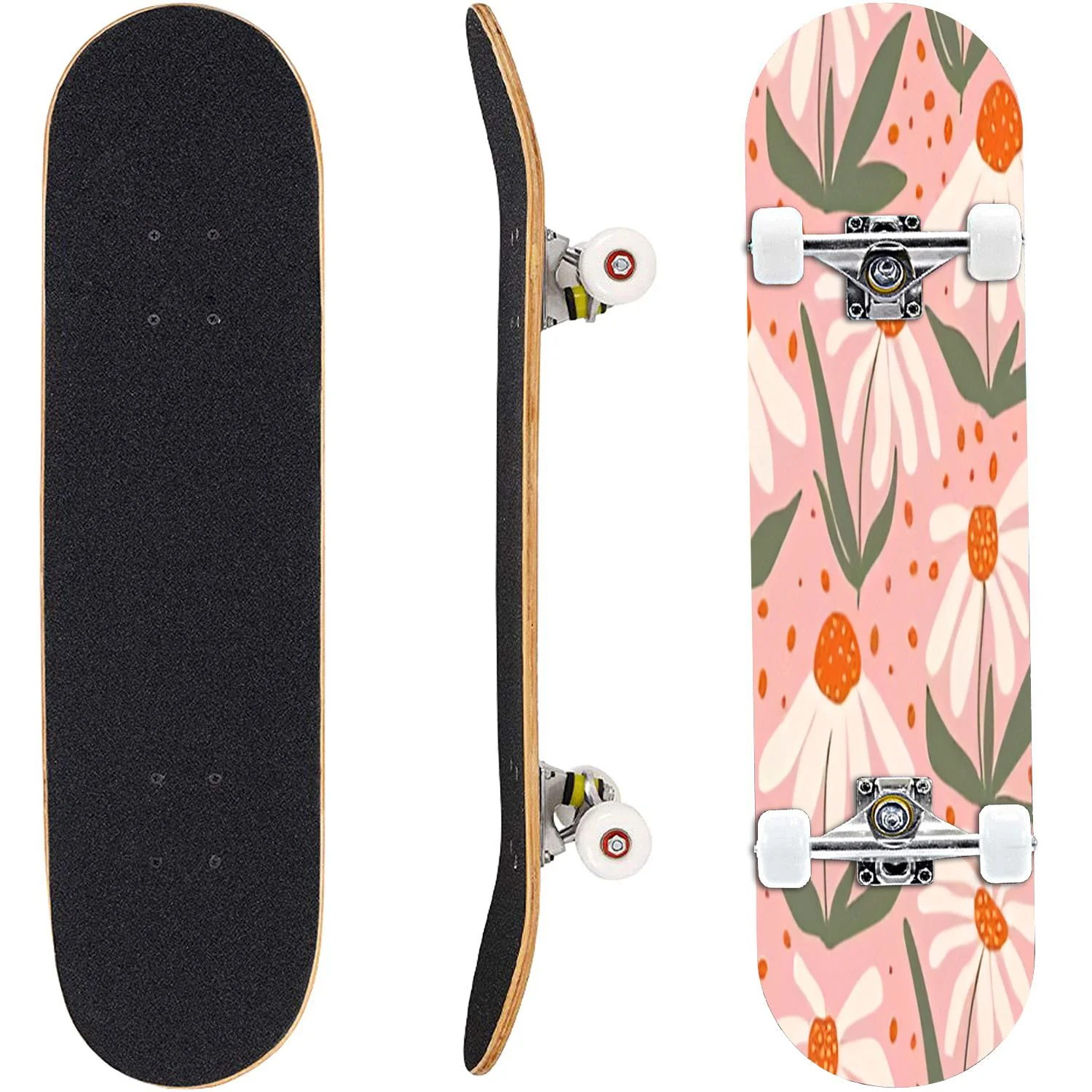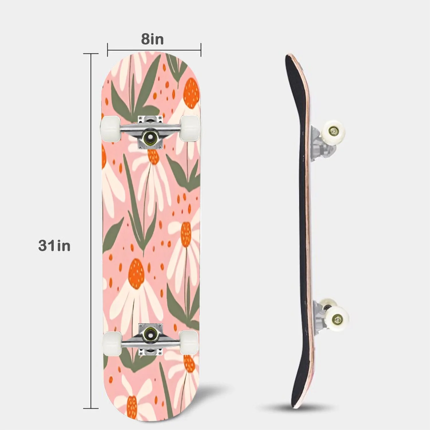 Skateboards for Beginners Doodle Seamless Pattern Hand Drawn White Daisies Pink Cute 31"x8" Maple Double Kick Concave Boards Complete Skateboards Outdoor for Adults Youths Kids Teens Gifts