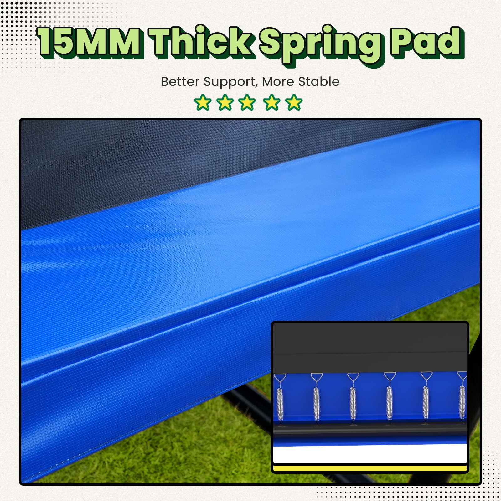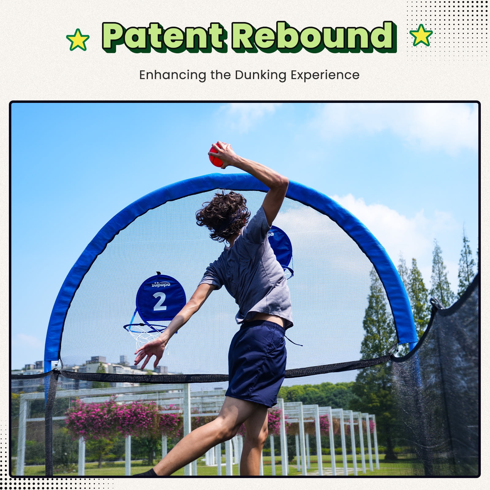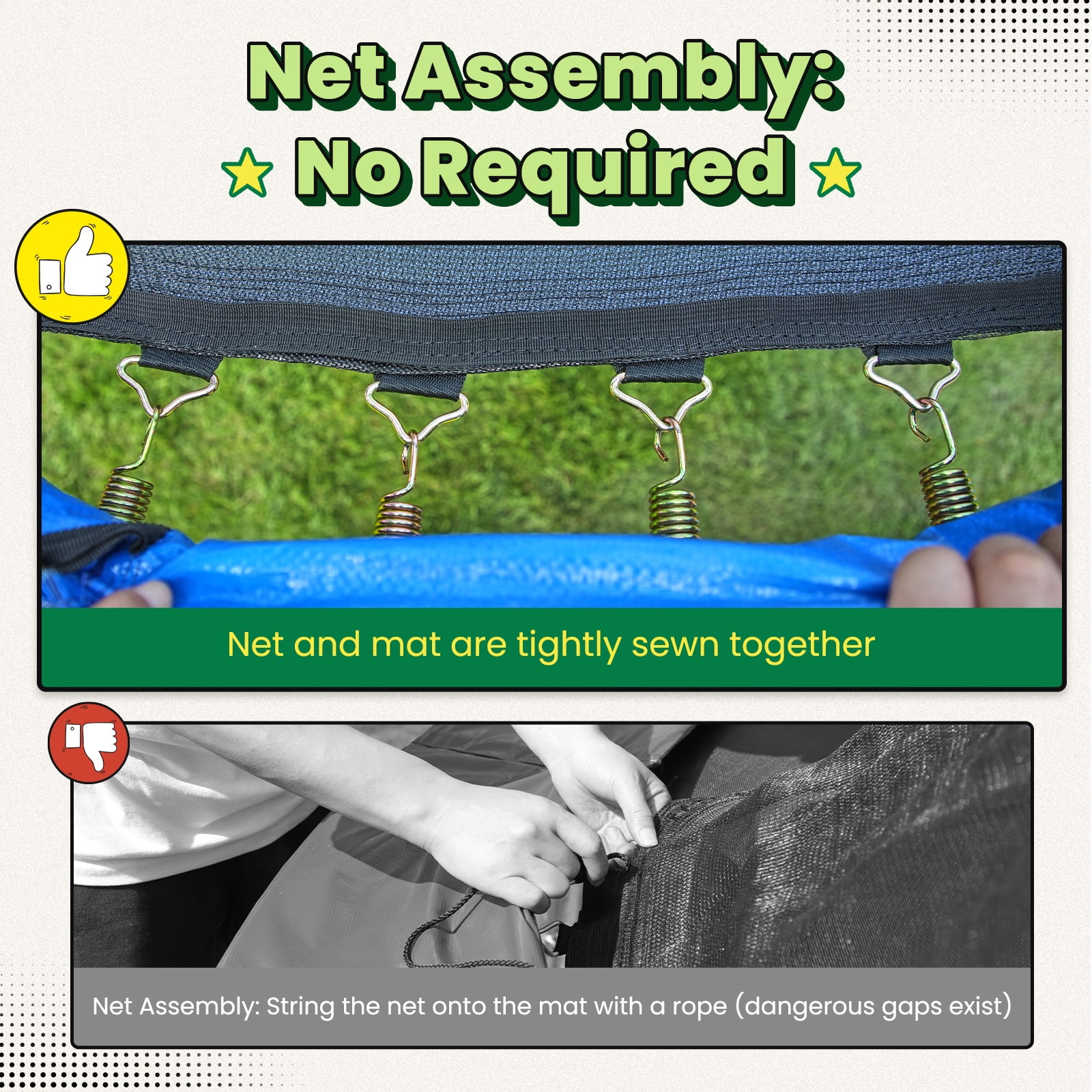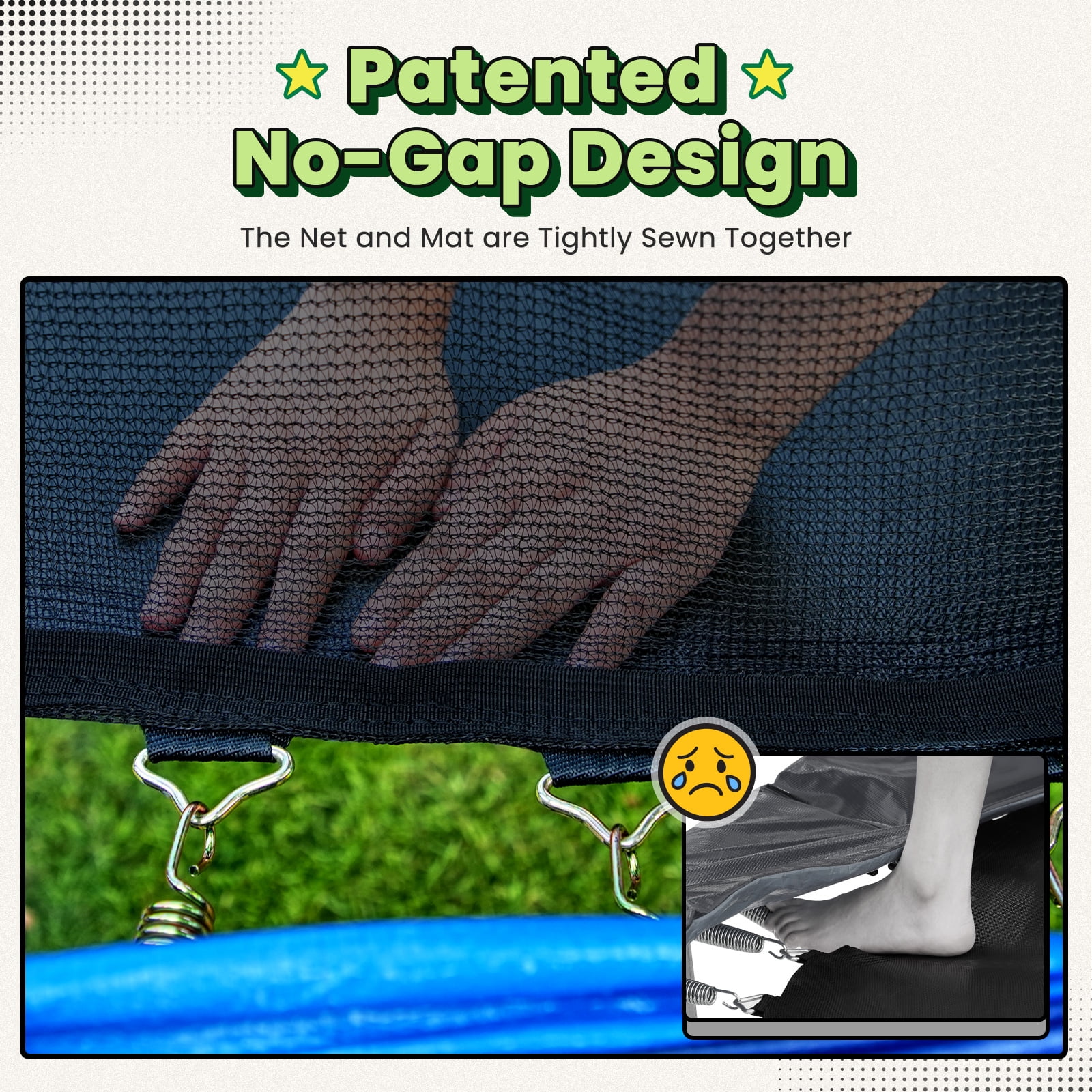 Featuring a patented No - Gap design (patent NO.: 2022230865778), the safety net is seamlessly sewn to the jumping mat. This eliminates dangerous gaps where hands or feet could get caught in the springs, allowing kids to perform gymnastic stunts like front flips and backflips with peace of mind. The hassle - free assembly also means no need for tedious net - securing ropes, saving you at least 30 minutes during setup. -