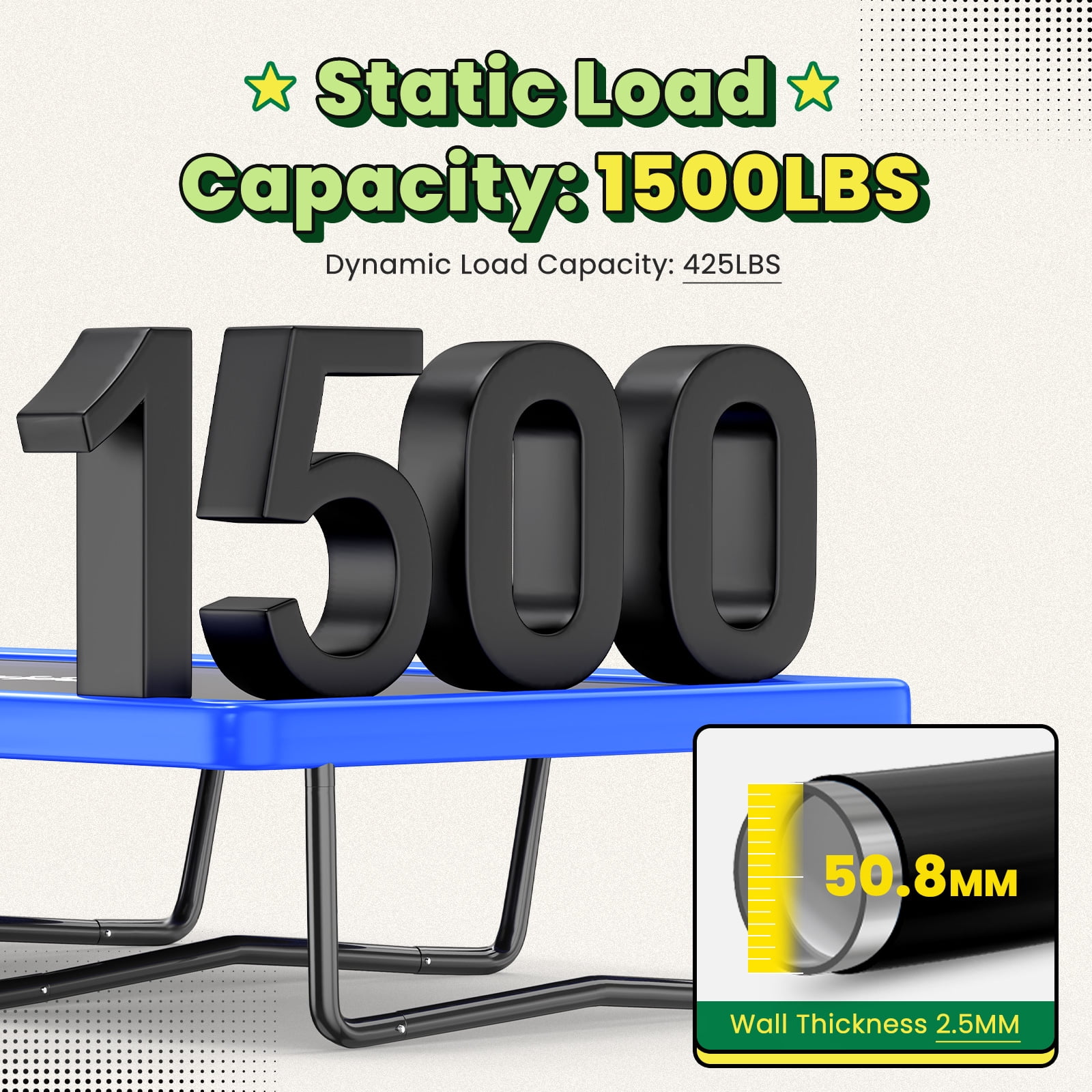 Built with top - tier Q195 steel, the trampoline has an incredibly strong and resilient frame. With a large 51mm diameter frame and a thick 2.5mm wall, it far surpasses the standard 42mm diameter and 1.5mm wall thickness. This results in an outstanding static load capacity of 1500LBS and a dynamic load capacity of 450LBS, making it suitable for a wide range of users. -