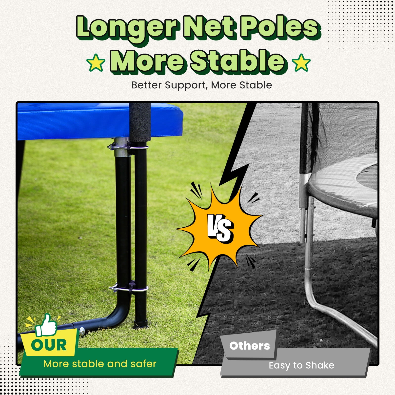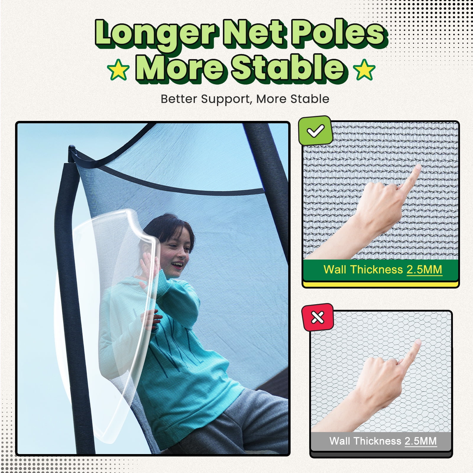 Prioritizing child safety, the trampoline is equipped with Longer netting poles that reach the ground at each corner. When combined with the densely woven PE enclosure net, it provides unparalleled security, giving families the confidence to bounce without worry. -