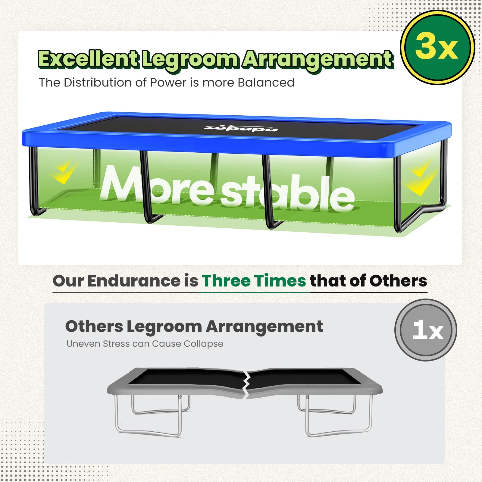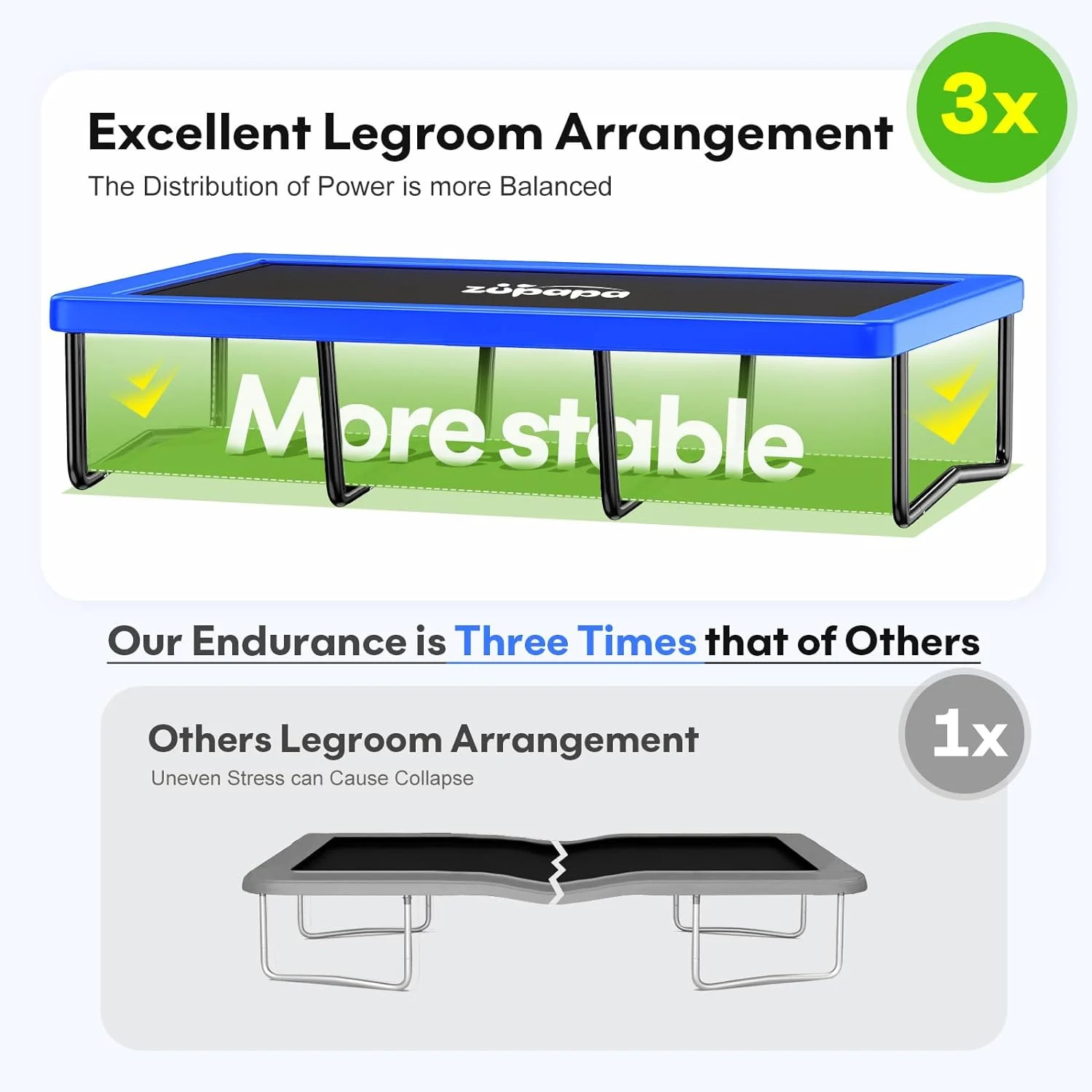 Our rectangular trampoline stands out with its revolutionary support system. Departing from the traditional four - corner foot structure, it uses four legs side by side. This innovative design ensures excellent middle support and stability across the entire jumping surface, effectively eliminating the risk of long sides caving in. -